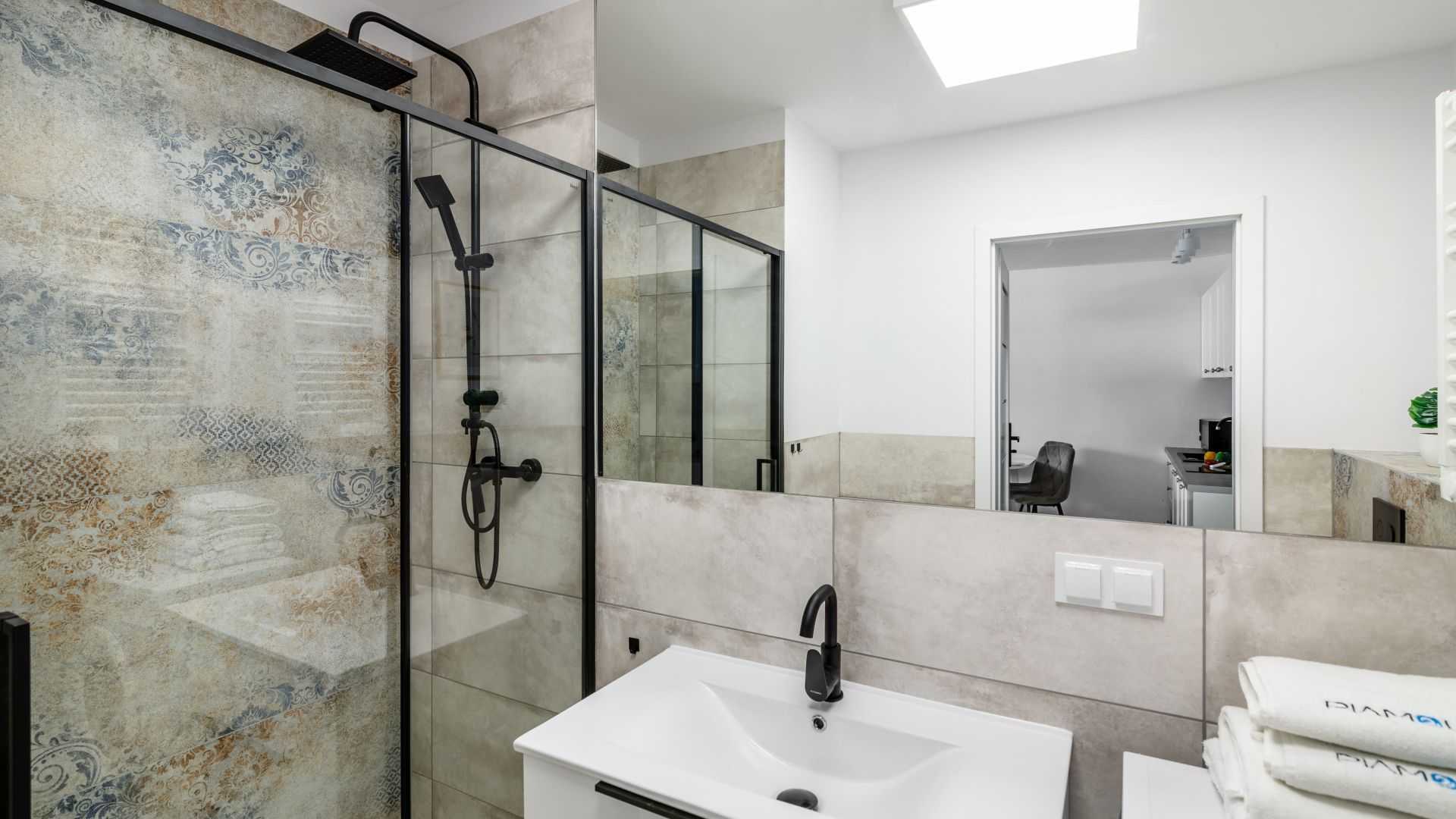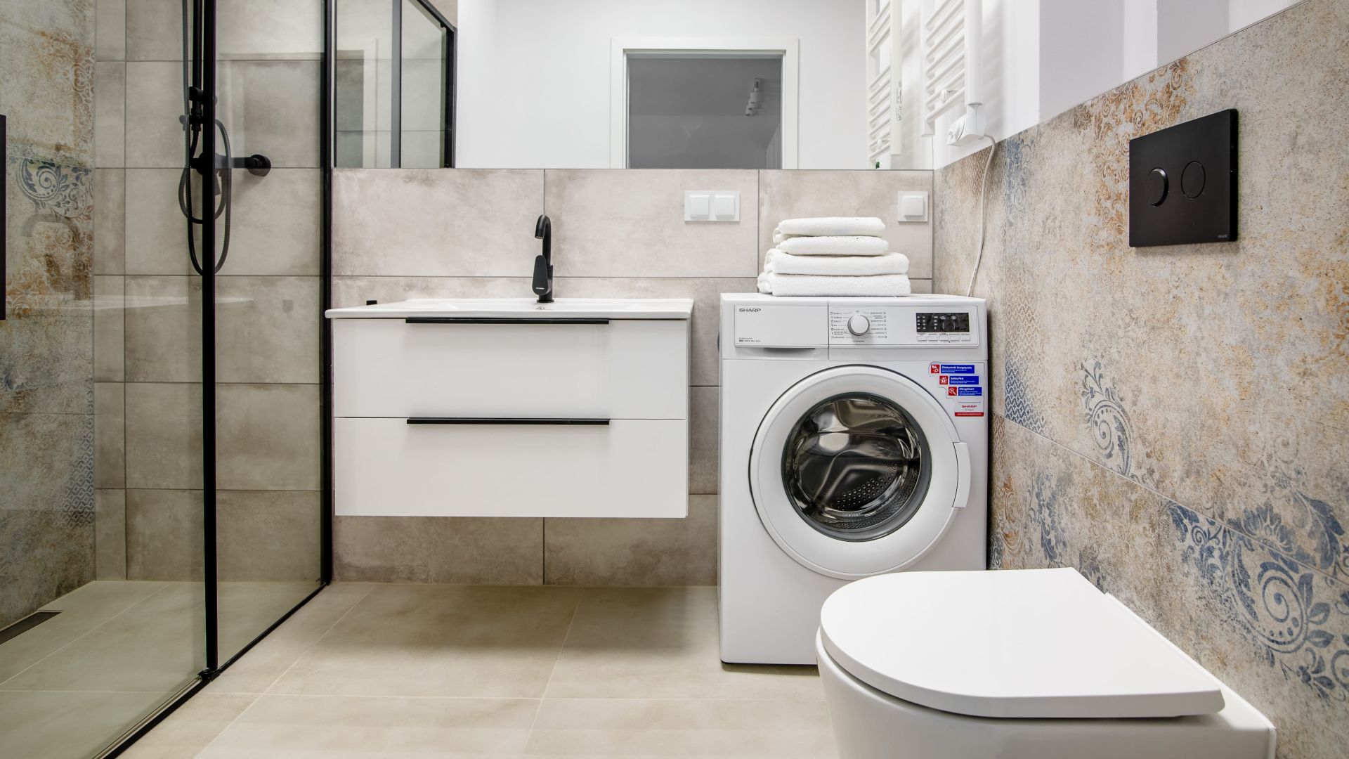Nowoczesna łazienka to przestrzeń, w której znajduje się kabina prysznicowa, suszarka do włosów oraz ręczniki, które zapewniamy dla naszych gości.