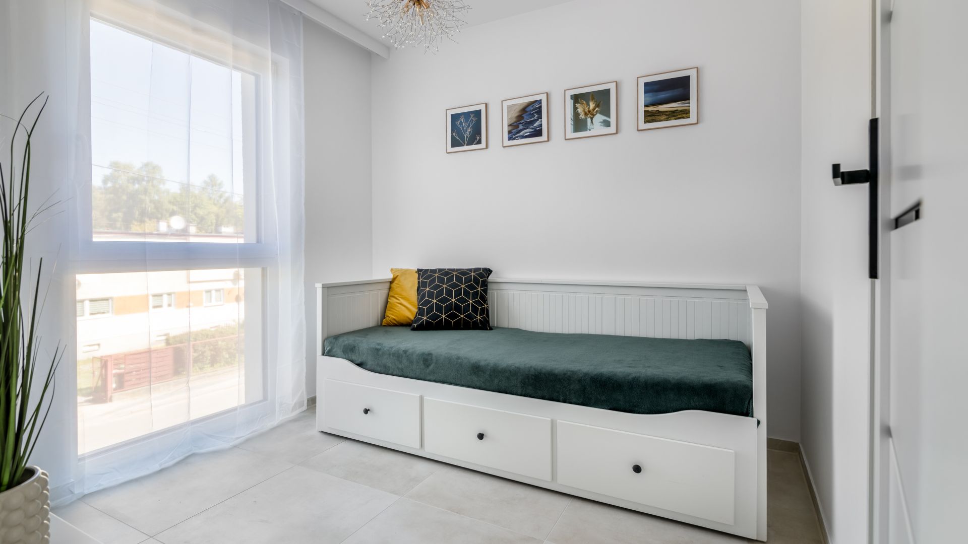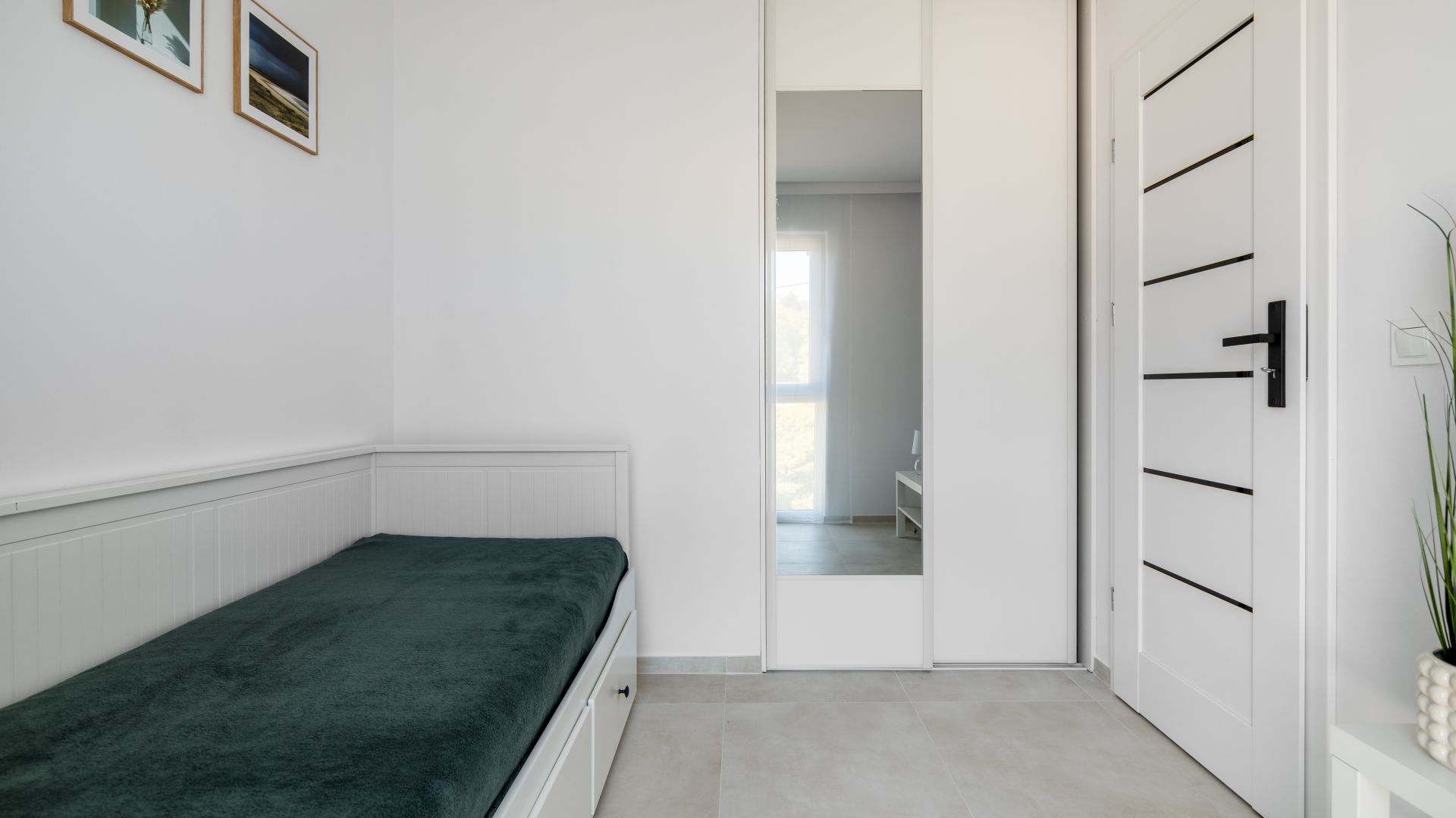 W sypialni znajdziemy duże, wygodne, rozkładane łózko oferujące komfort dla kolejnych dwóch osób. Obok łóżka stoi pojemna szafa, która pomieści wszystkie niezbędne rzeczy.
