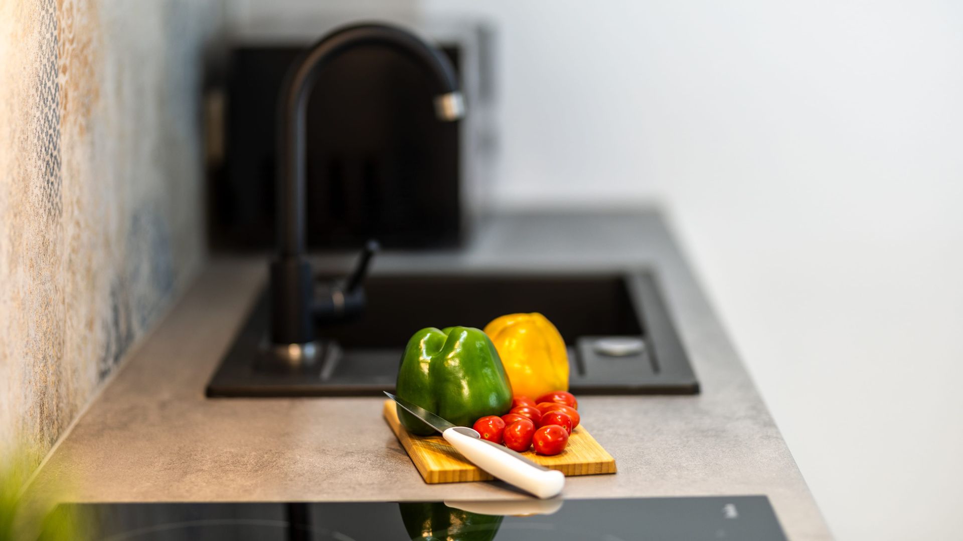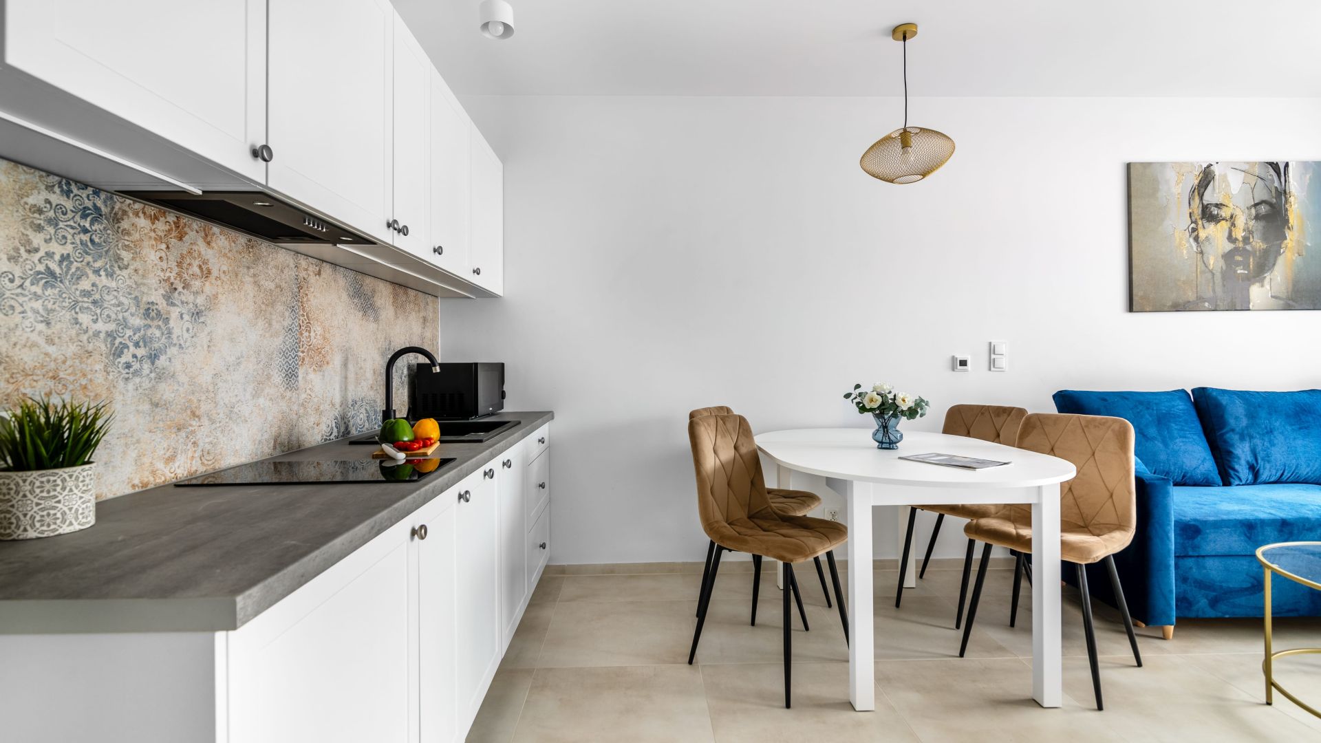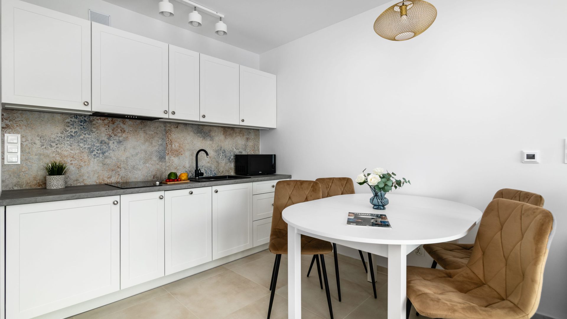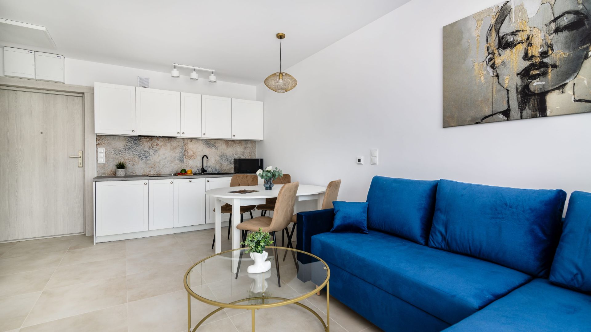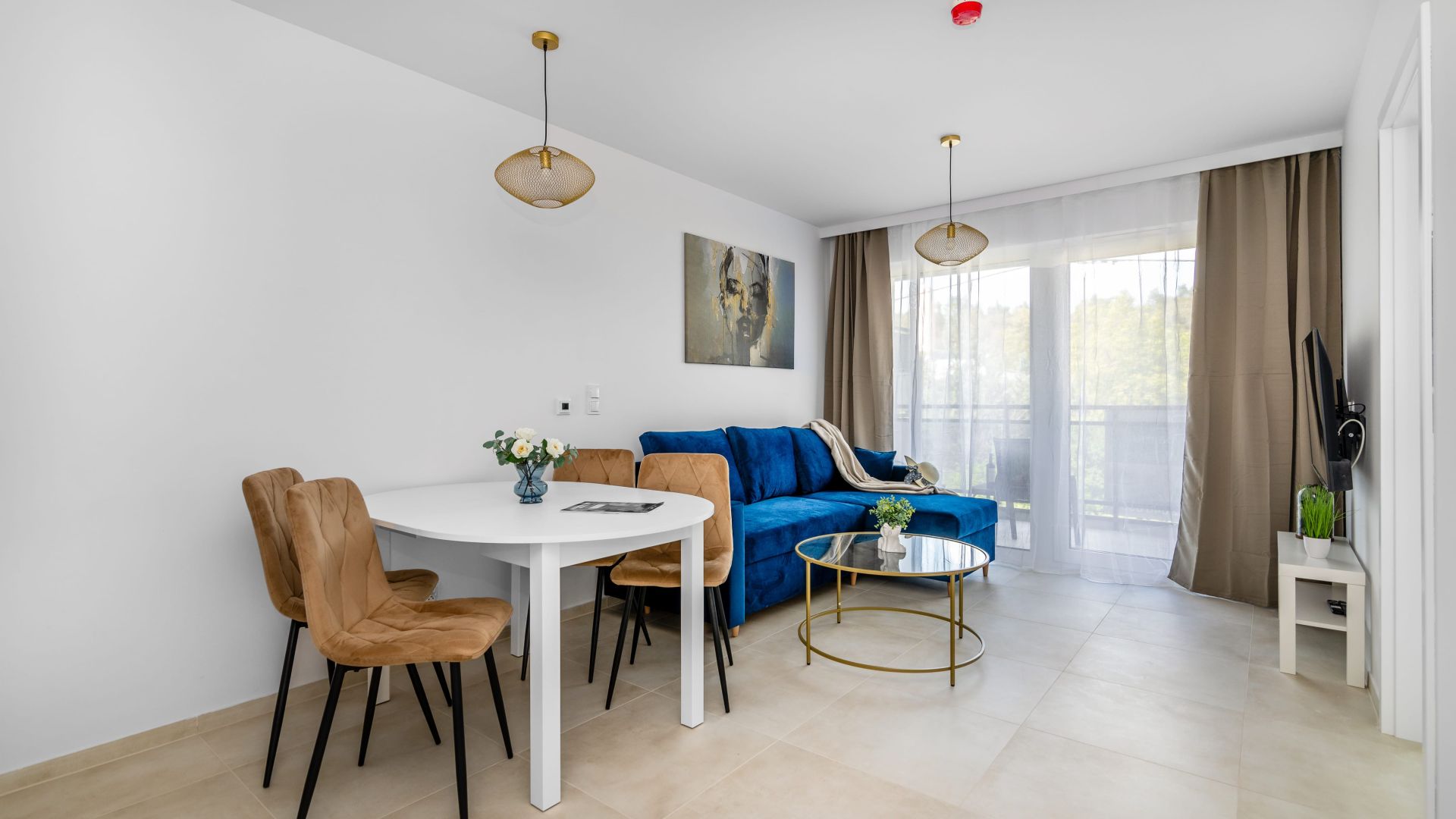Przestronny salon to serce apartamentu, gdzie znajduje się elegancka, rozkładana sofa, zapewniająca komfortowy sen dla dwóch osób. Naprzeciw sofy umieszczony jest nowoczesny telewizor, idealny do wieczornego relaksu po dniu pełnym wrażeń. Aneks kuchenny wyposażony jest w najnowsze urządzenia, takie jak lodówka, zmywarka, mikrofalówka i czajnik, a także w pełen zestaw akcesoriów kuchennych, które ułatwią przygotowanie ulubionych potraw. Obok aneksu kuchennego znajduje się jadalnia ze stołem i wygodnymi krzesłami, gdzie można delektować się posiłkami.