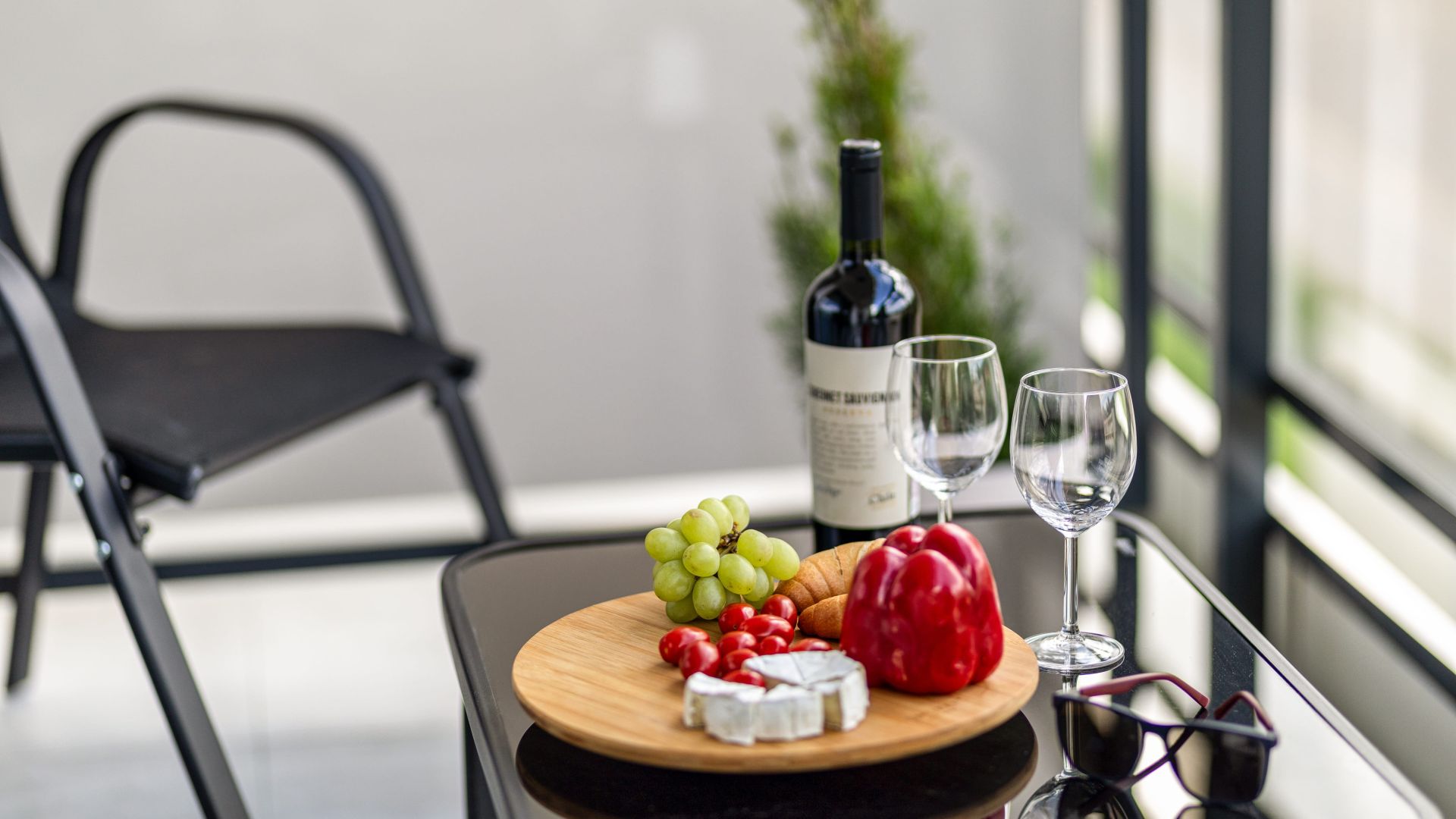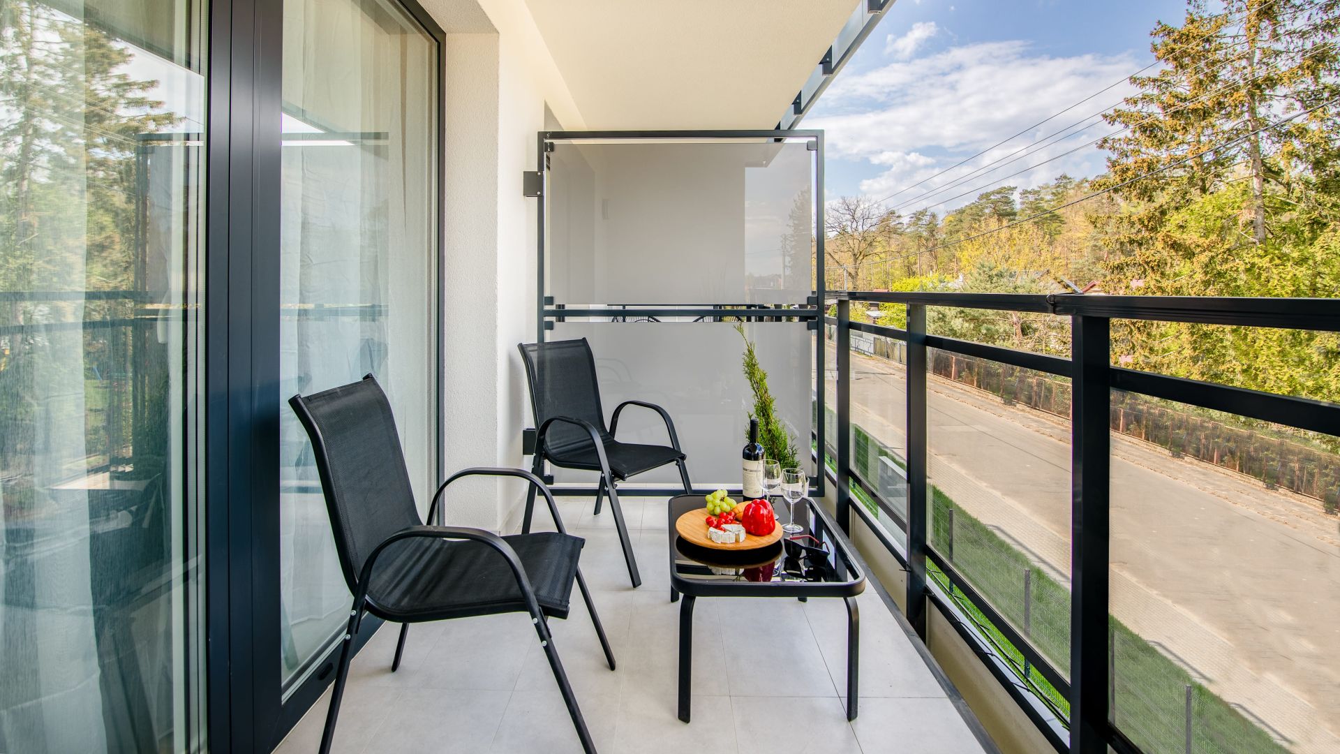 Z salonu jest wyjście na przestronny balkon, na którym znajdują się meble ogrodowe – idealne do wypicia porannej kawy w promieniach słońca lub wieczornego wina pod gwiaździstym niebem.
