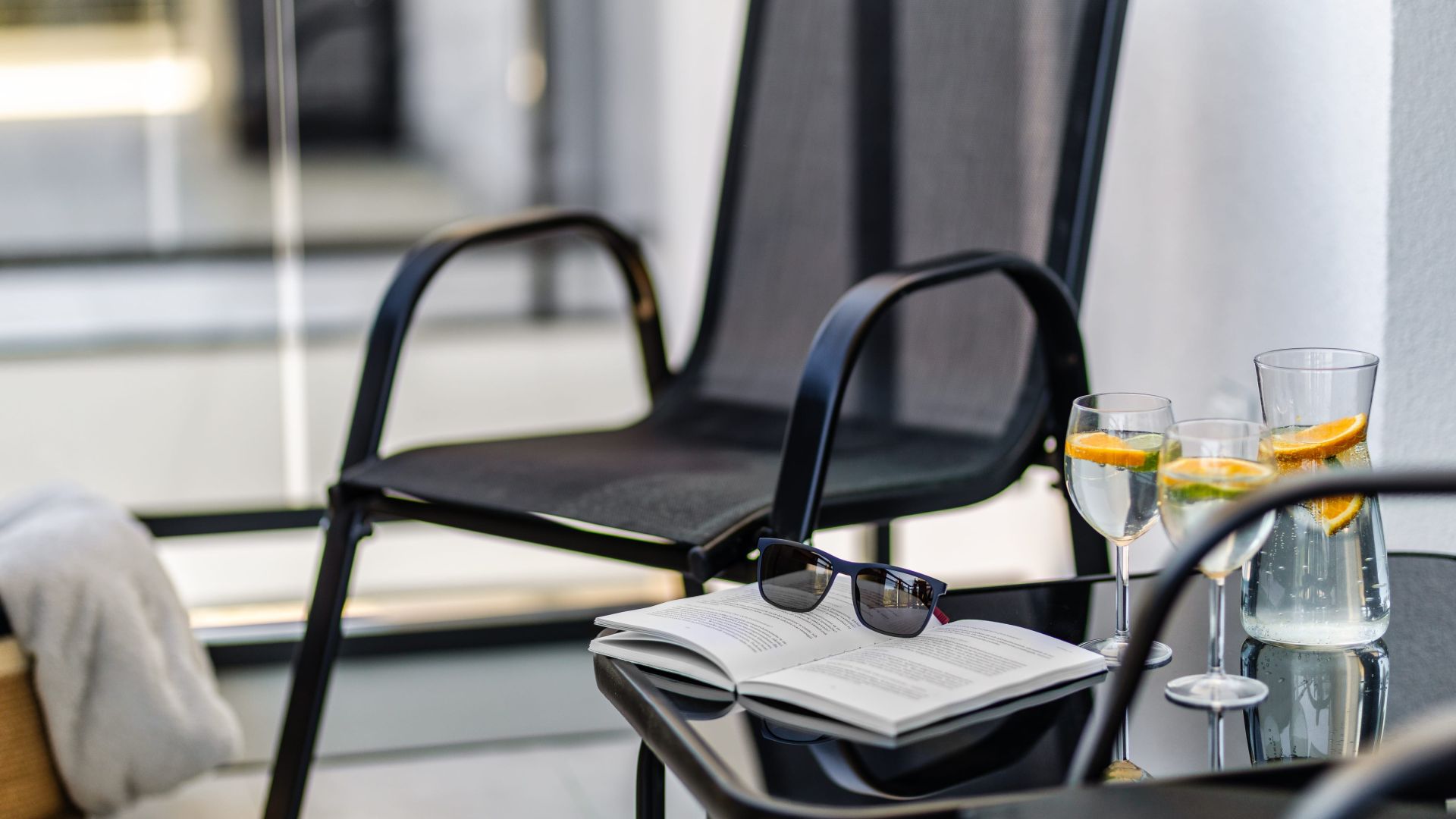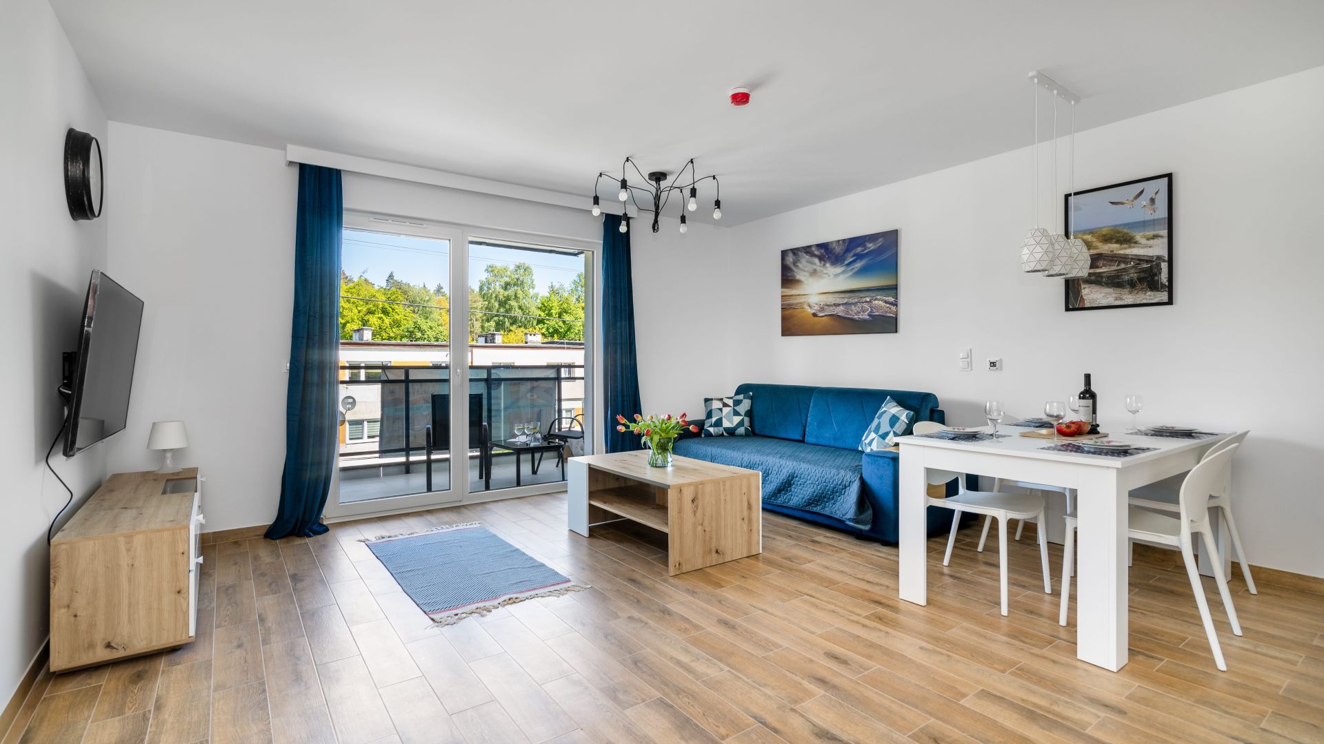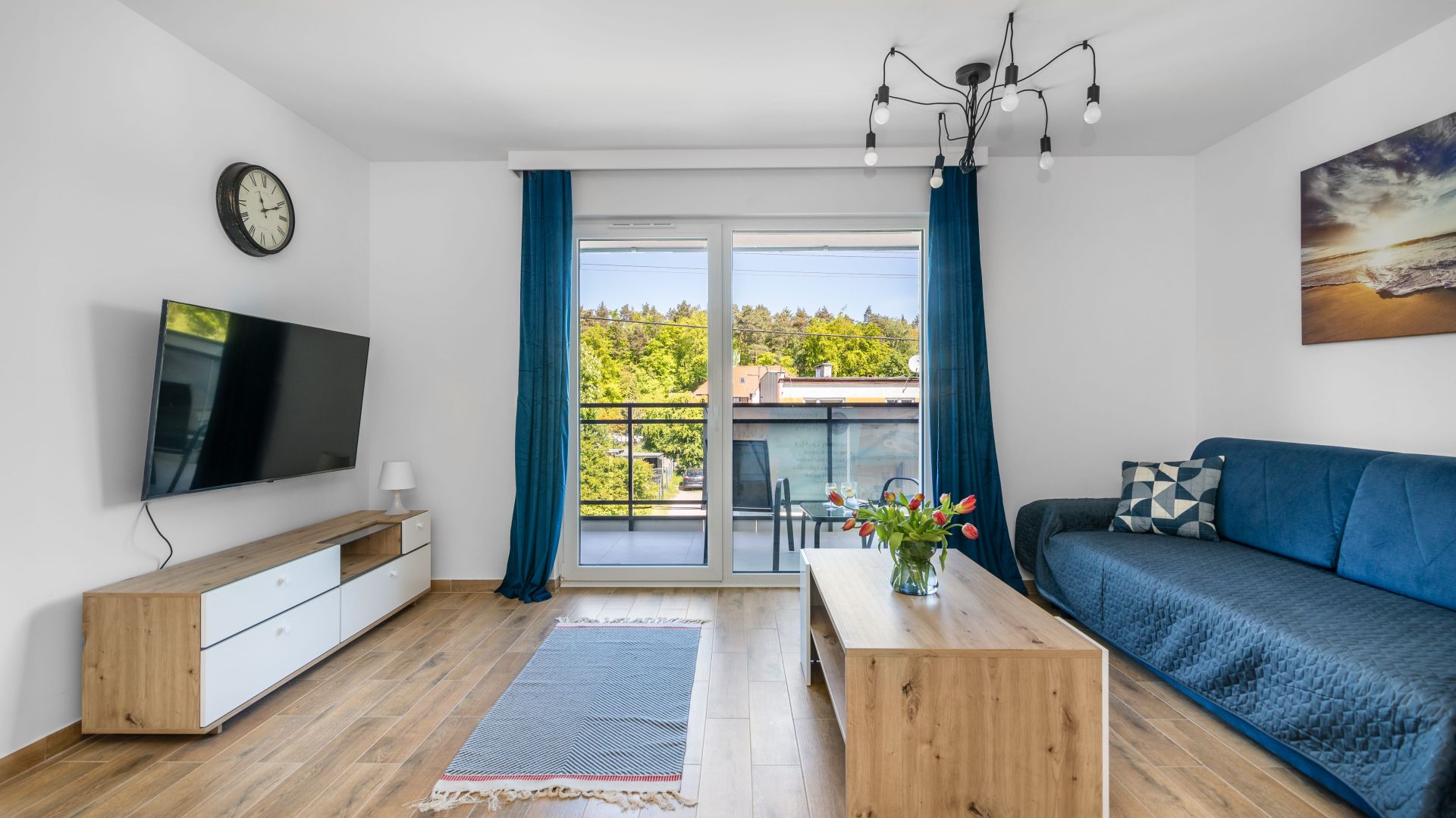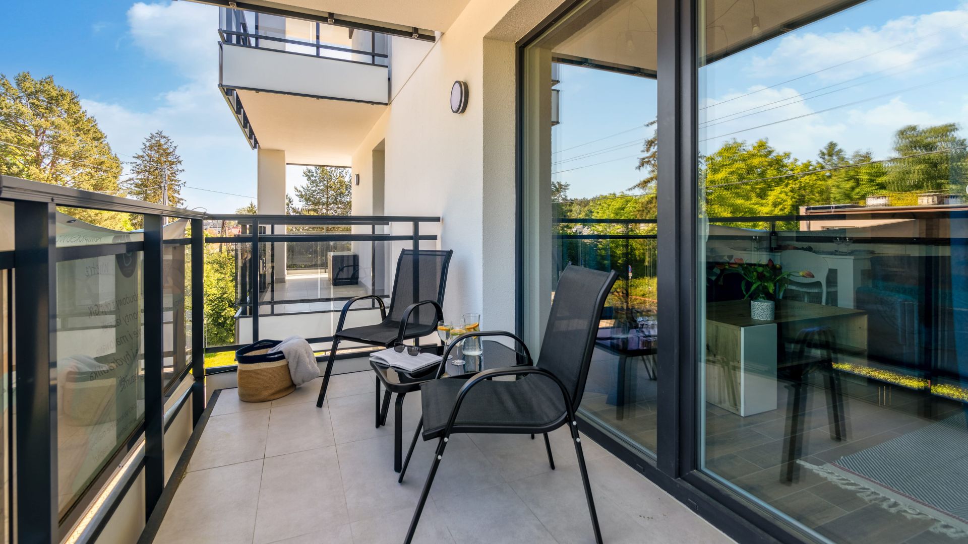 Z salonu można wyjść na balkon, na którym znajdują się meble ogrodowe - idealne miejsce na poranną kawę lub wieczorny relaks.