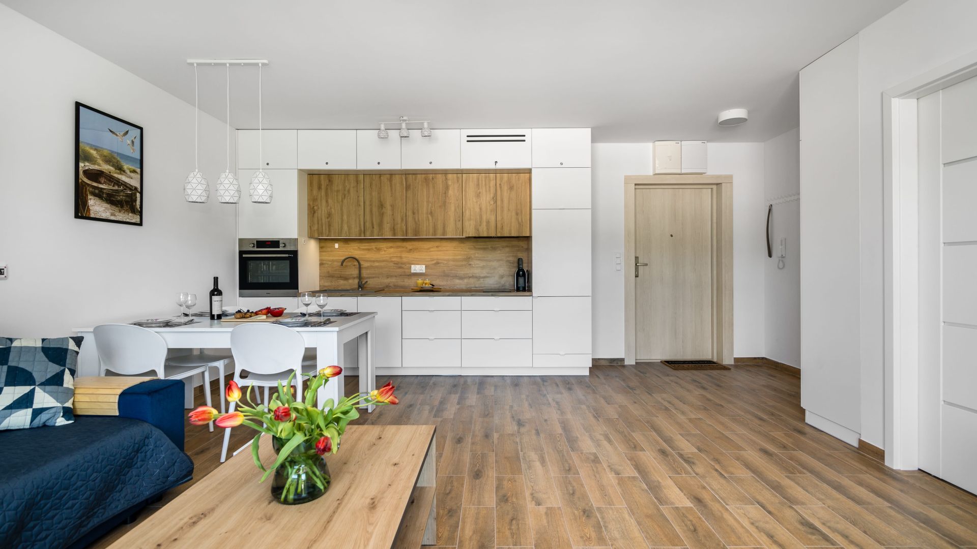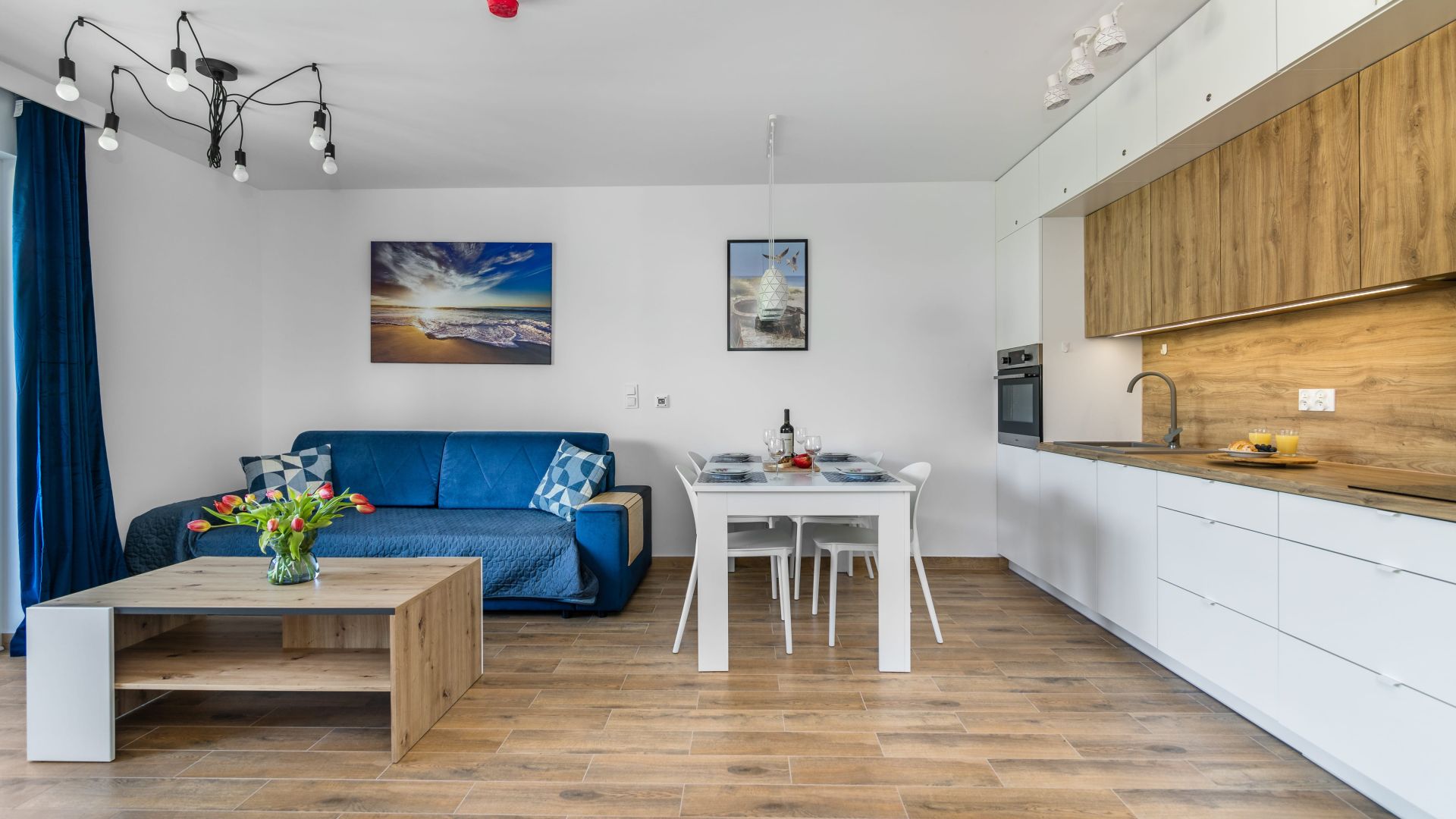 Głównym pomieszczeniem jest przestronny salon połączony z aneksem kuchennym. Aneks kuchenny jest wyposażony we wszystko, co niezbędne do przygotowania posiłków: czajnik, lodówkę, ekspres do kawy, zmywarkę, mikrofalówkę i piekarnik. W salonie znajduje się wygodna, rozkładana sofa, która pomieści dwie osoby. Jest także telewizor do relaksu po dniu pełnym atrakcji.