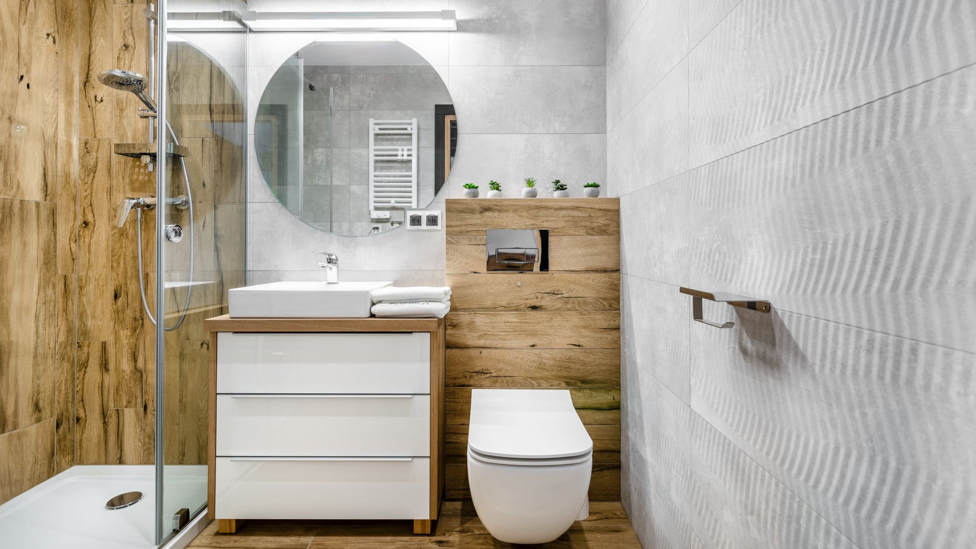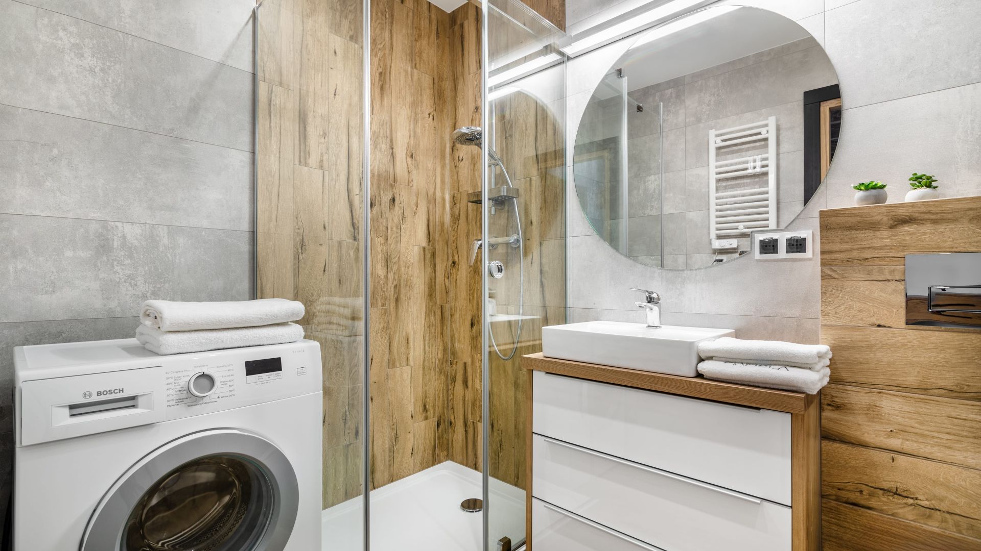 Łazienka jest funkcjonalna i nowoczesna - wyposażona w kabinę prysznicową, pralkę oraz suszarkę do włosów.