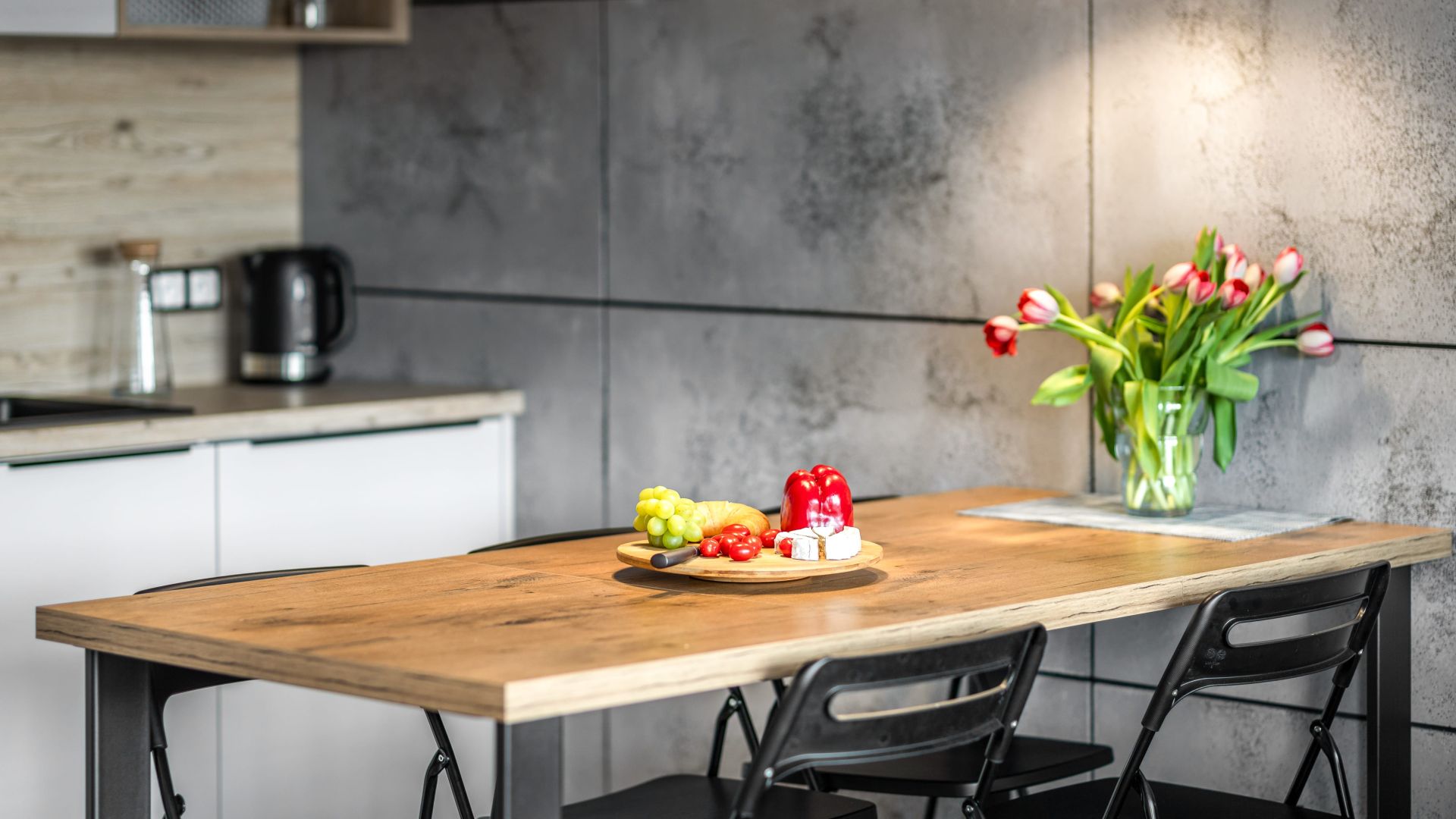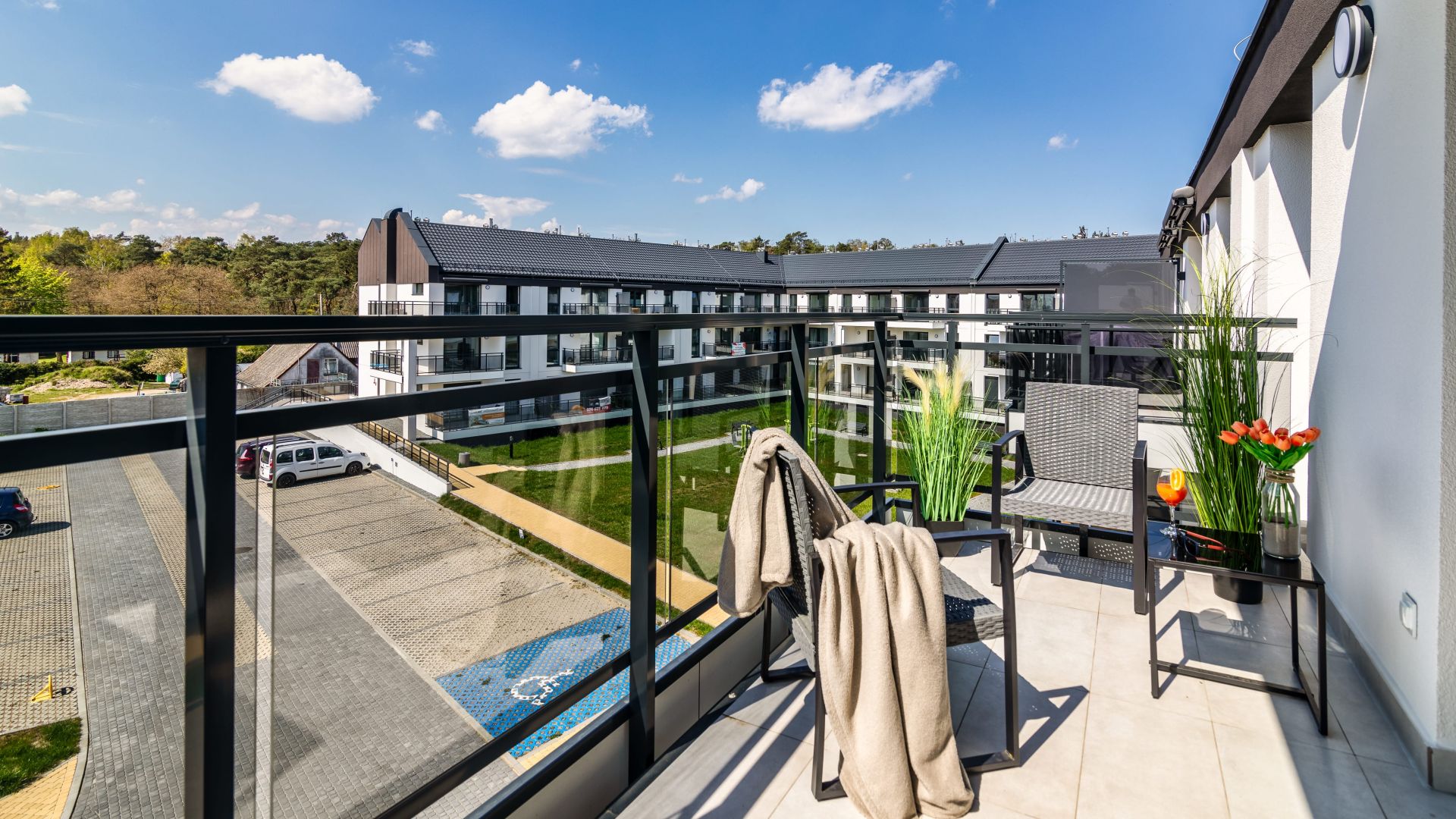 Salon jest wyposażony w wygodną, rozkładaną sofę narożną, która może służyć jako miejsce do spania dla dwóch osób. Do dyspozycji gości jest również telewizor. Z salonu można wyjść na balkon, który został wyposażony w meble ogrodowe - idealne miejsce na poranną kawę czy wieczorny relaks. Apartament posiada również część jadalną, która z pewnością umili spożywanie smacznych posiłków.