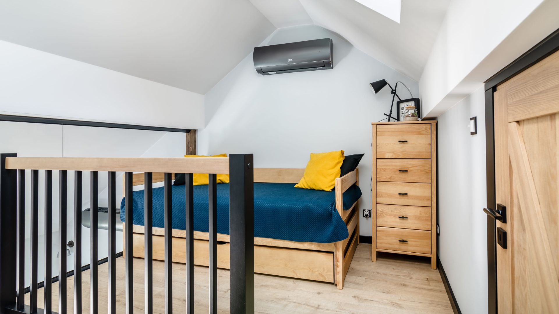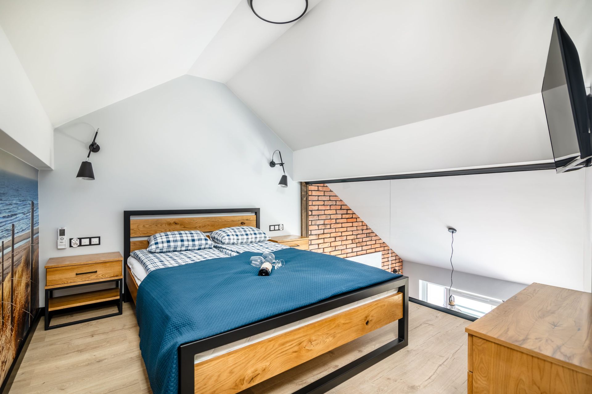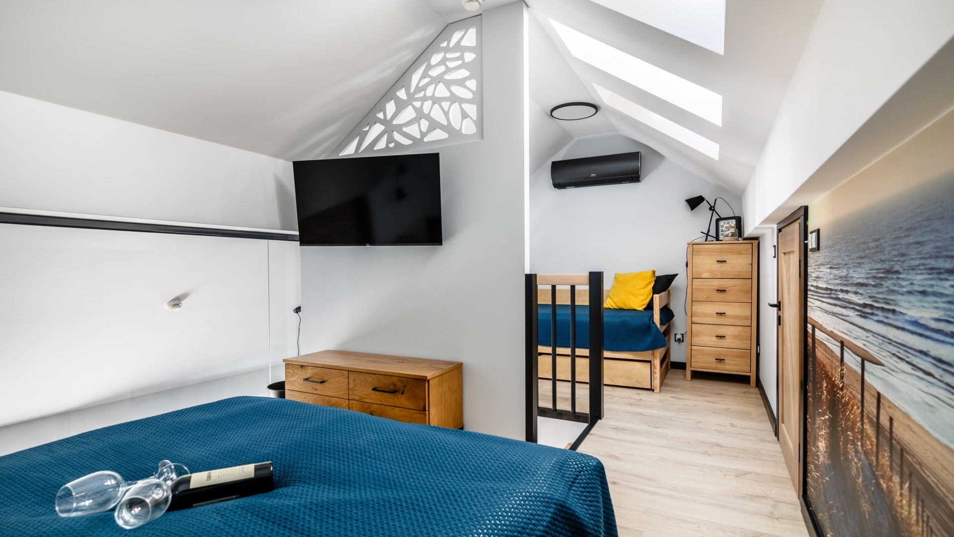 Na antresoli znajduje się sypialnia z łóżkiem małżeńskim, drugim telewizorem oraz dodatkowym łóżkiem dwuosobowym. To spokojne miejsce, które zapewni komfortowy sen.