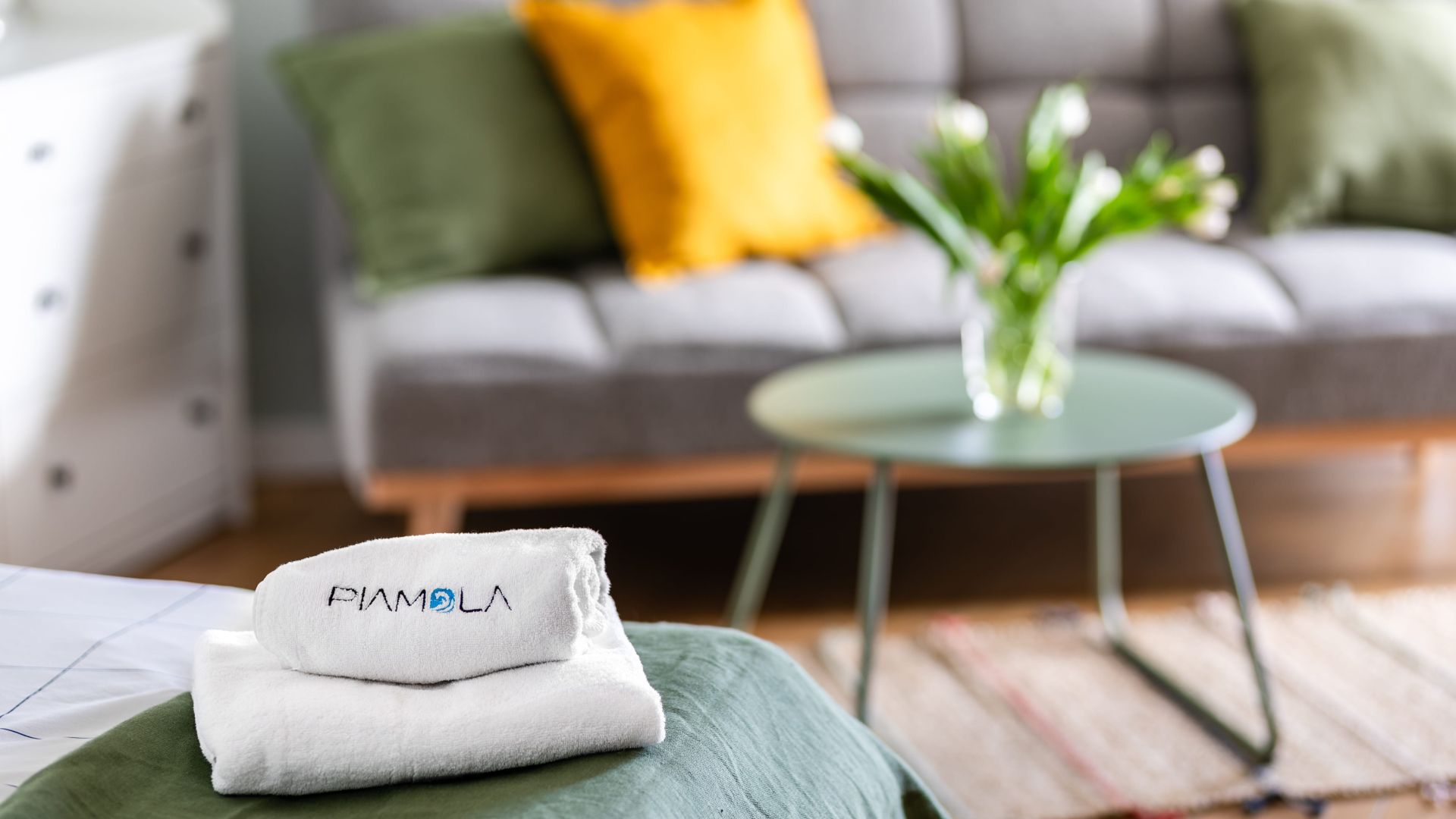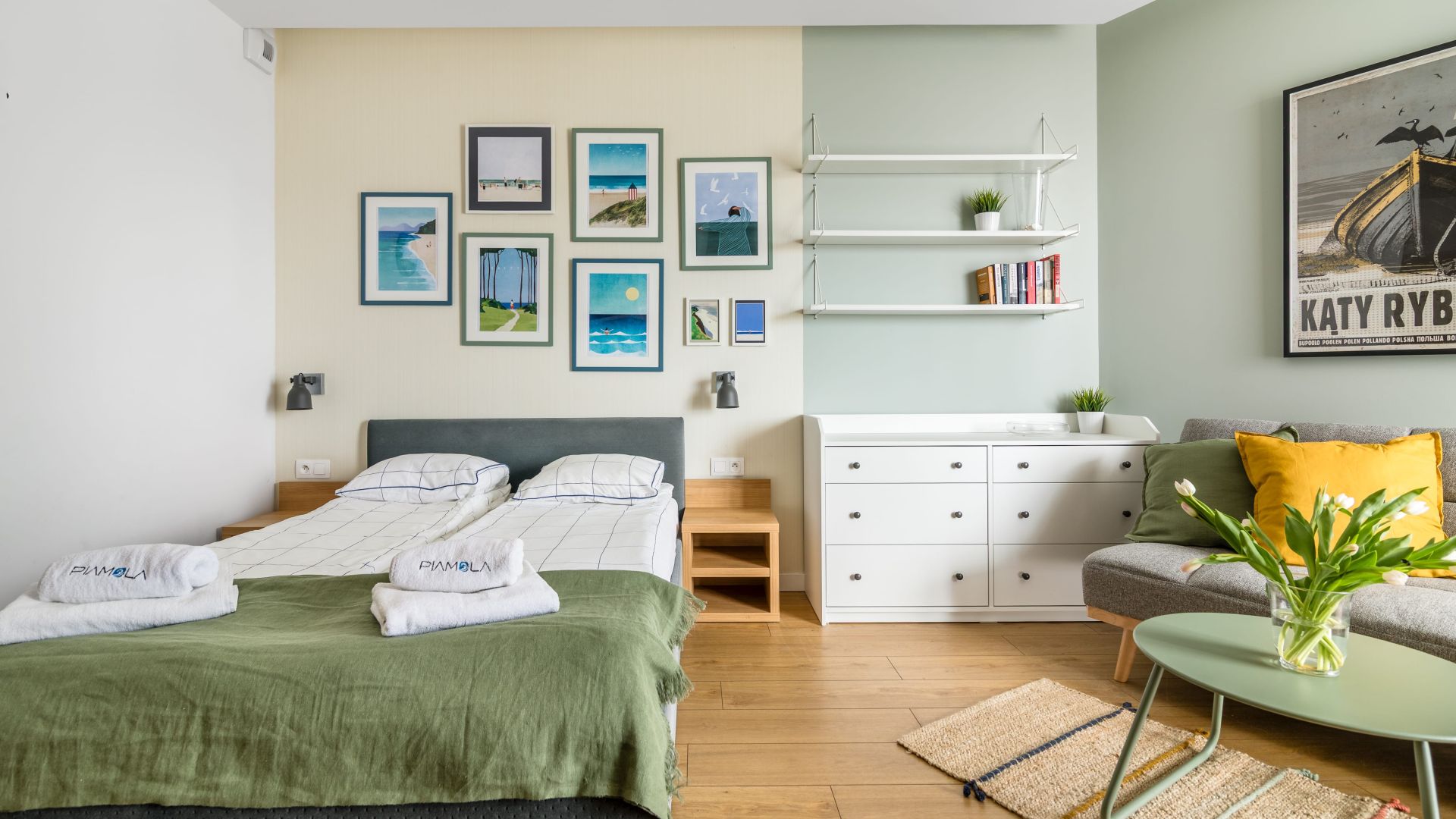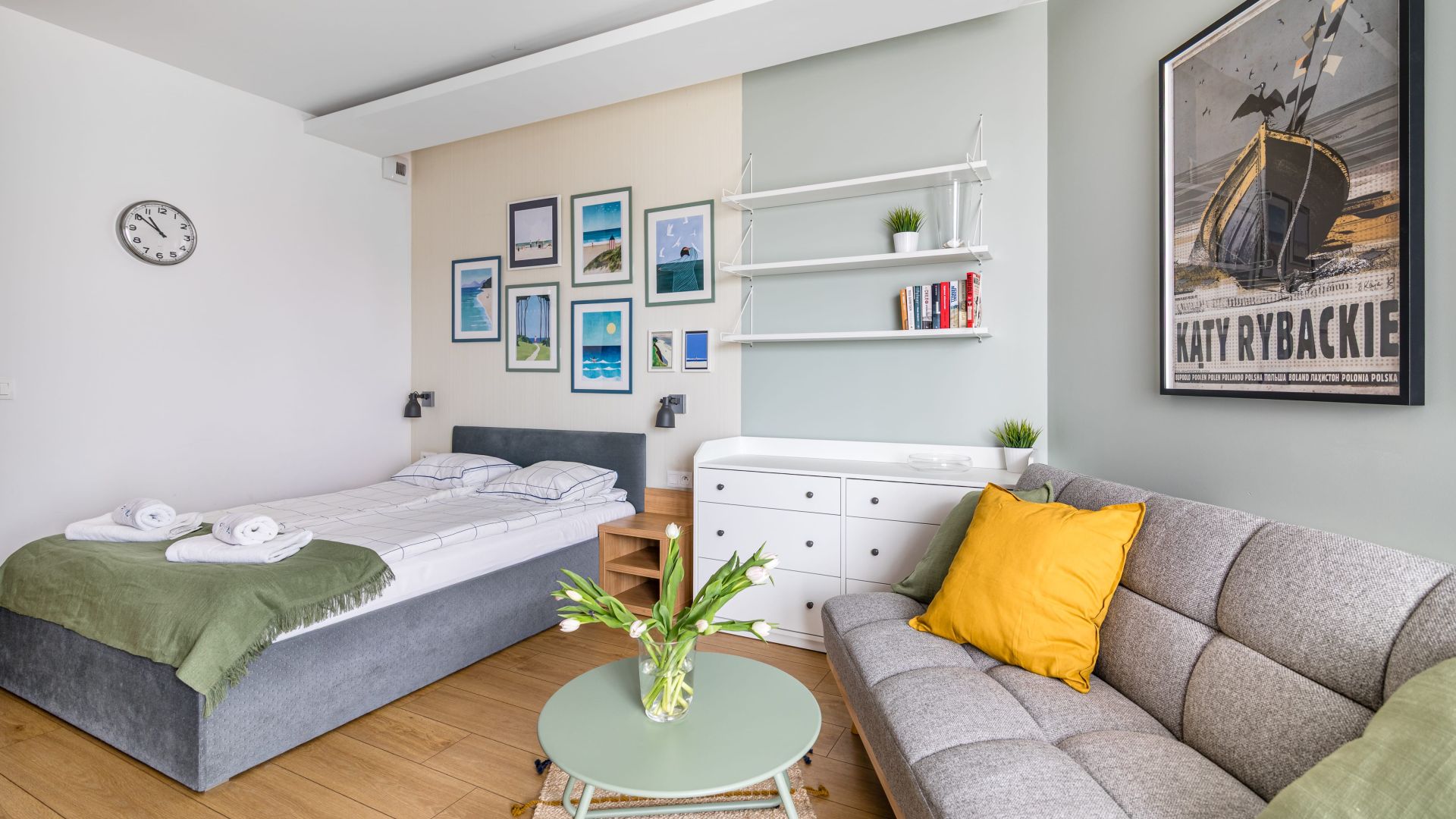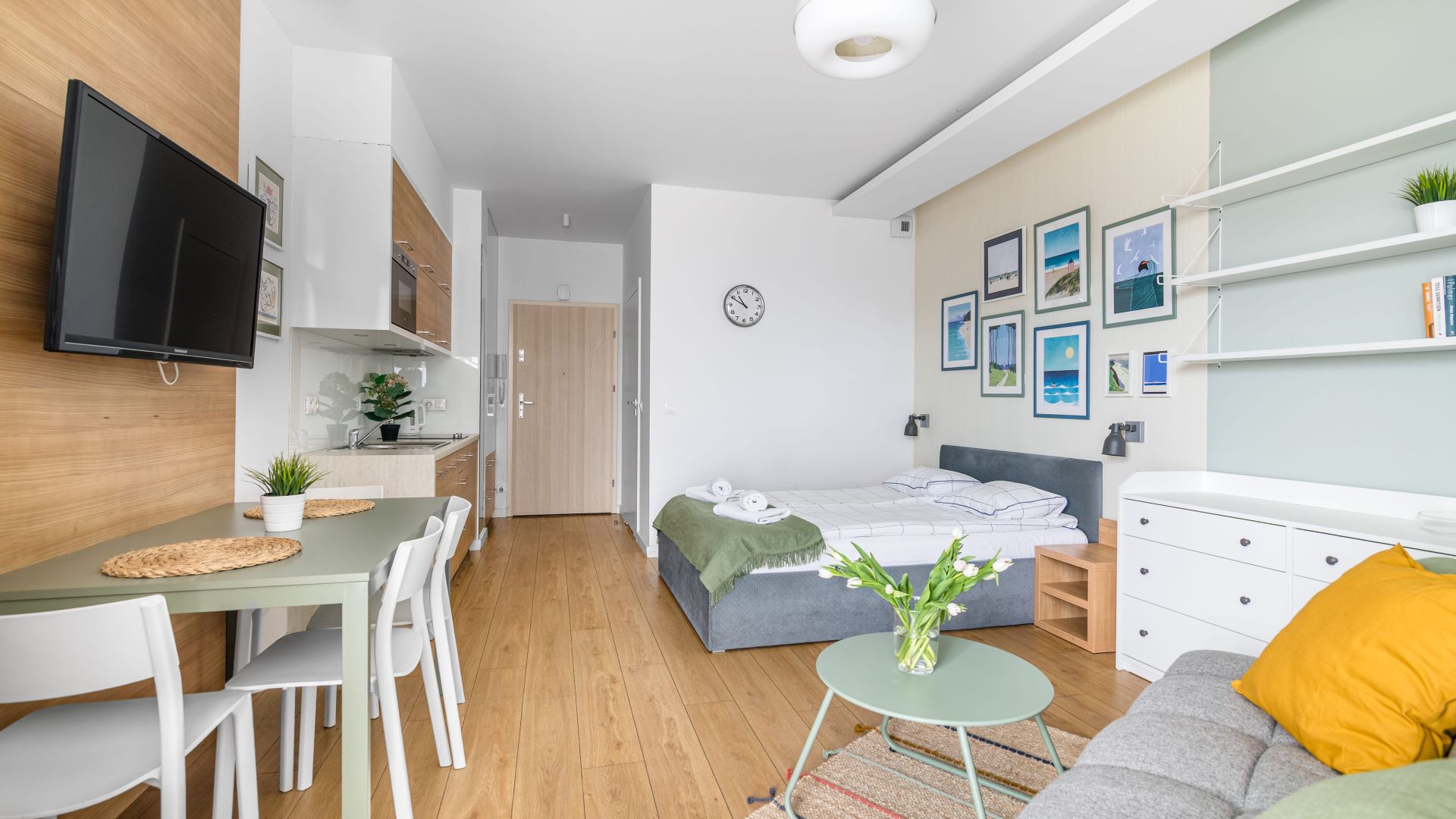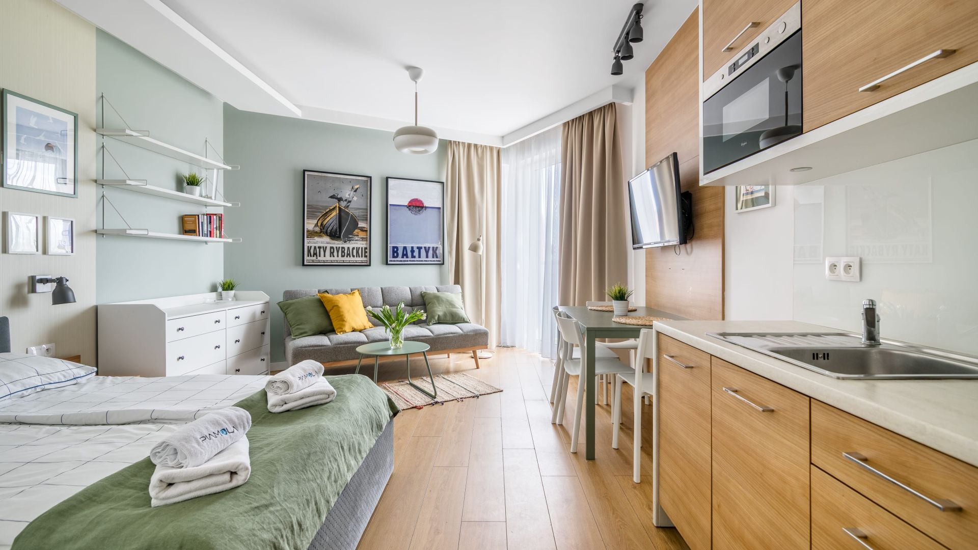 Wnętrze apartamentu obejmuje przytulny salon z aneksem kuchennym, w którym znajduje się zmywarka, mikrofalówka, czajnik oraz lodówka. Do dyspozycji gości jest łóżko małżeńskie oraz rozkładana sofa, która może pomieścić dodatkowe dwie osoby. W salonie znajduje się również telewizor, zapewniający rozrywkę w wolnych chwilach.