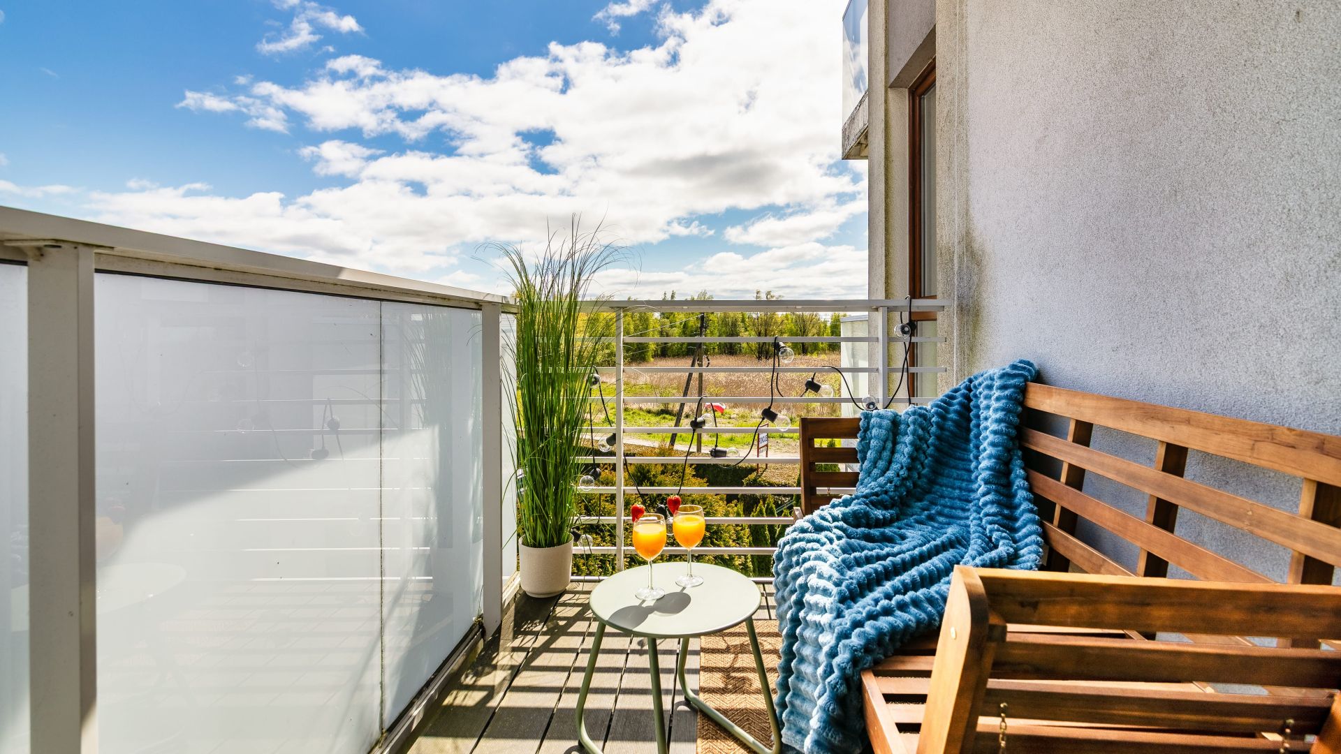 Balkon z widokiem na Zalew Wiślany to doskonałe miejsce na relaks – zarówno o poranku, jak i wieczorem.