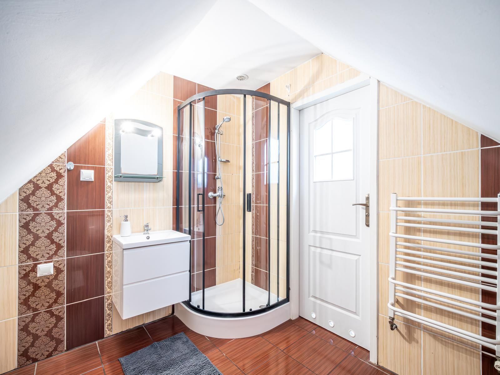 Prywatna łazienka wyposażona jest w prysznic, suszarkę do włosów oraz ręczniki, zapewniając pełen komfort podczas pobytu.