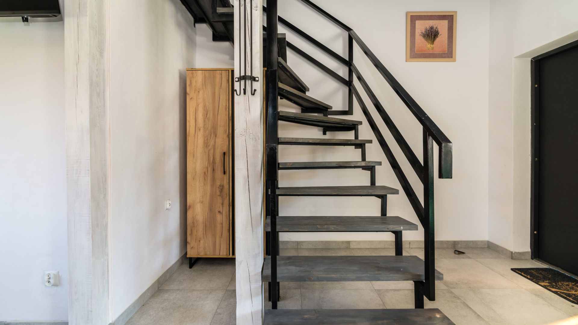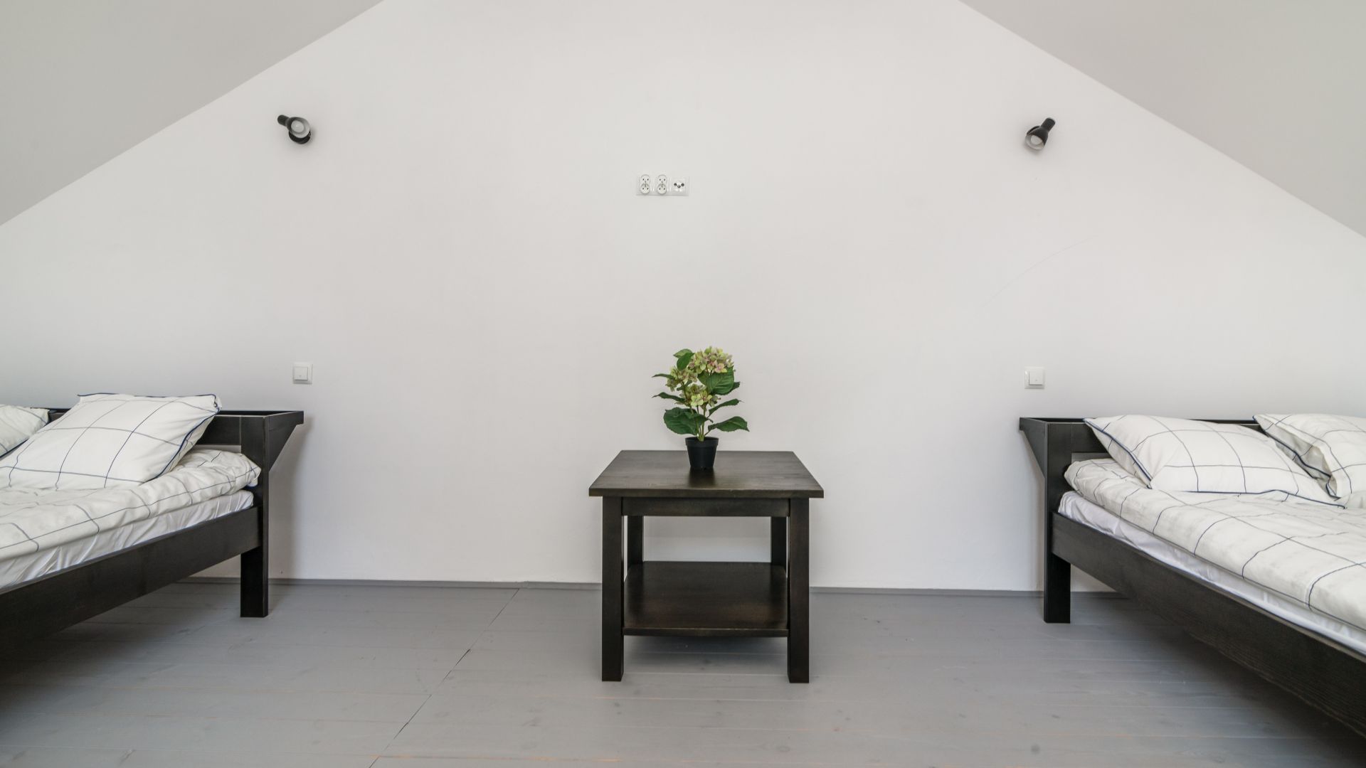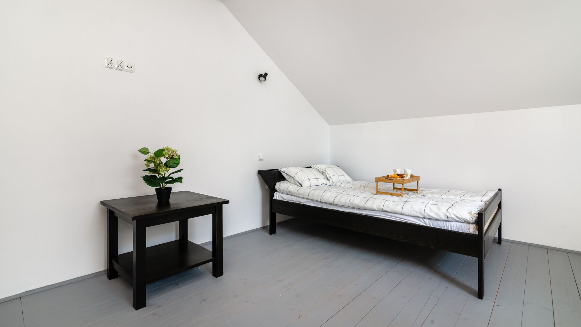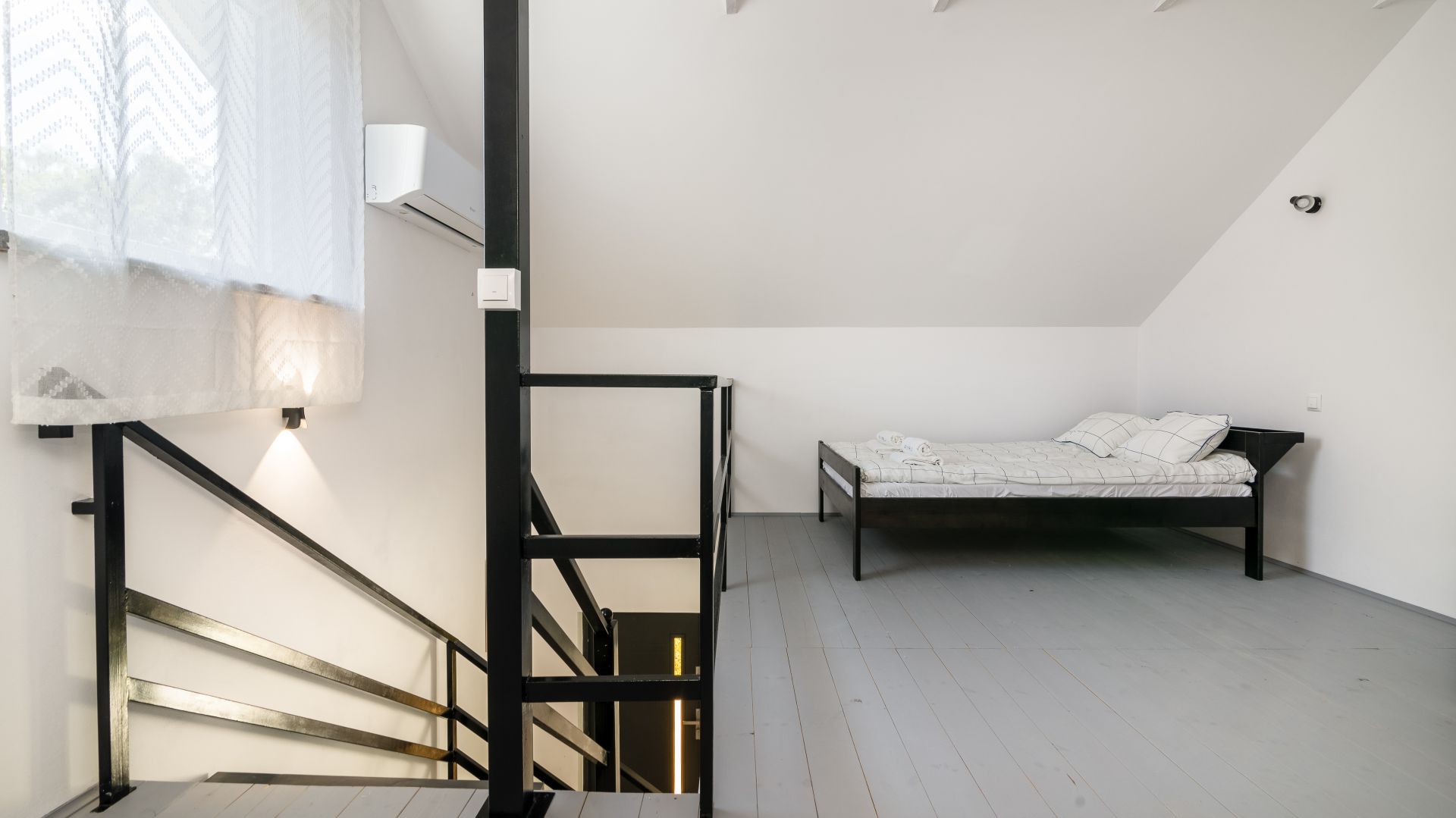 Na piętrze znajduje się sypialnia z łóżkiem małżeńskim i jednym łóżkiem jednoosobowym. To ciche i spokojne miejsce, idealne do odpoczynku po dniu spędzonym na plaży.