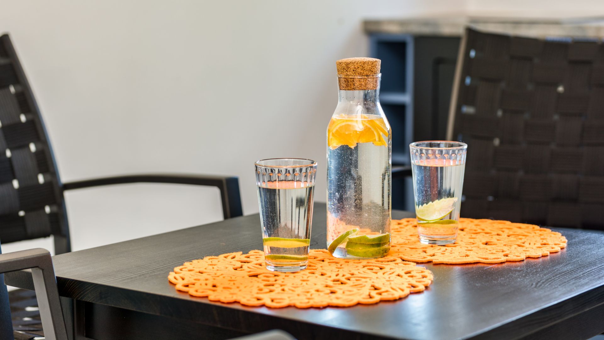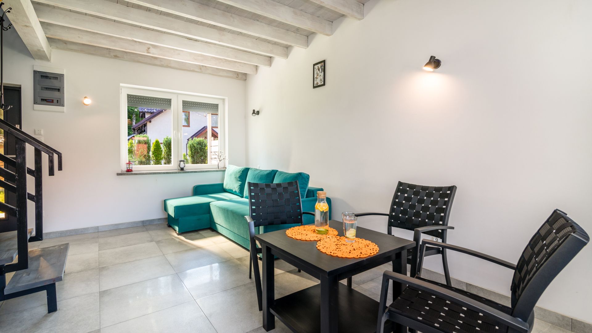 Obok salonu znajduje się aneks kuchenny, który jest wyposażony we wszystkie niezbędne udogodnienia, takie jak mikrofalówka, lodówka i czajnik. To idealne miejsce do przygotowywania posiłków dla całej rodziny lub grupy przyjaciół.