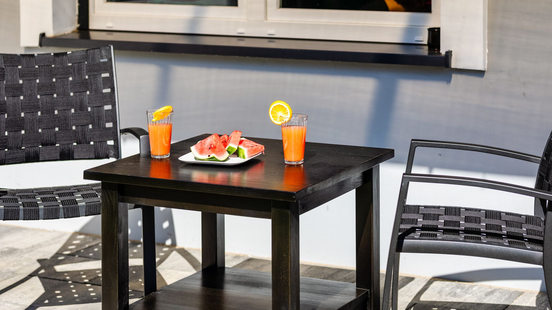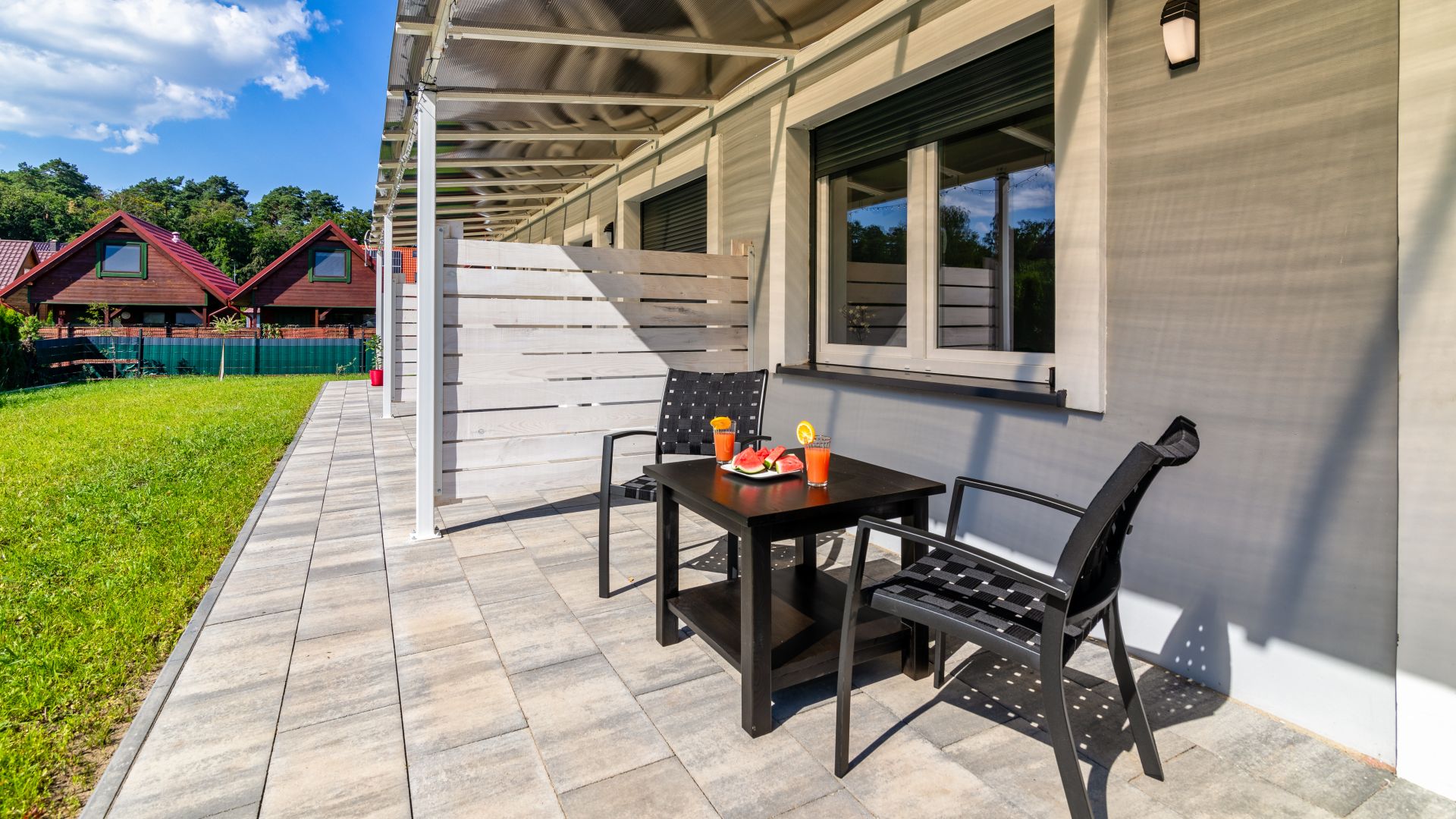 Domki o powierzchni 55m² są doskonale zaprojektowane, aby pomieścić do 5 osób. Na parterze znajduje się salon z wygodną kanapą, która może służyć jako miejsce do spania dla dwóch osób. Salon jest wyposażony w telewizor, co umożliwia gościom relaks po dniu pełnym przygód.