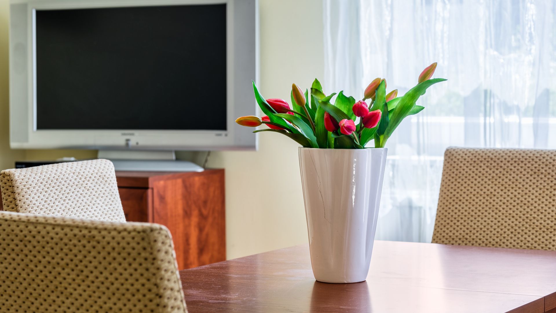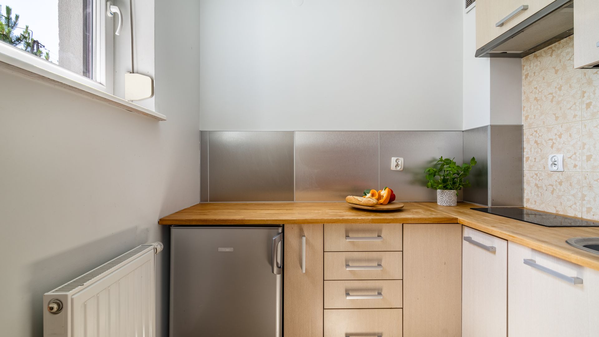 Z salonu prowadzi wyjście na skromny i urokliwy taras, gdzie można delektować się poranną kawą lub odetchnąć świeżym powietrzem.