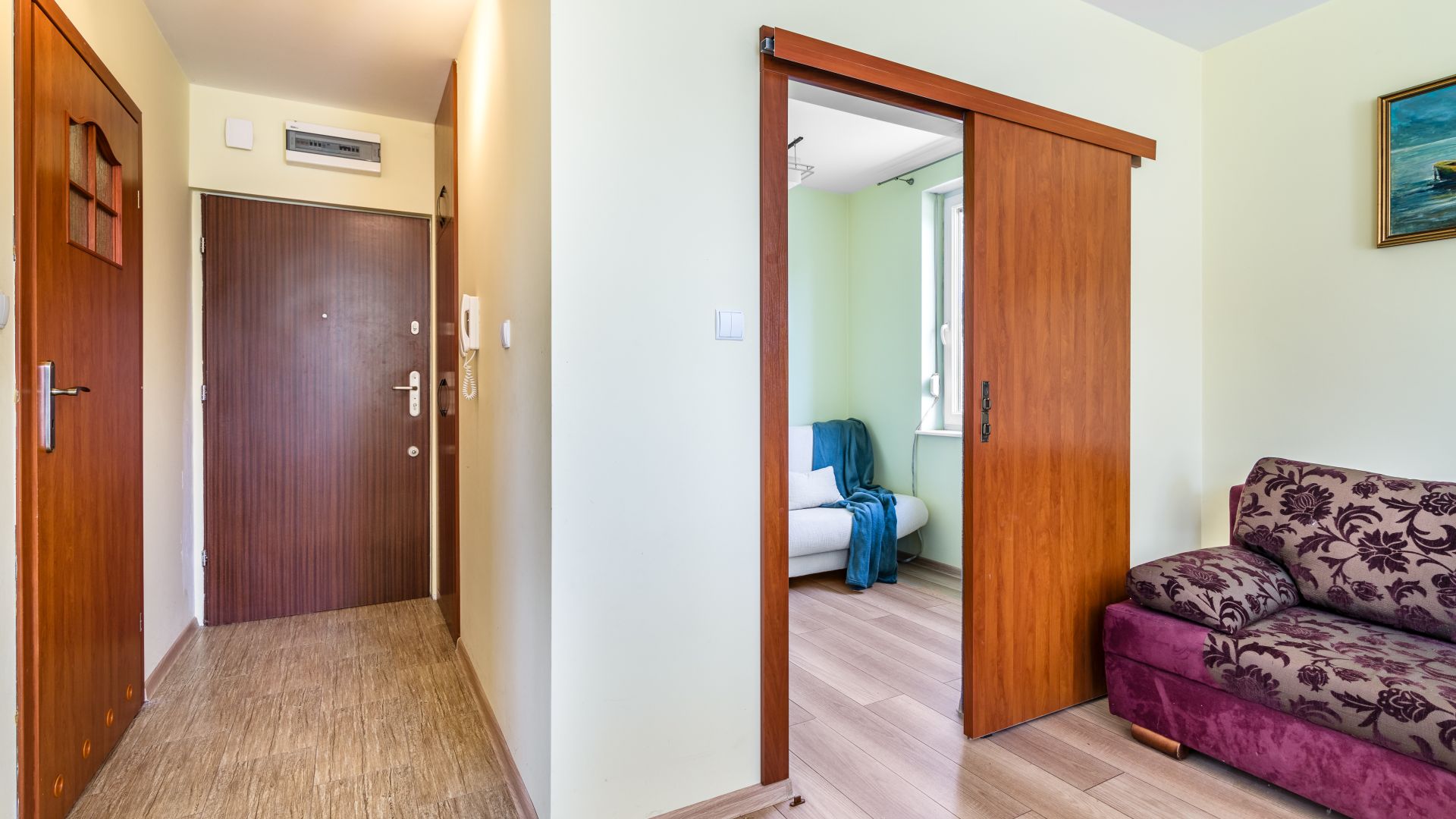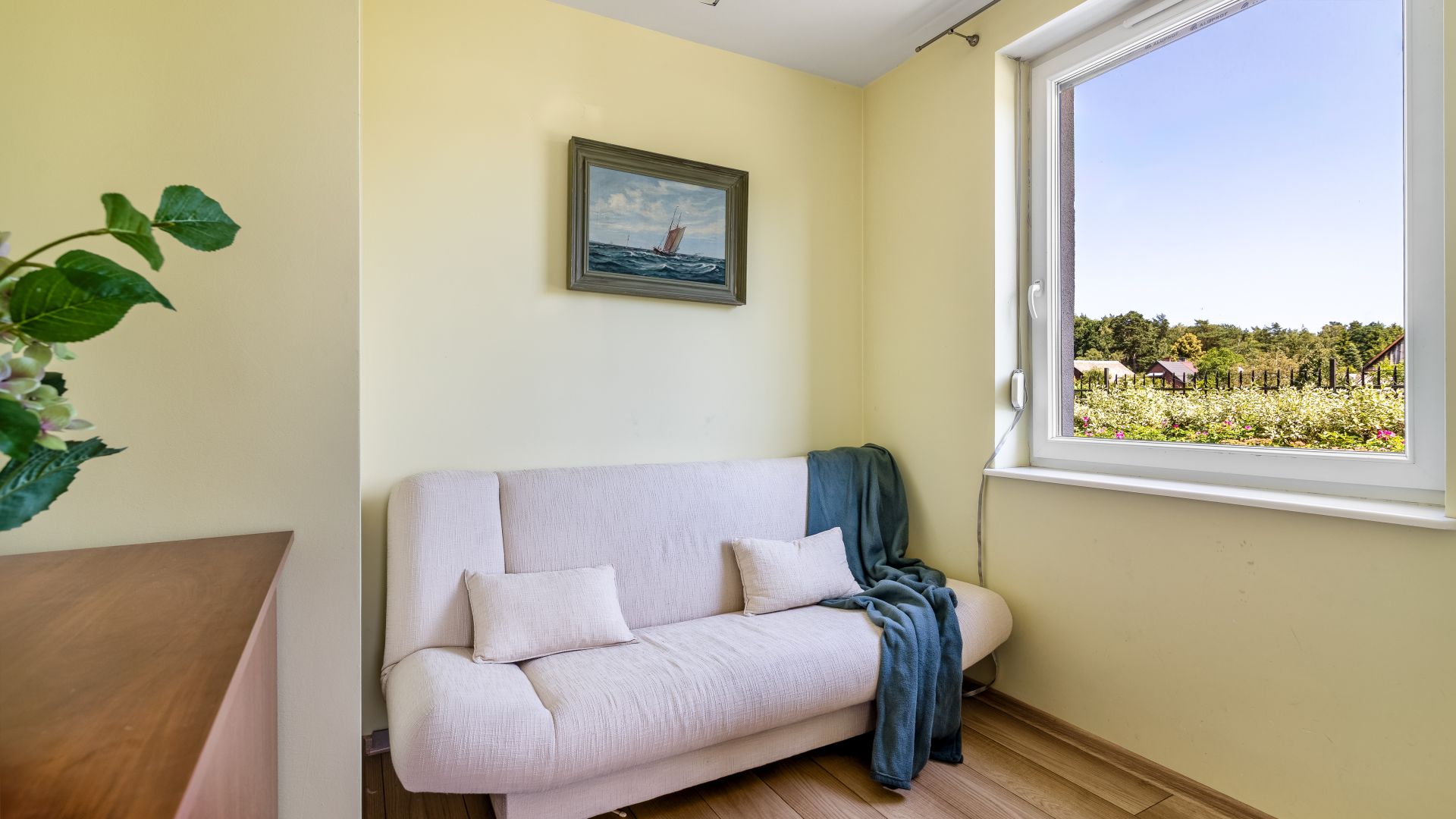 Sypialnia zapewnia komfortowy wypoczynek, dzięki rozkładanej sofie i praktycznej komodzie.