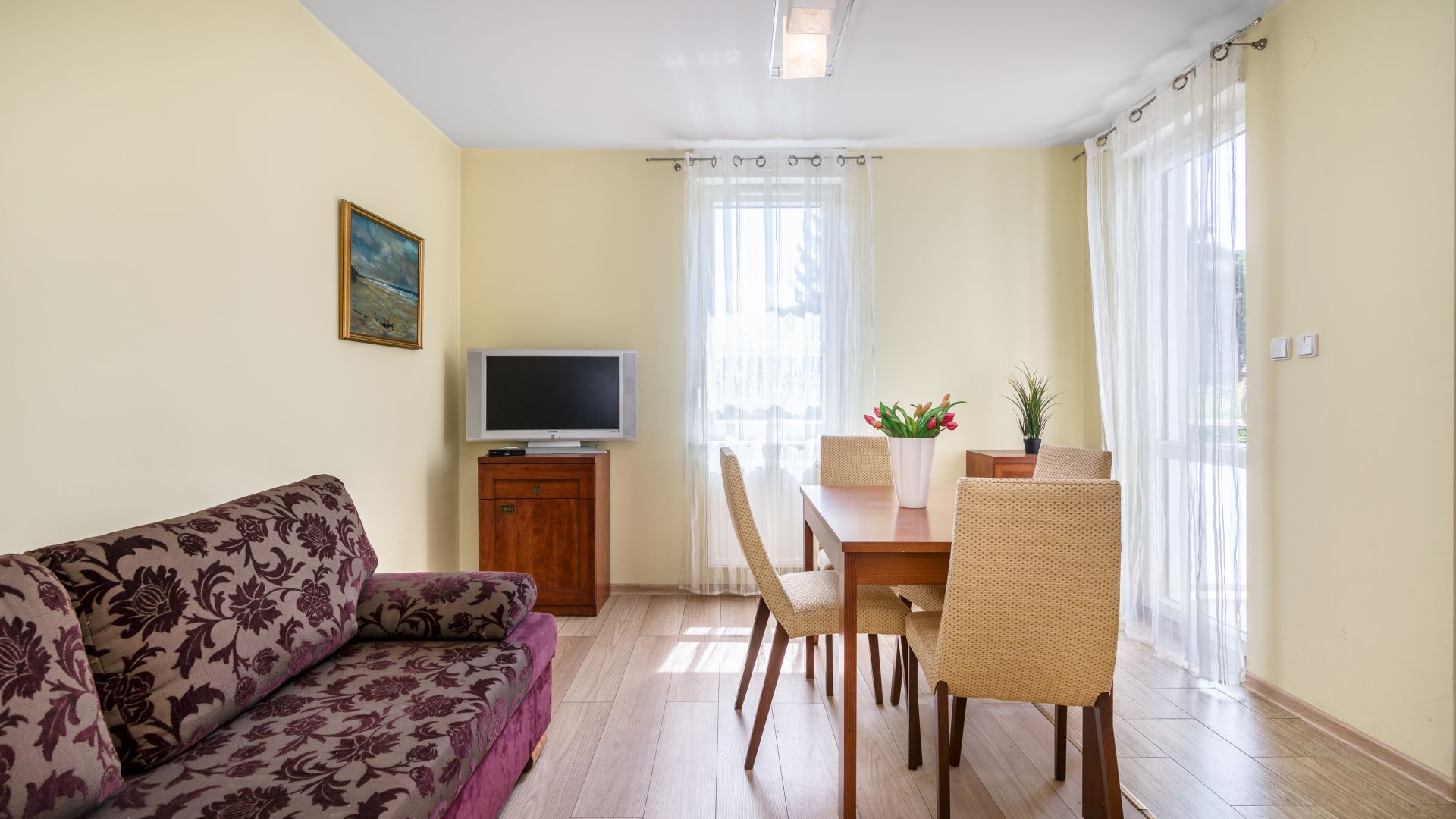 Ten przestronny apartament oferuje salon z wygodną, rozkładaną sofą i telewizorem – idealne miejsce do relaksu po dniu pełnym słońca i morskich kąpieli.