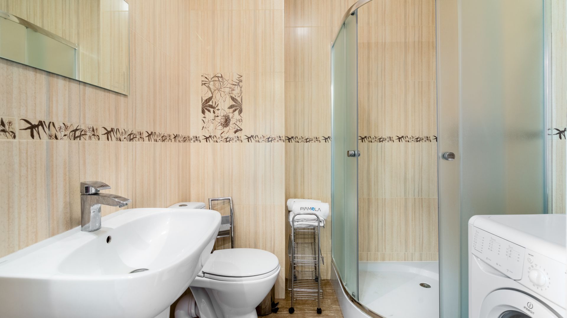 W łazience znajduje się funkcjonalna kabina prysznicowa oraz pralka.