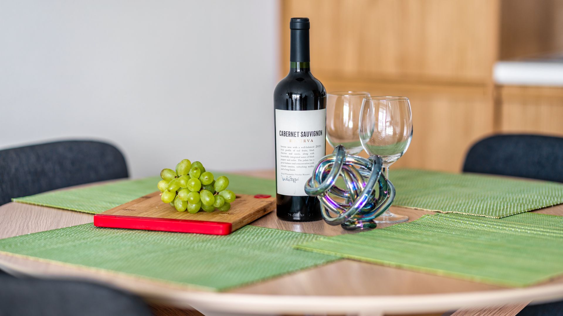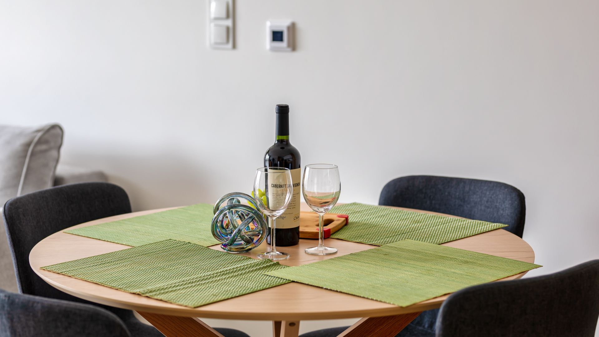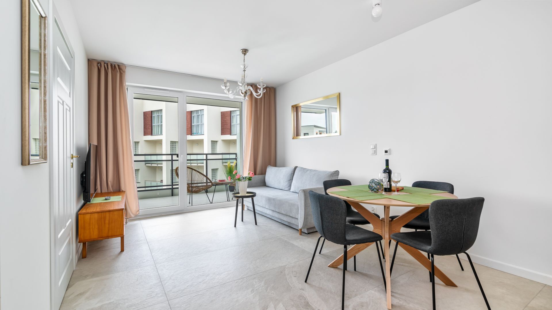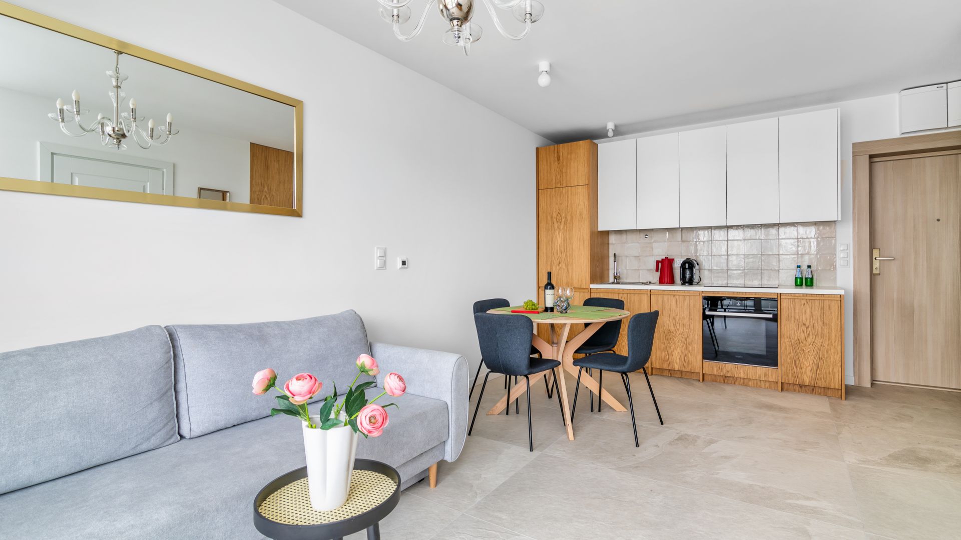 Apartament składa się z przestronnego salonu połączonego z w pełni wyposażonym aneksem kuchennym. Do dyspozycji gości jest lodówka, zmywarka, mikrofalówka, piekarnik, ekspres do kawy oraz komplet naczyń i akcesoriów kuchennych – wszystko, co potrzebne, aby cieszyć się samodzielnie przygotowanymi posiłkami. W salonie znajduje się również telewizor oraz dostęp do szybkiego Wi-Fi, co pozwala na wygodny odpoczynek lub pracę zdalną.