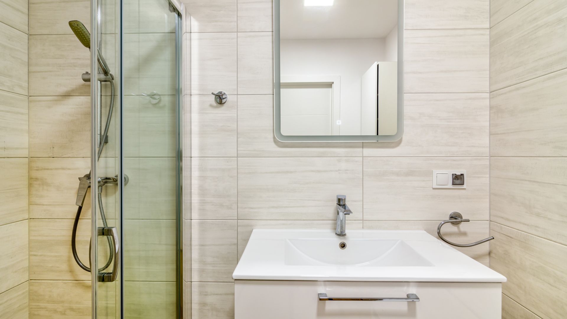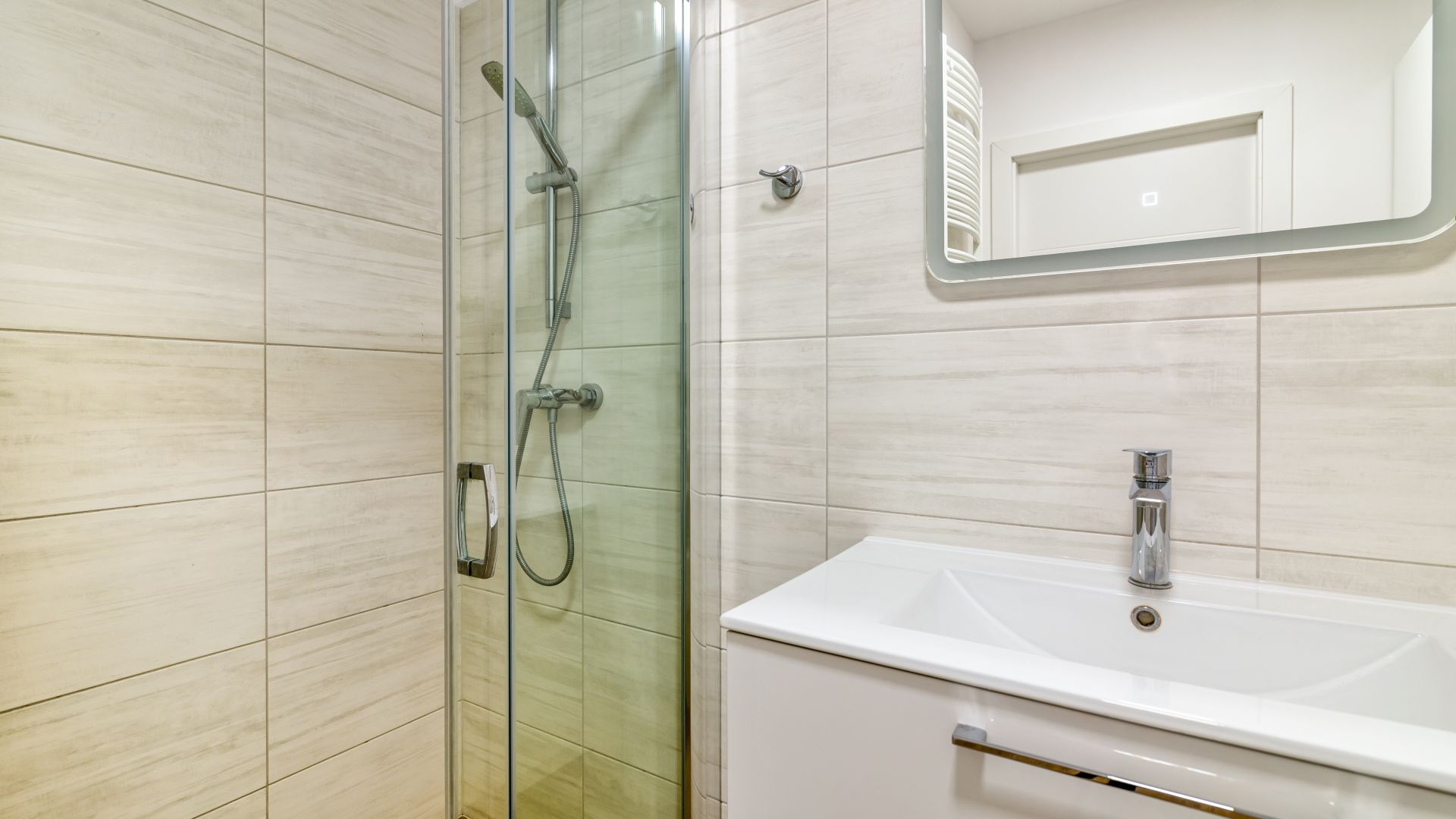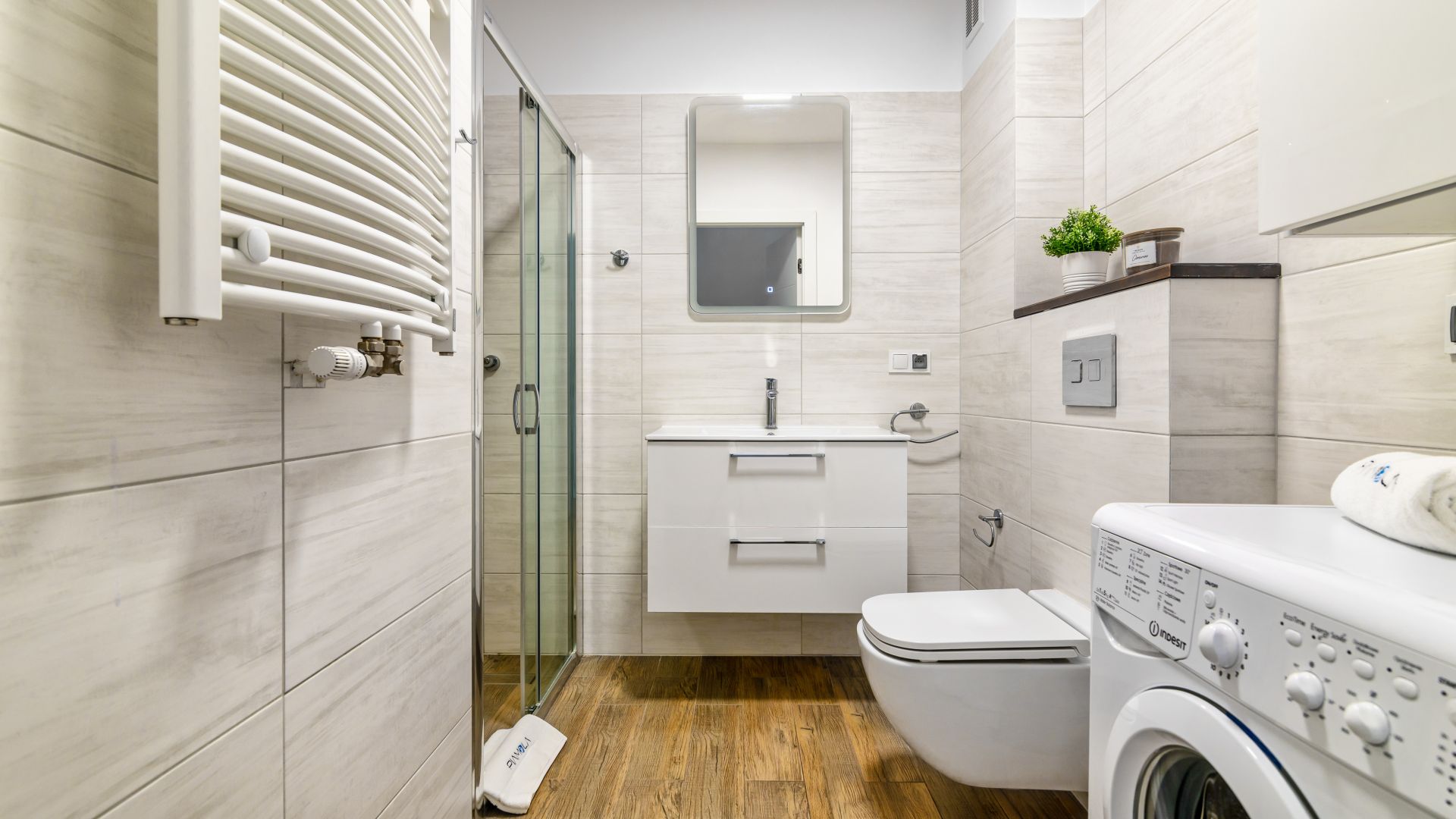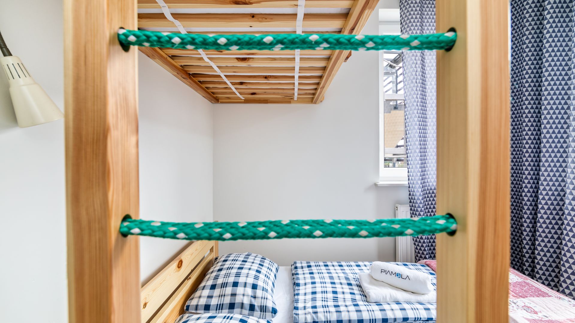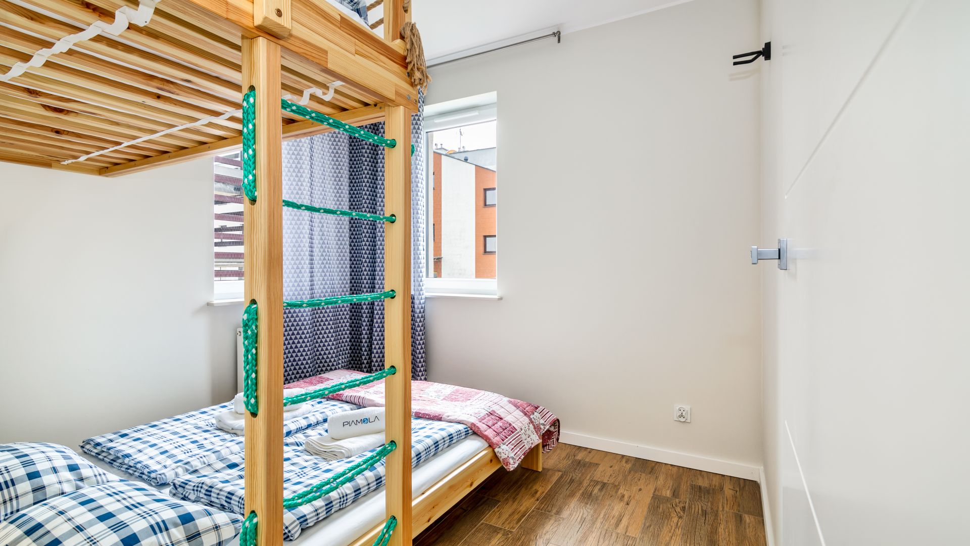 Sypialnia została wyposażona w wygodne łóżko podwójne oraz jedno łóżko pojedyncze, zapewniając komfortowy sen nawet przy dłuższych pobytach. W apartamencie znajduje się również nowoczesna łazienka z pełnym wyposażeniem oraz pralka, co zwiększa wygodę codziennego użytkowania.