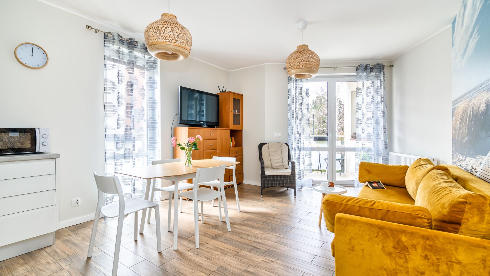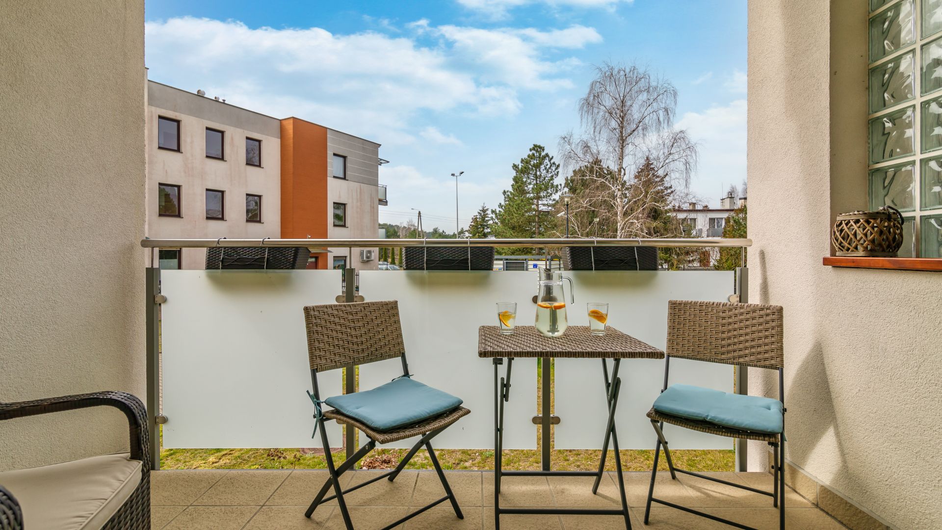 Dodatkowym atutem jest przestronny balkon z meblami ogrodowymi — idealny na poranną kawę, kolację na świeżym powietrzu lub chwilę relaksu przy zachodzie słońca.