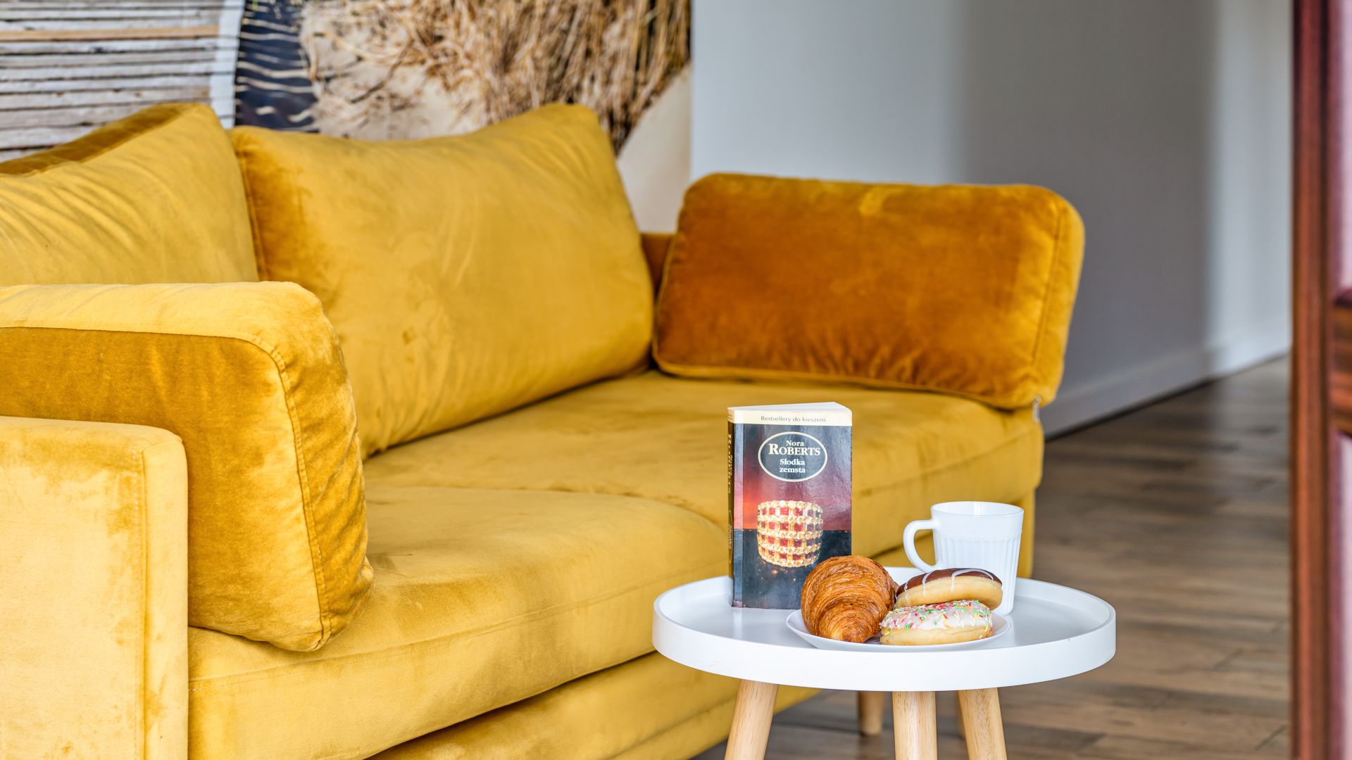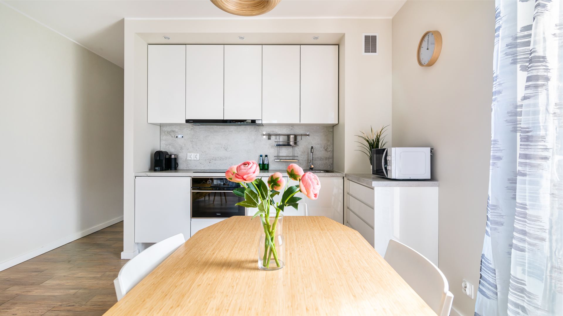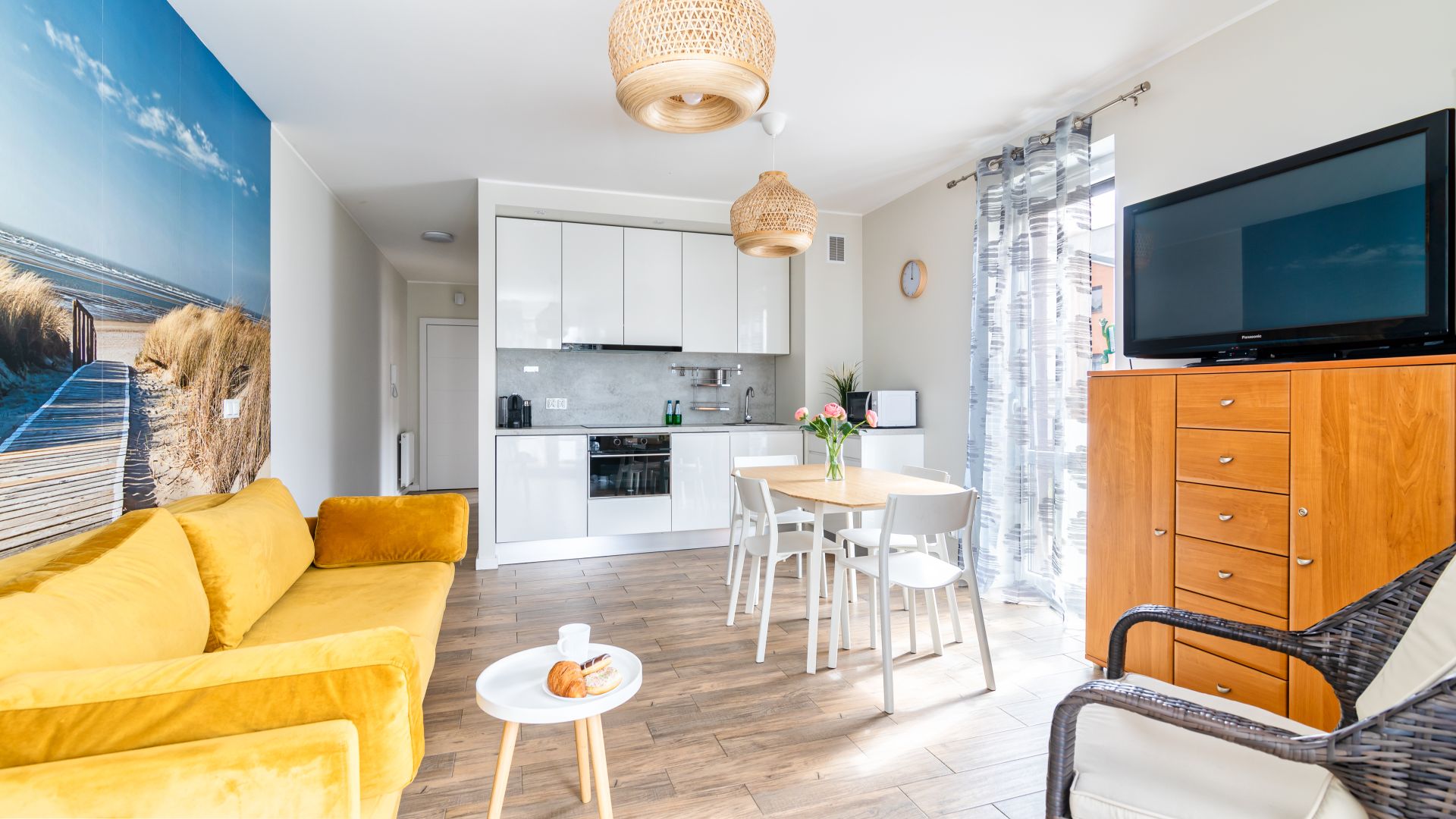 Apartament składa się z przestronnego salonu z rozkładaną sofą, połączonego z w pełni wyposażonym aneksem kuchennym, w którym znajduje się lodówka, zmywarka, piekarnik, ekspres do kawy oraz niezbędne naczynia i akcesoria kuchenne. To idealne miejsce, by wspólnie przygotować posiłki i spędzać czas w gronie najbliższych.