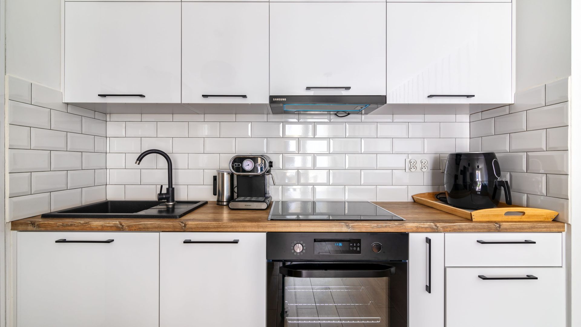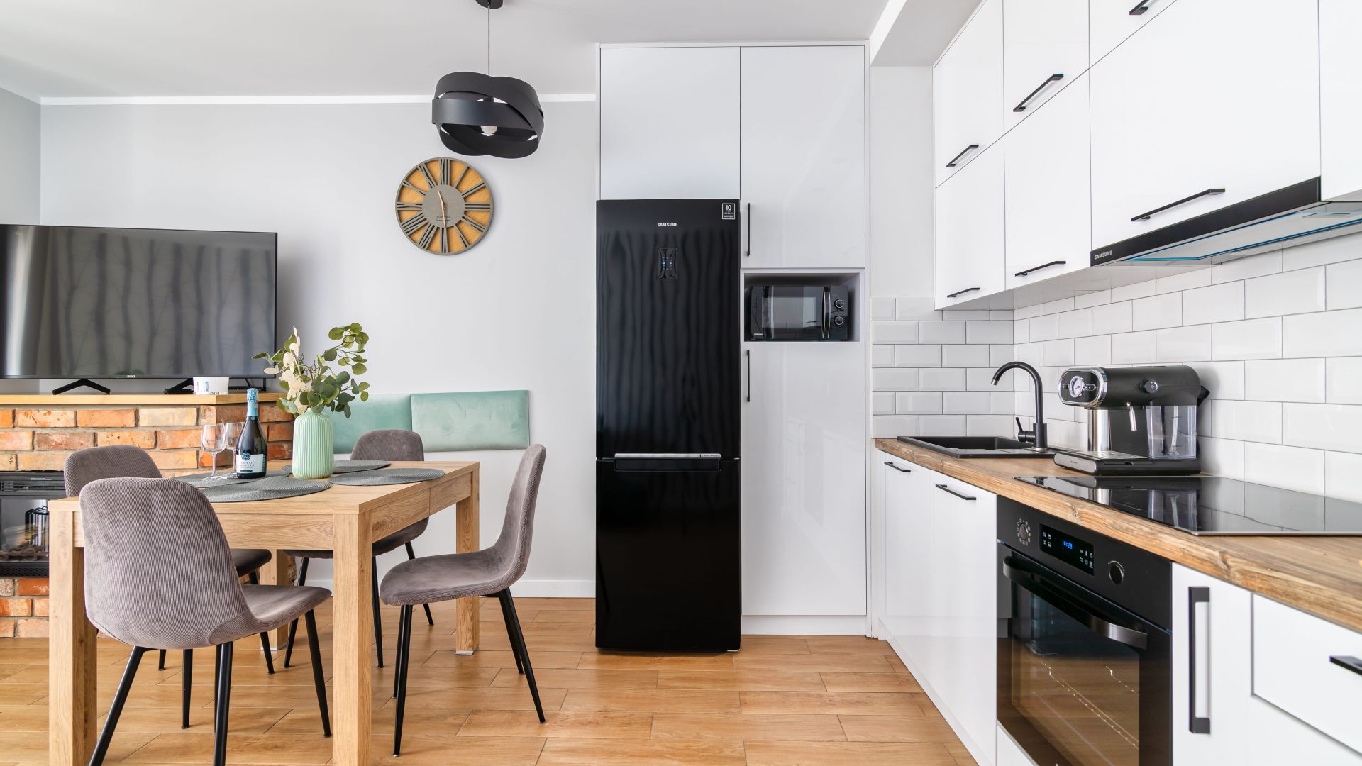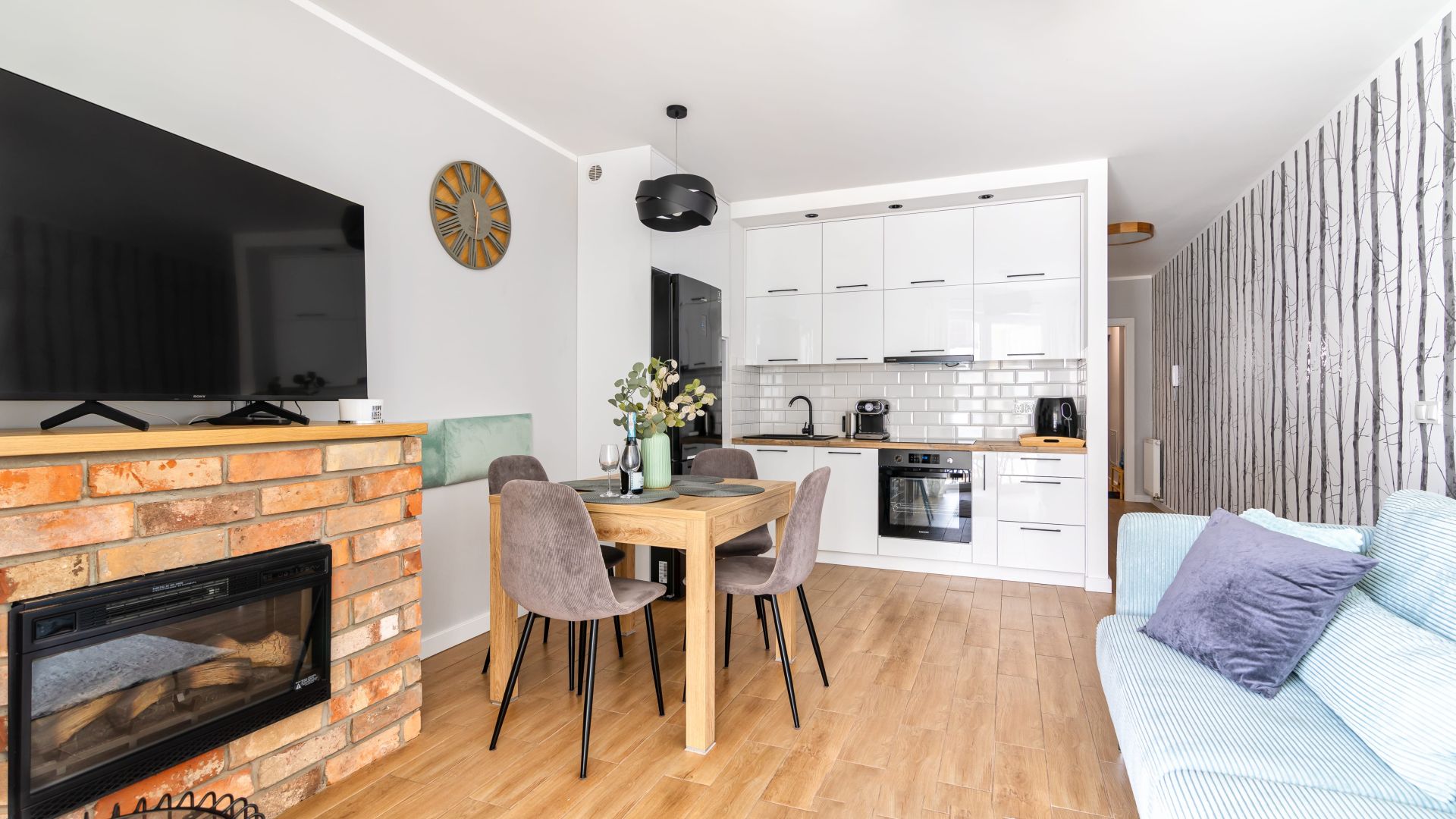 Apartament składa się z przestronnego salonu połączonego z w pełni wyposażonym aneksem kuchennym, w którym znajdują się wszystkie niezbędne udogodnienia: lodówka, zmywarka, piekarnik, kuchenka mikrofalowa, ekspres do kawy oraz komplet naczyń i akcesoriów kuchennych. To idealne miejsce zarówno na szybkie śniadanie, jak i rodzinny obiad po dniu spędzonym na plaży. W salonie znajduje się również wygodna część wypoczynkowa z telewizorem i kominkiem, który tworzy wyjątkowy klimat podczas chłodniejszych wieczorów.