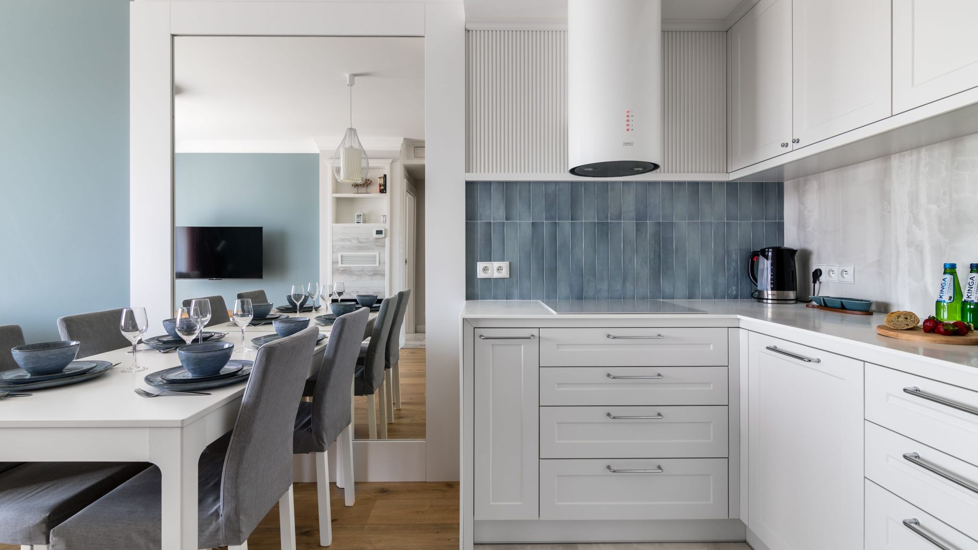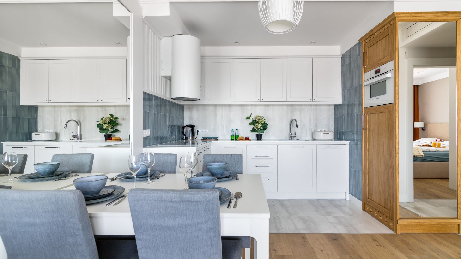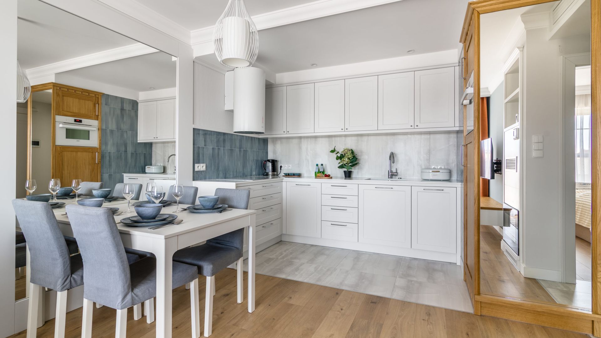 Aneks kuchenny wyposażony jest w najpotrzebniejsze sprzęty i akcesoria kuchenne: lodówkę, zmywarkę, płytę indukcyjną, czajnik elektryczny oraz kuchenkę, dzięki czemu przygotowanie posiłków będzie czystą przyjemnością.