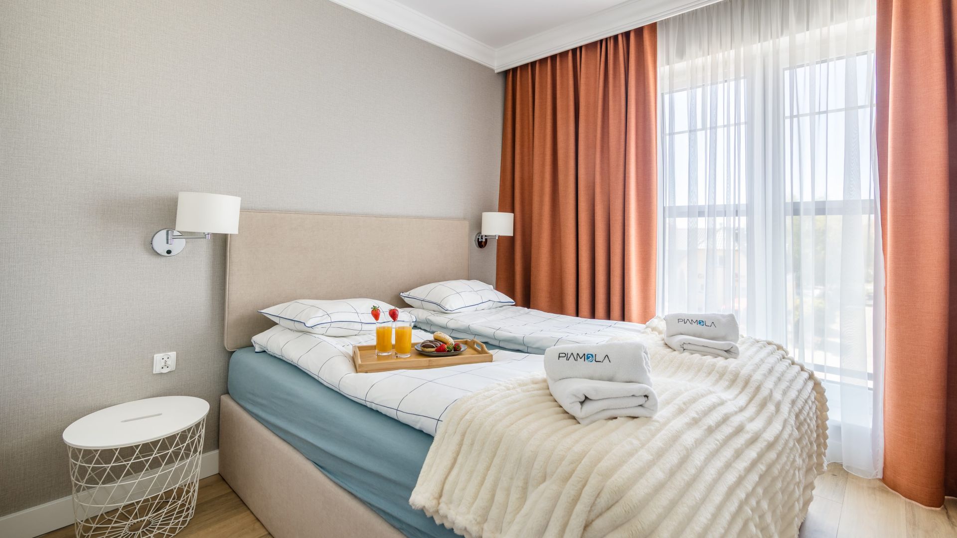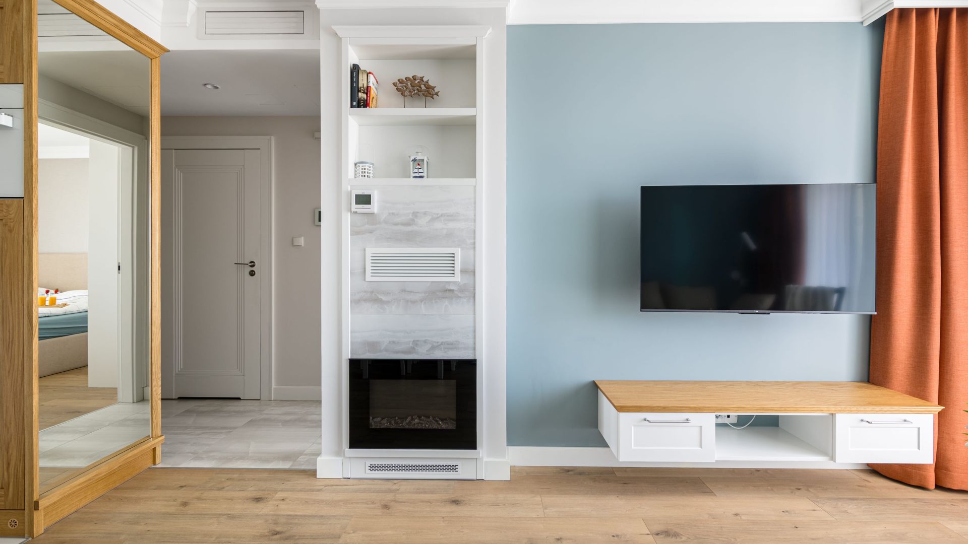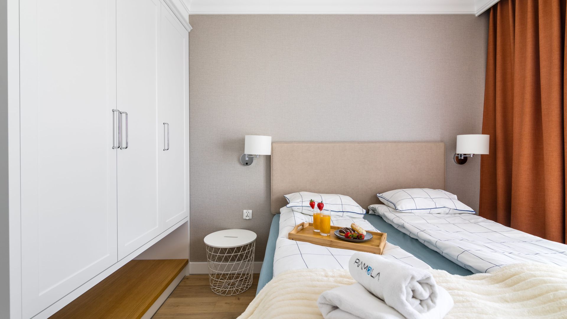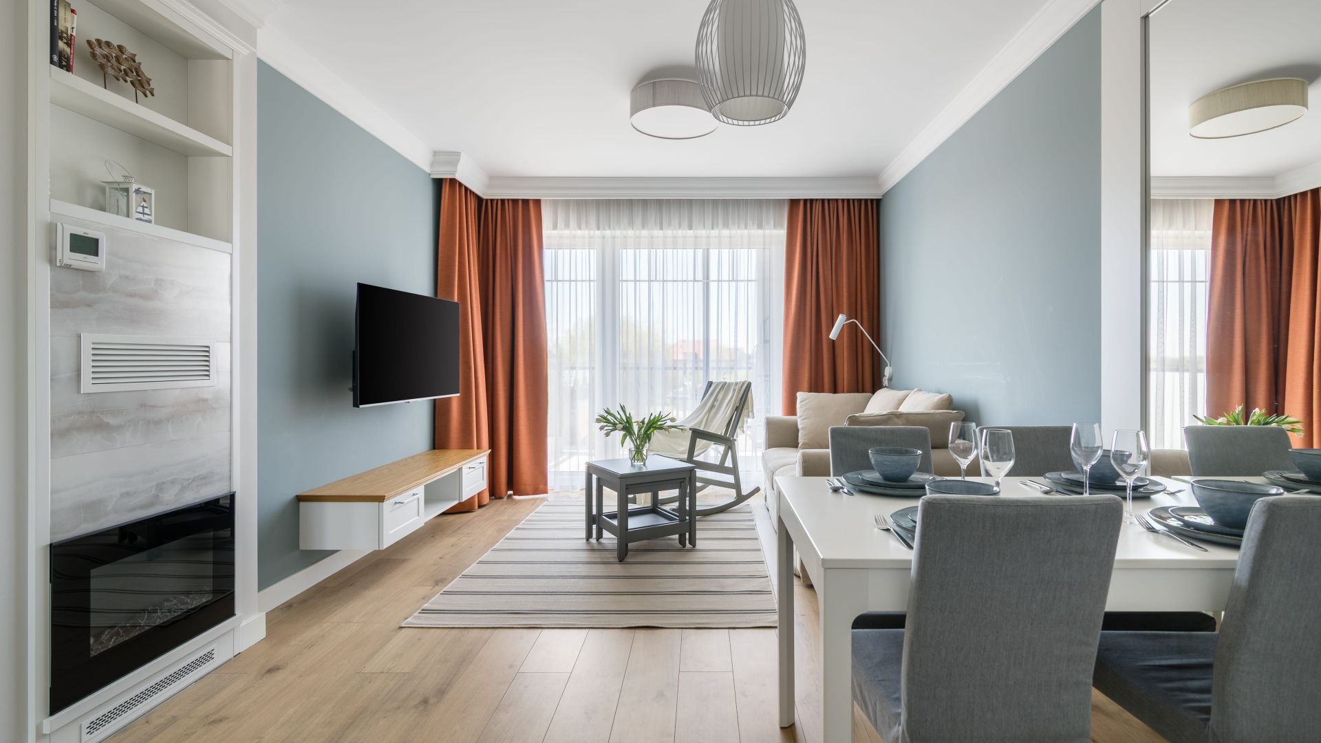 W skład apartamentu wchodzi przestronny salon z aneksem kuchennym oraz osobna sypialnia z łóżkiem małżeńskim. W salonie znajduje się rozkładana sofa, która zapewnia wygodne miejsce do spania dla dwóch osób, stoliczek kawowy, telewizor oraz dostęp do Wi-Fi. Klimatyczny kominek elektryczny dopełnia atmosferę i sprzyja relaksowi.