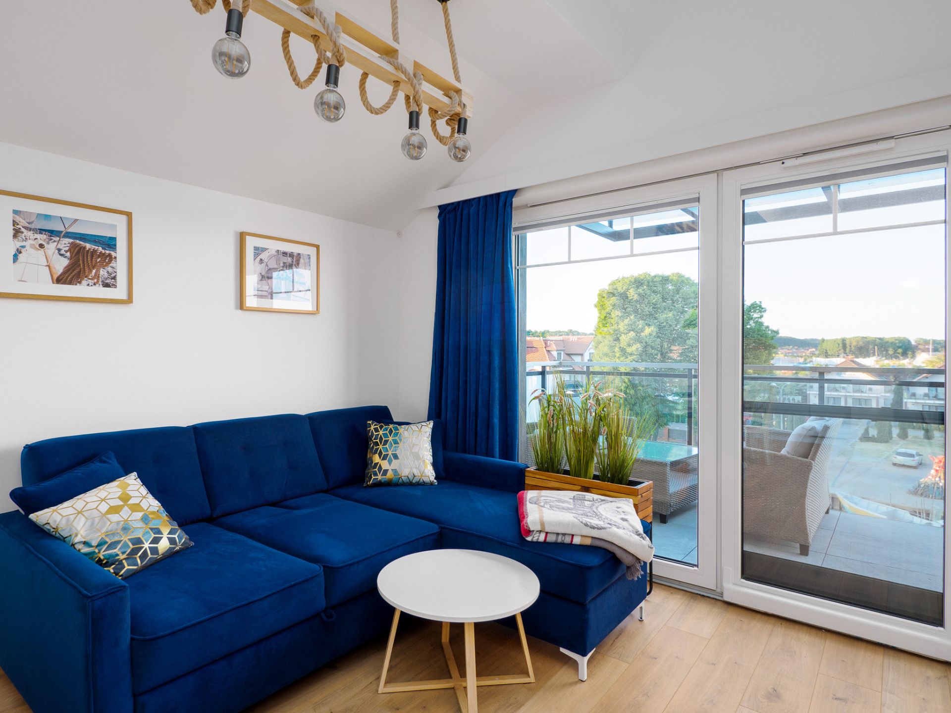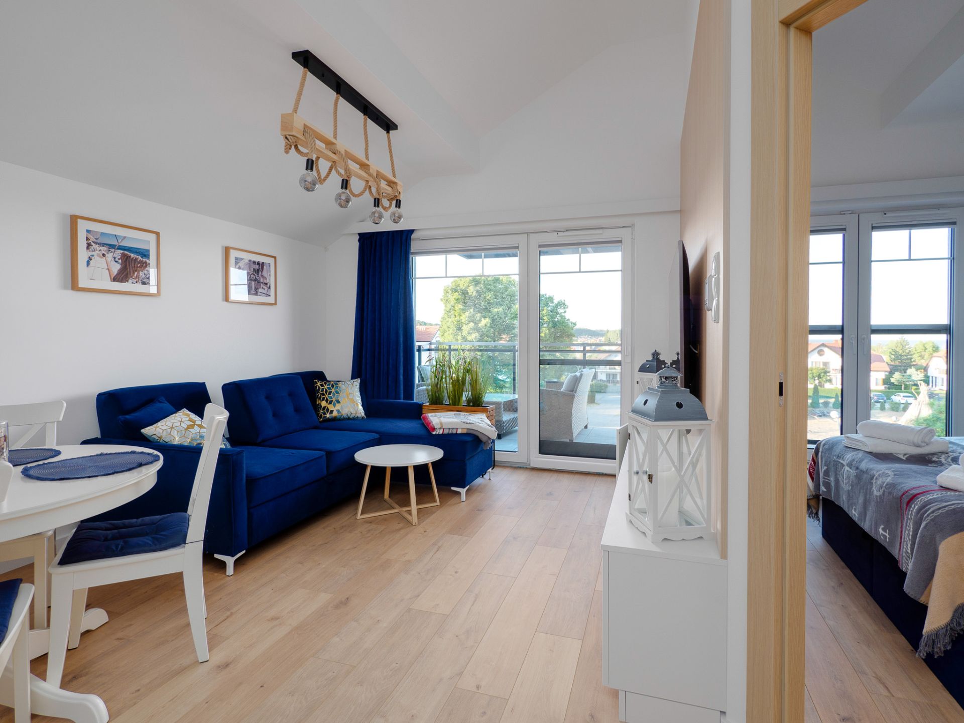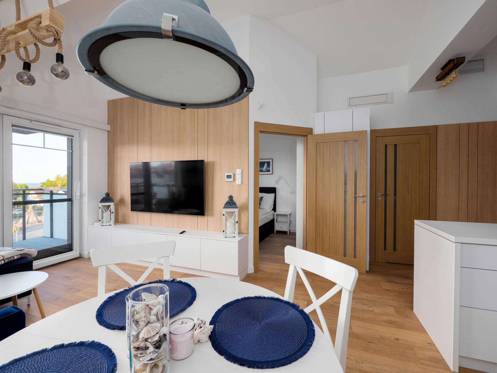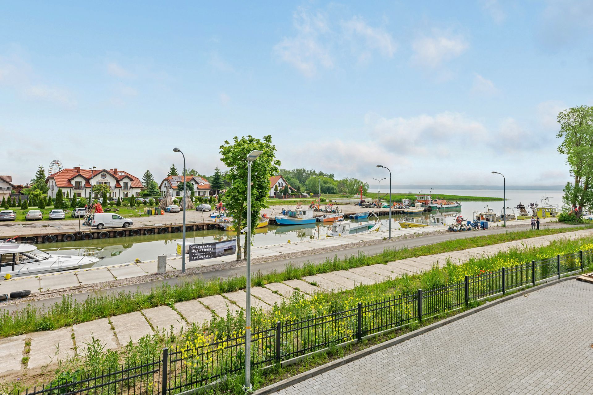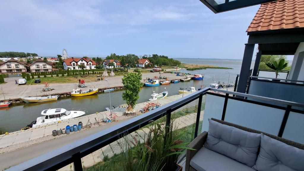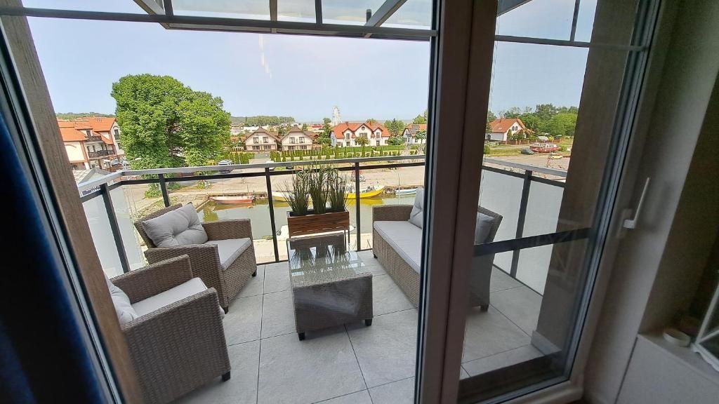 Z salonu mamy wyjście na balkon wyposażony w eleganckie meble wypoczynkowe, skąd można podziwiać przepiękny widok na port i Zalew.
