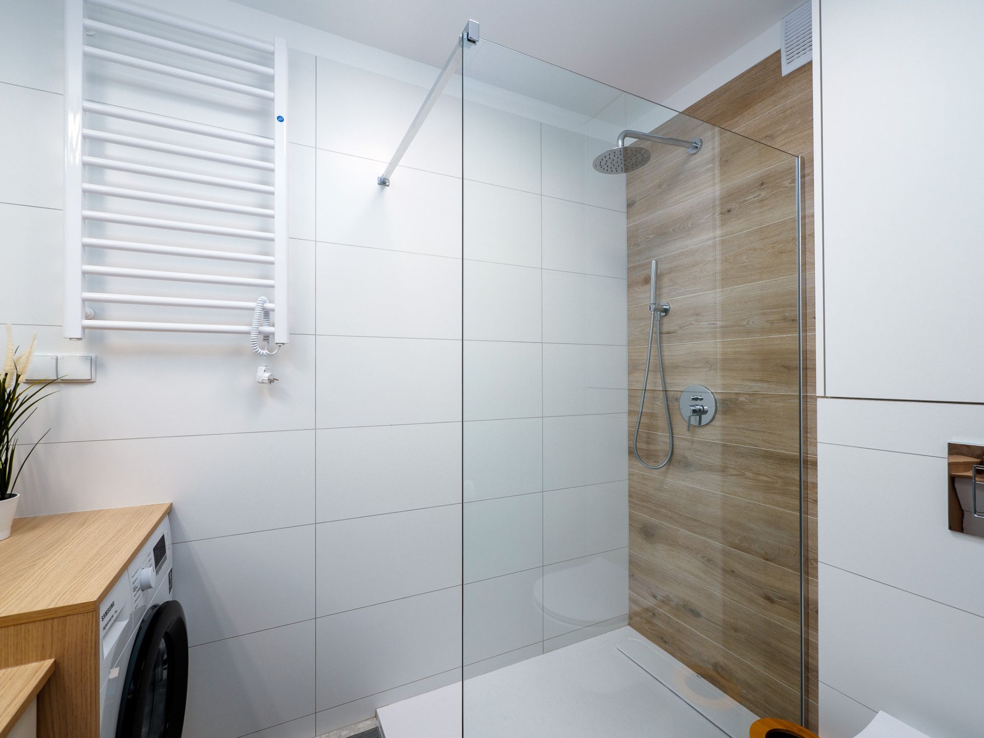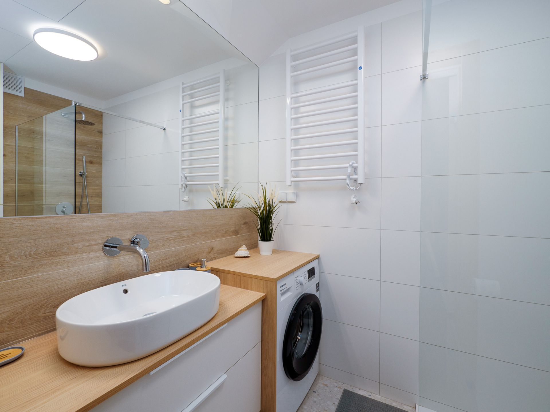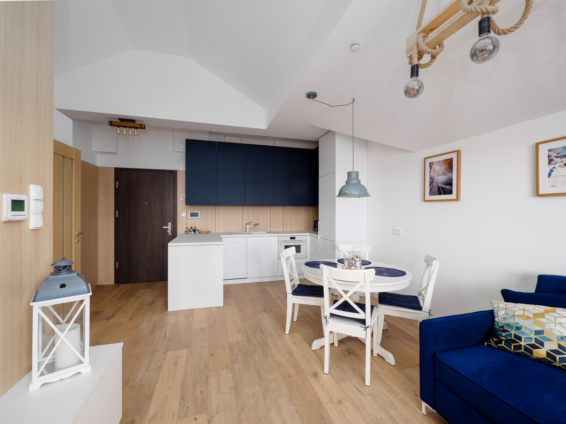 Część kuchenno-jadalniana wyposażona została we wszystkie potrzebne sprzęty i akcesoria - sprawia, że czujemy się tu jak w domu. Mamy do dyspozycji dużą lodówkę, piekarnik, zmywarkę, czajnik, płytę indukcyjną oraz cały zestaw kieliszków, sztućców oraz stół z krzesłami.