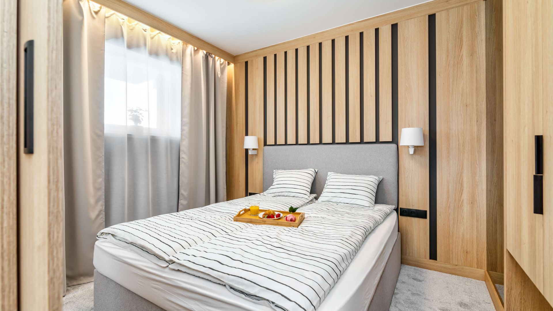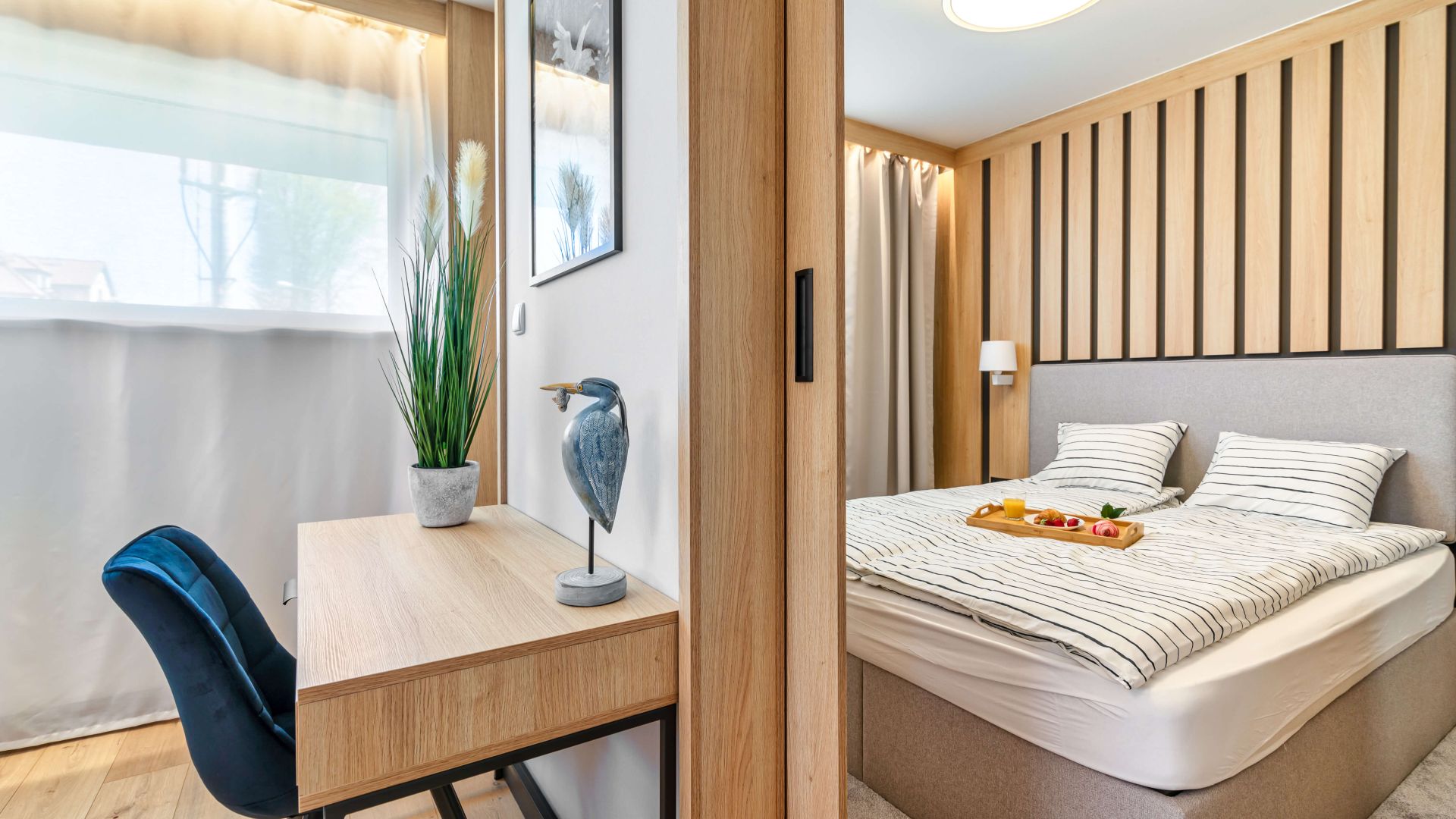 Przestronna, elegancka, z dużym łóżkiem sypialnia, na pewno zadowoli niejednych z Państwa.