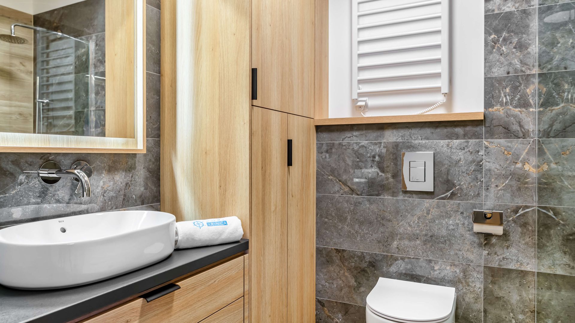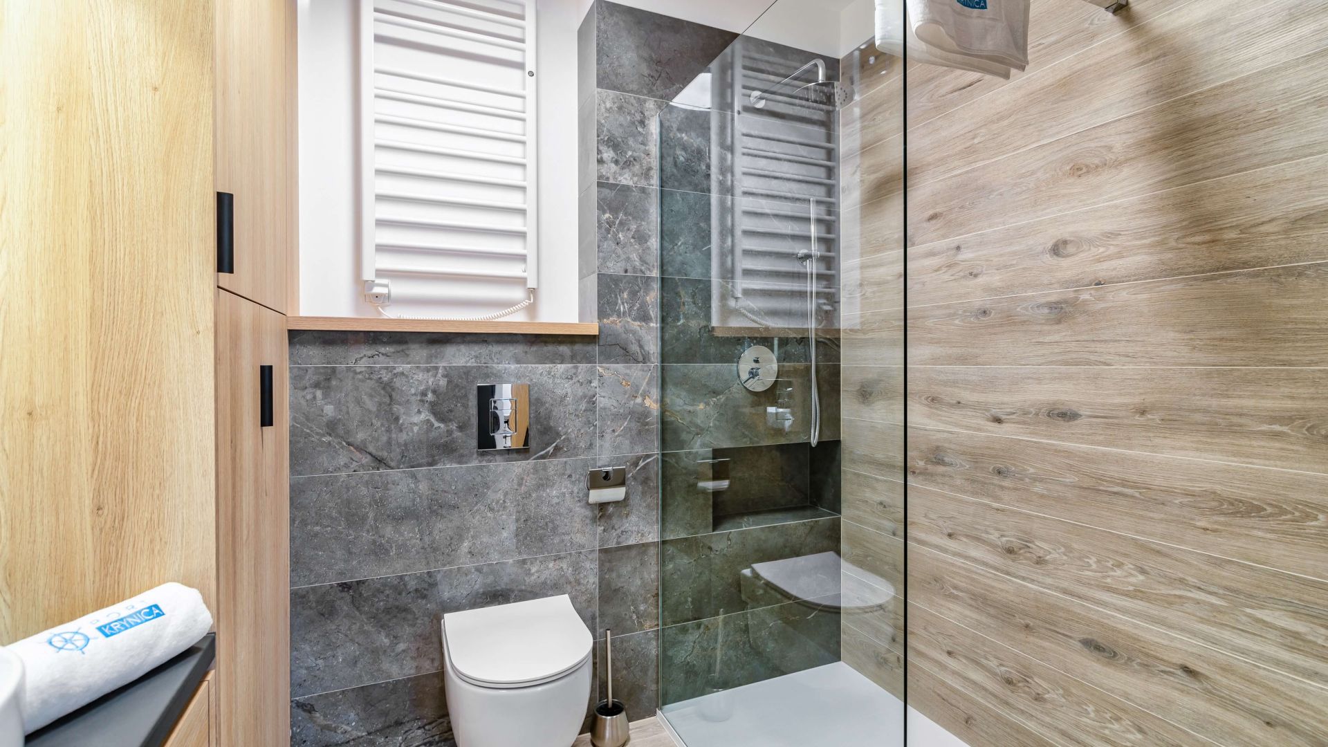 Łazienka z dużym przestronnym prysznicem, wygodną umywalką, pralką i szafką na przechowywanie, zachwyci swoją elegancją.