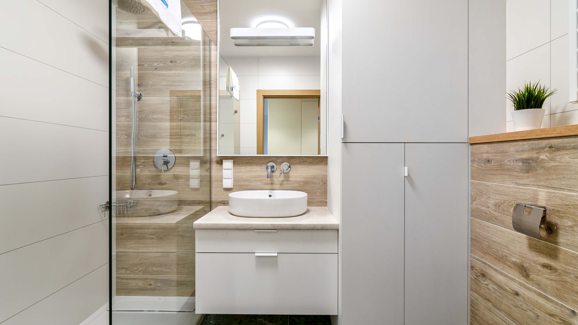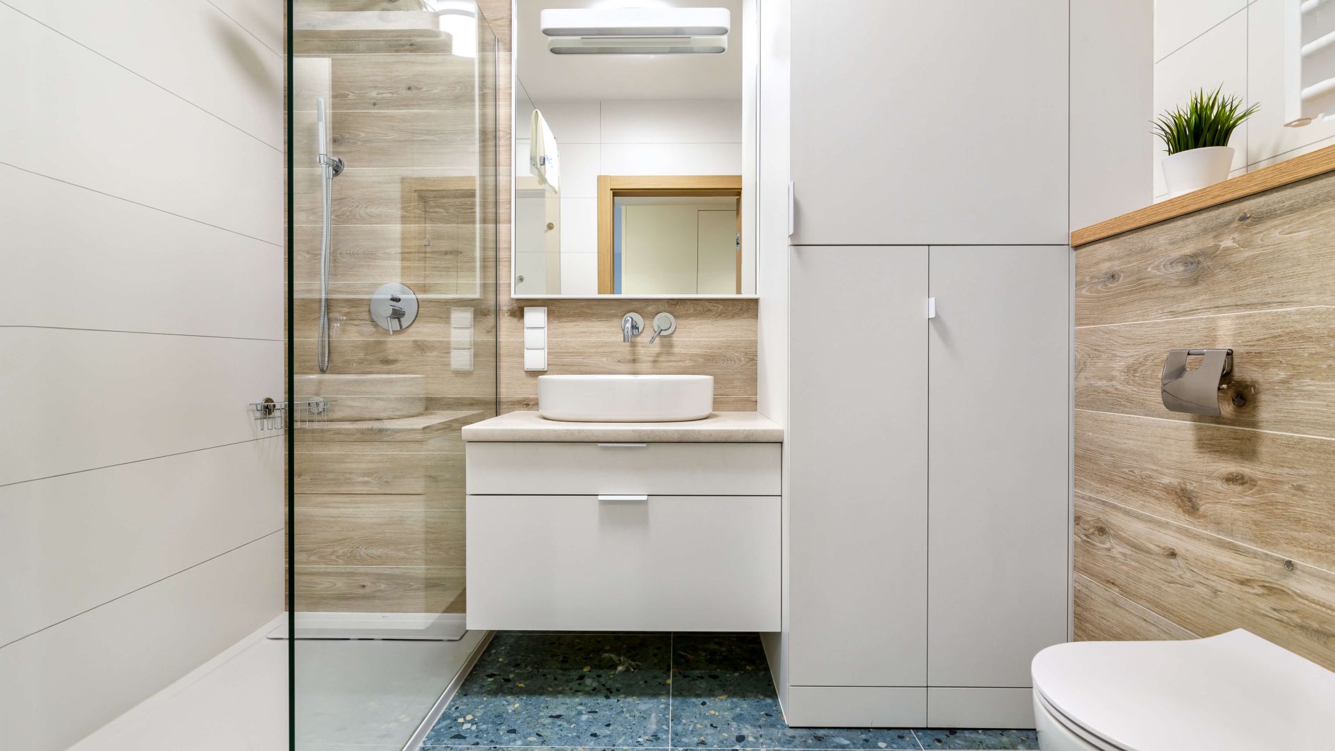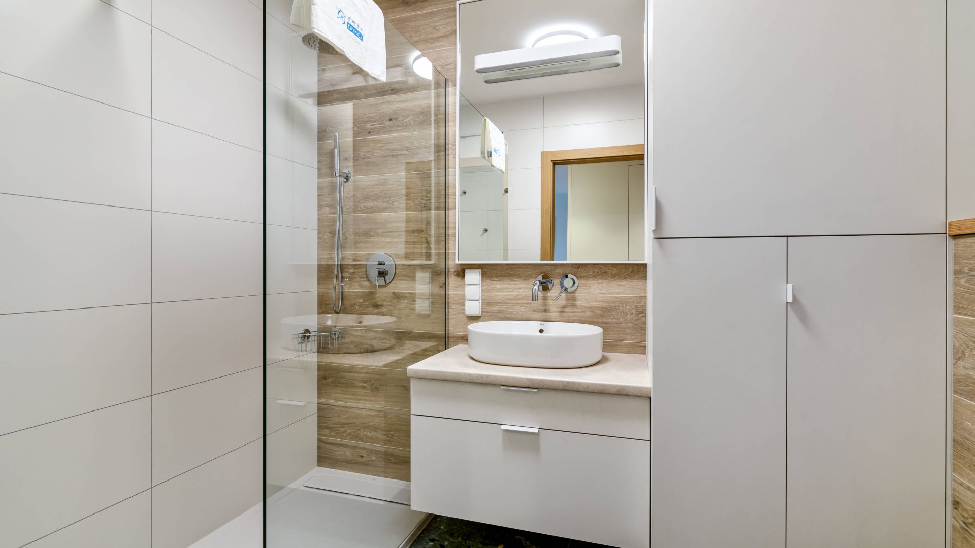 Łazienka z dużym przestronnym prysznicem, wygodną umywalką, pralką i szafką na przechowywanie, zachwyci swoją elegancją.