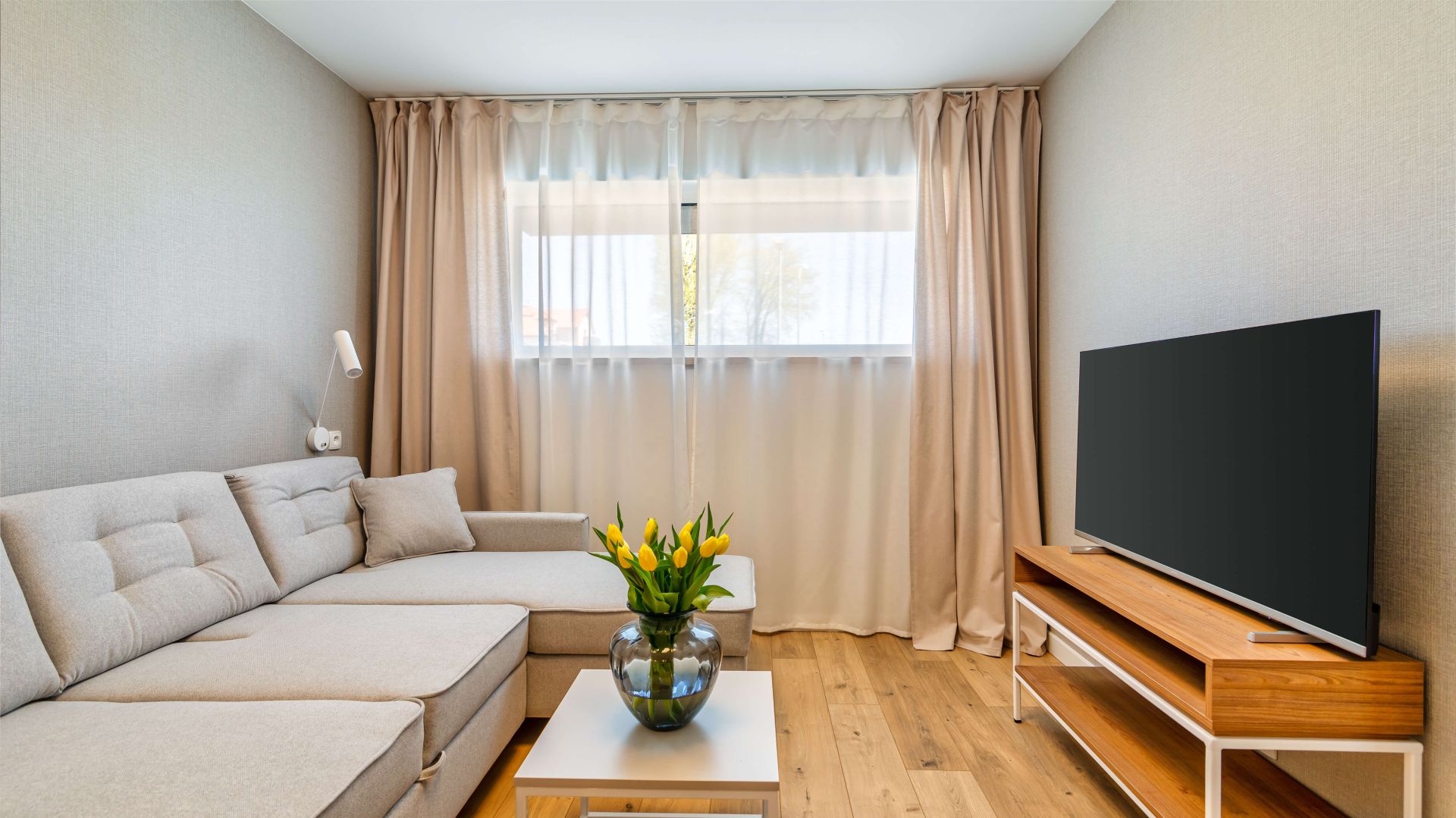 Salon z wygodną kanapą i TV pozwoli na chwile relaksu. Przestronna, elegancka, z dużym łóżkiem sypialnia, na pewno zadowoli niejednych z Państwa.