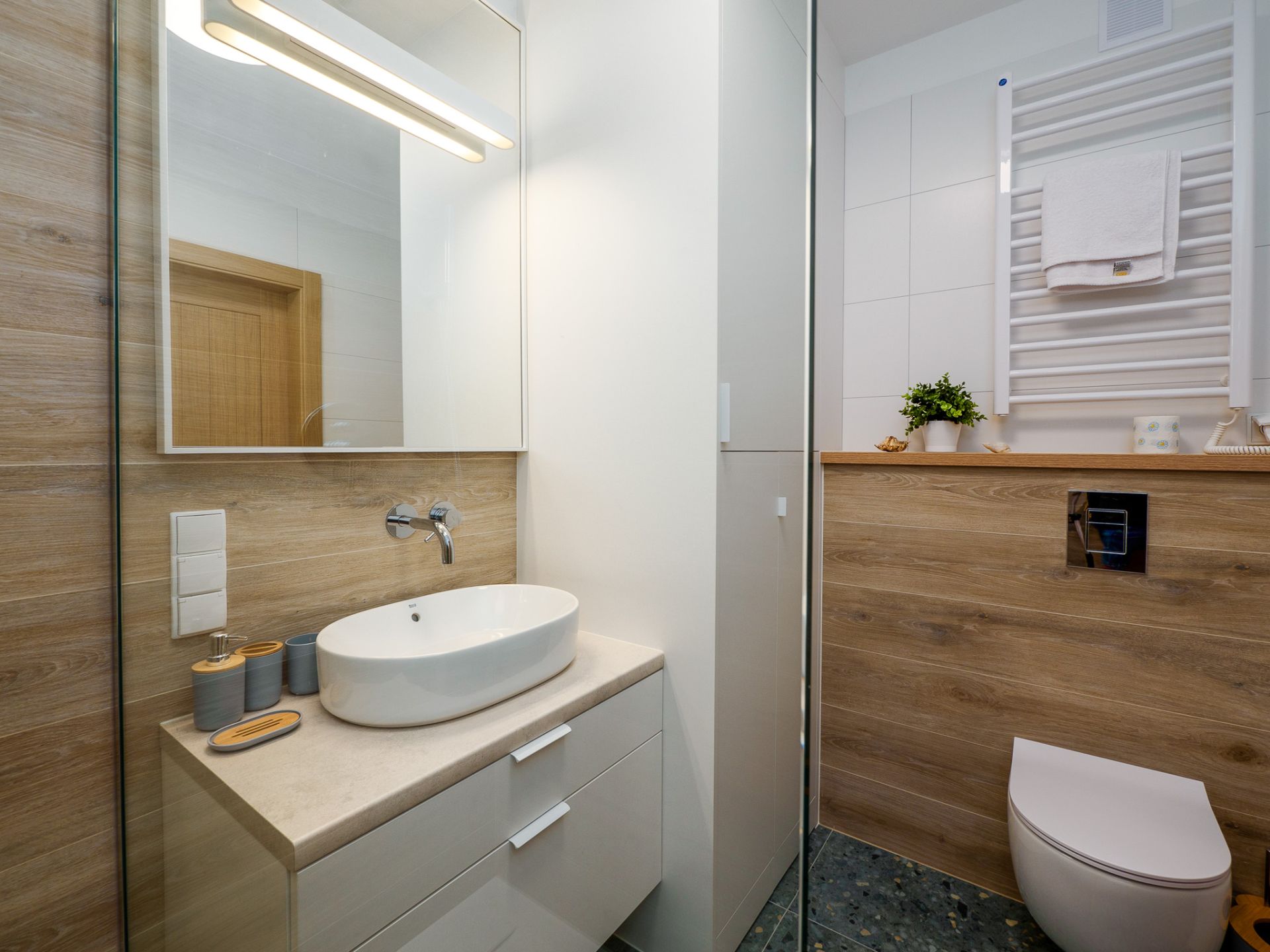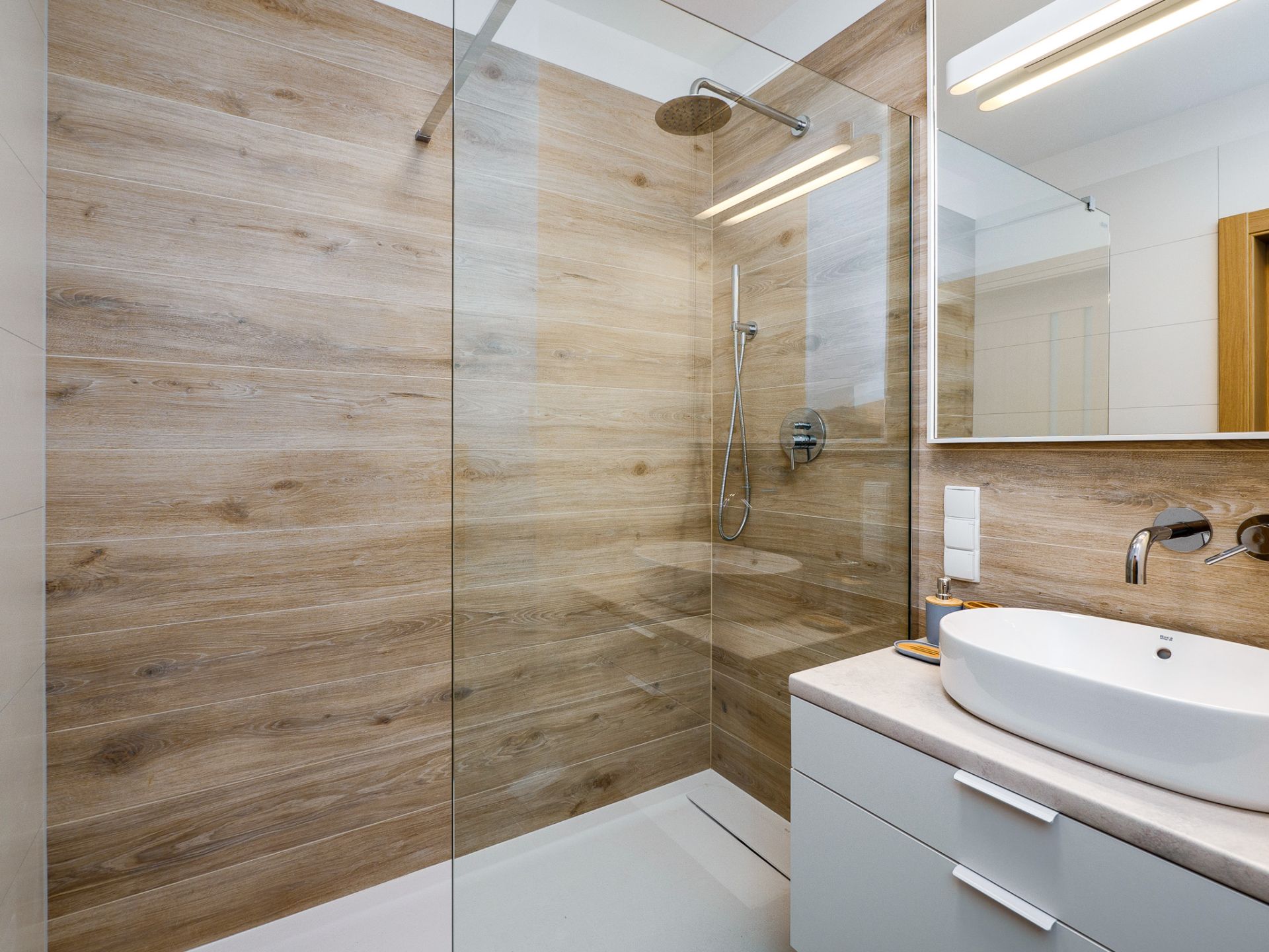 Łazienka z dużym przestronnym prysznicem, wygodną umywalką, pralką i szafką na przechowywanie, zachwyci swoją elegancją.
