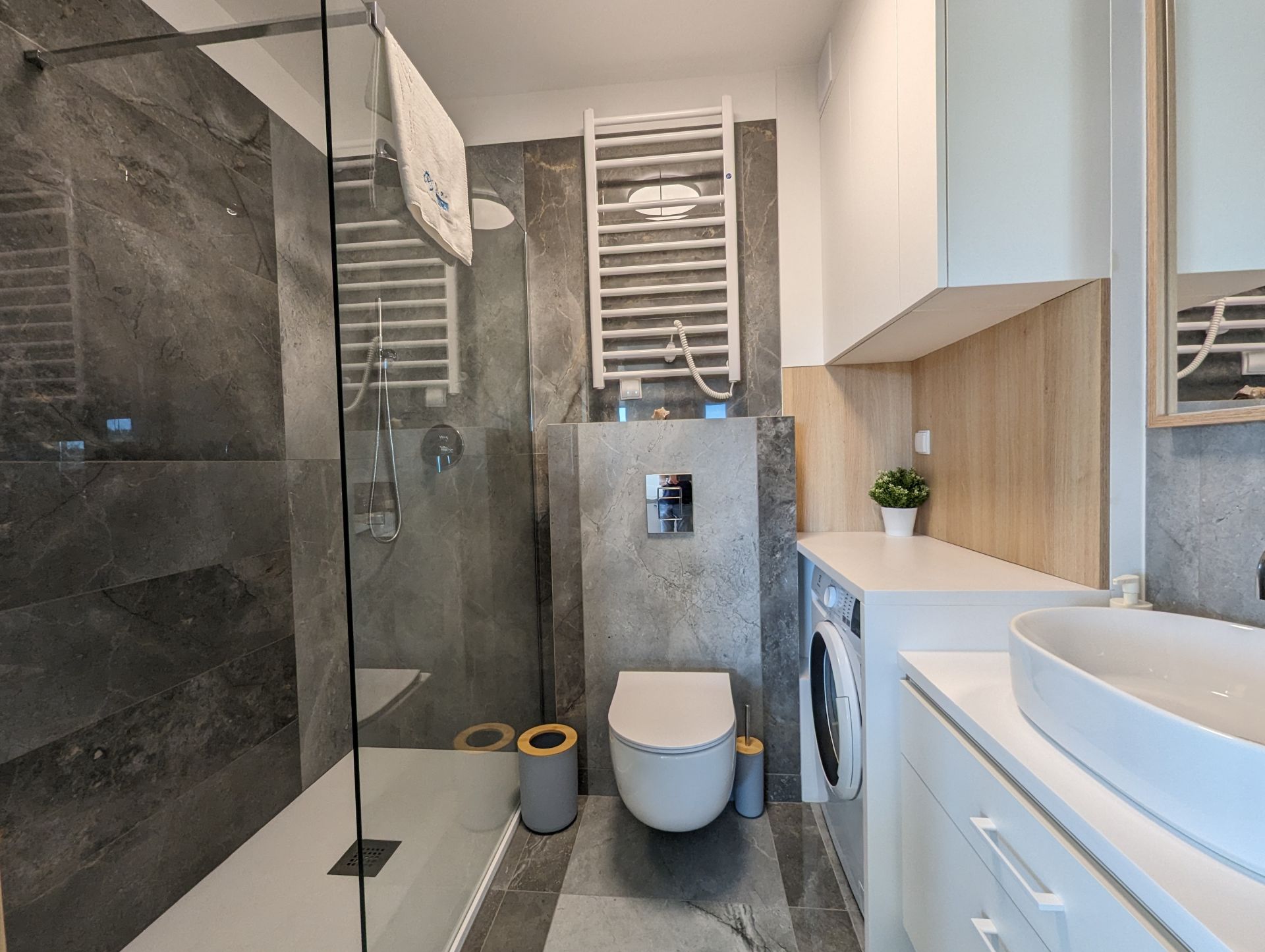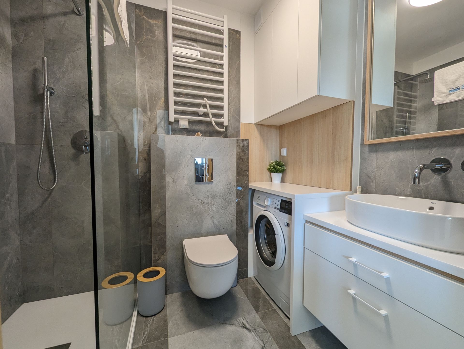 Łazienka z dużym przestronnym prysznicem, wygodną umywalką, pralką i szafką na przechowywanie, zachwyci swoją elegancją.