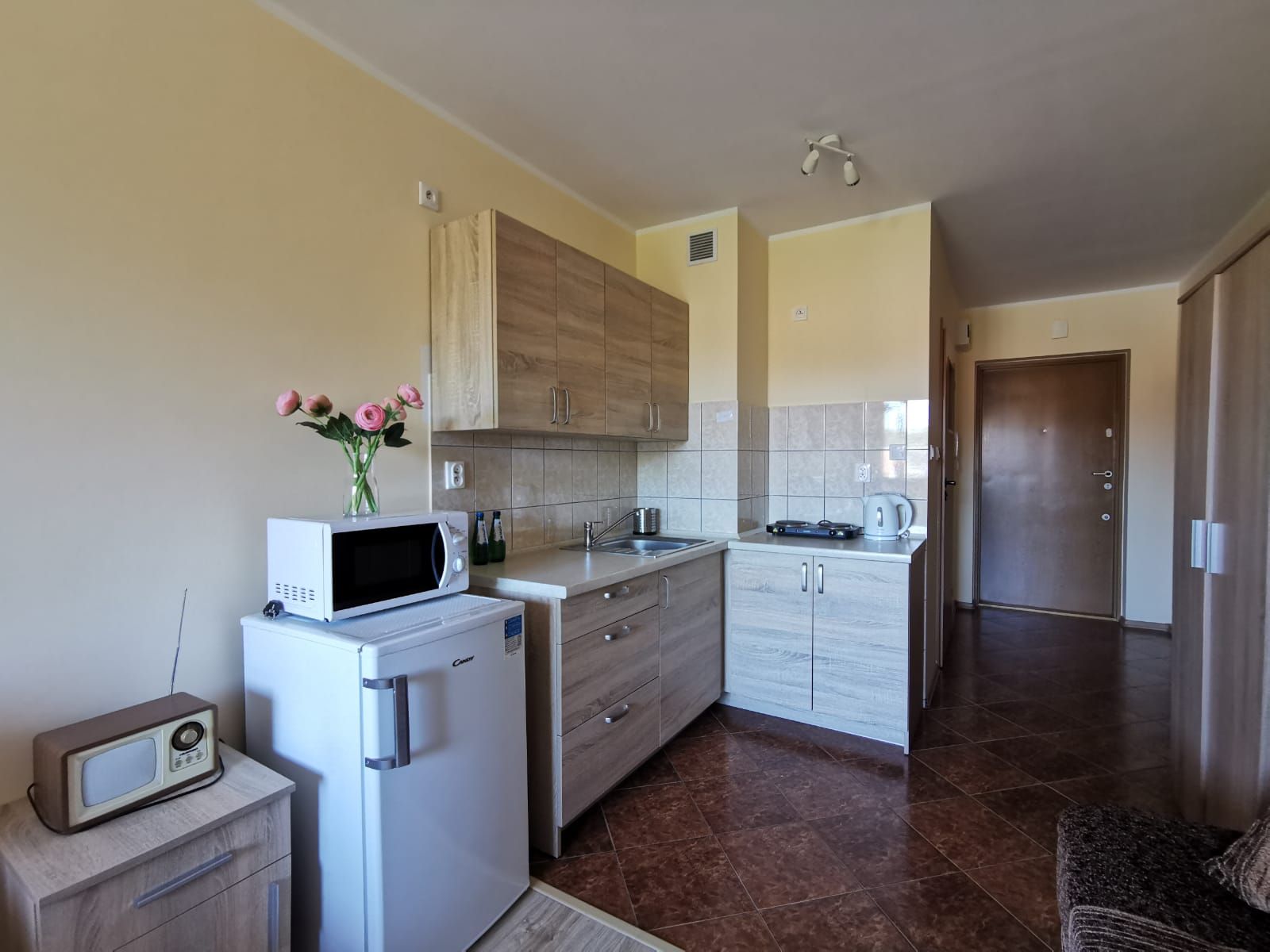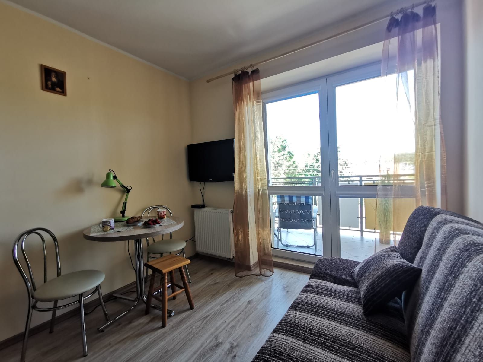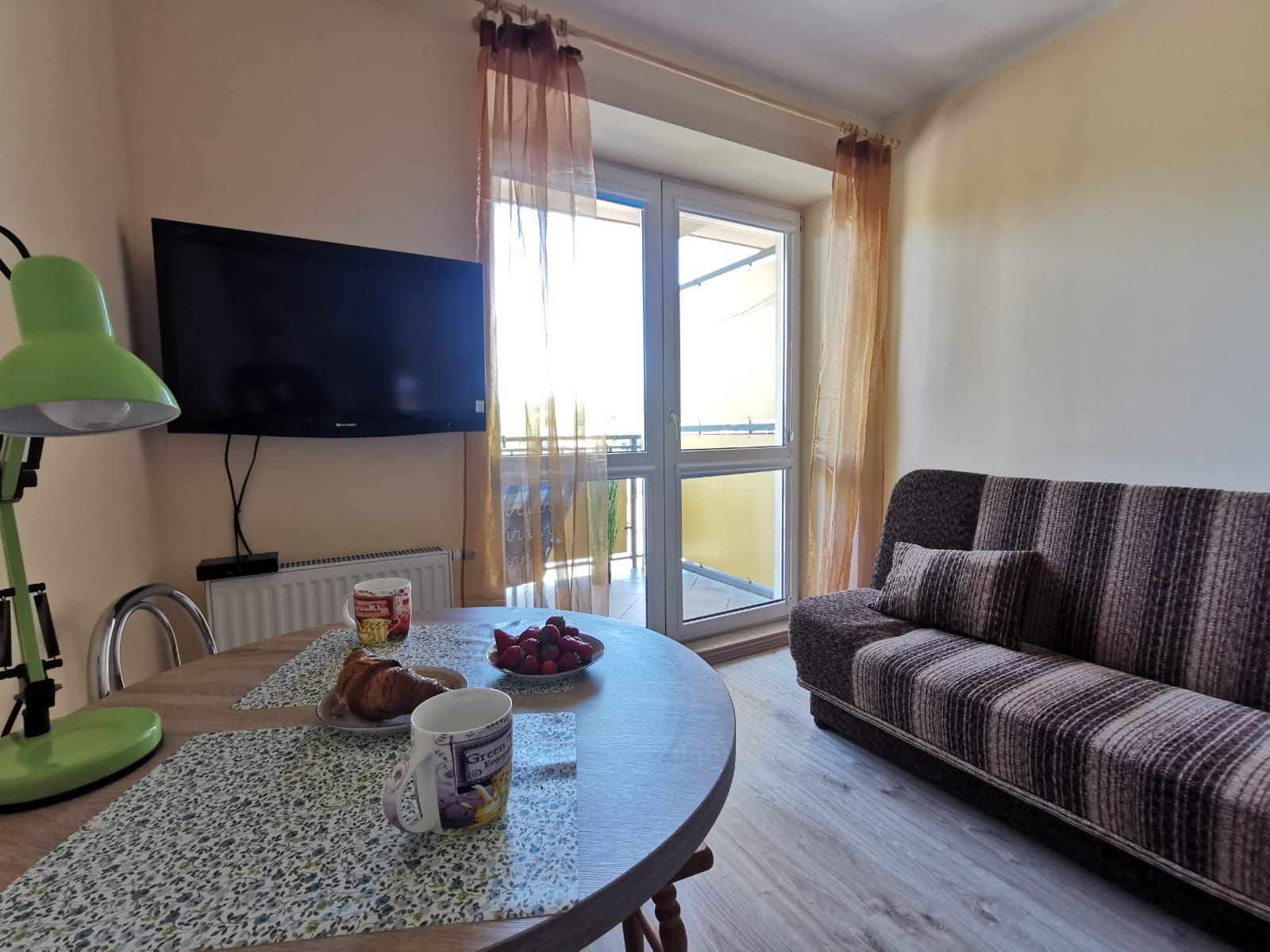 Apartament składa się z salonu sypialnianego wyposażonego w dwa rozkładane łóżka, które w zależności od potrzeb mogą pełnić funkcję miejsc do spania lub wygodnej strefy dziennej. Do dyspozycji gości jest także telewizor, dzięki czemu można zrelaksować się po dniu spędzonym na plaży lub spacerach po okolicy.
