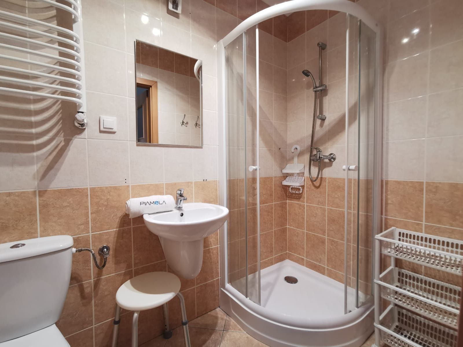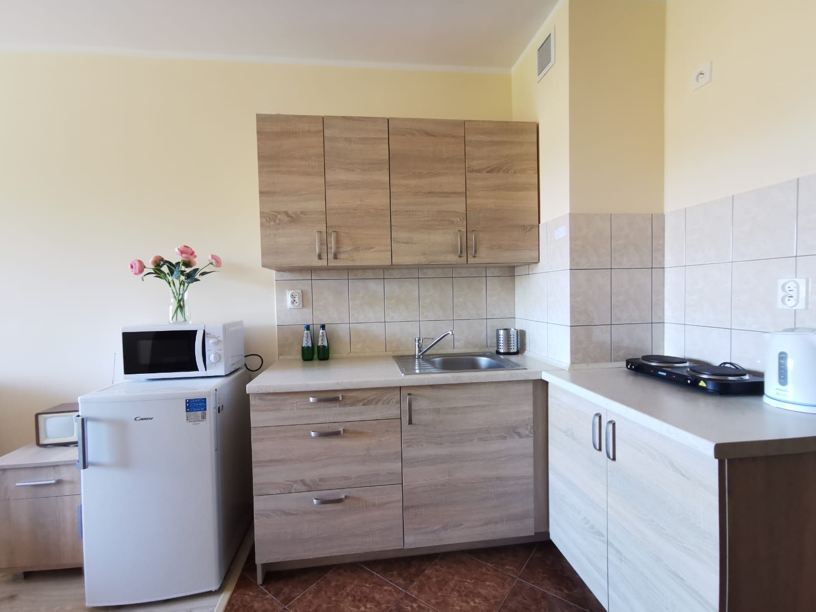 Aneks kuchenny został praktycznie urządzony i wyposażony we wszystko, co potrzebne do przygotowania posiłków — znajduje się tu lodówka, kuchenka mikrofalowa, płyta grzewcza oraz podstawowe naczynia i akcesoria kuchenne. W pełni wyposażona łazienka z prysznicem zapewnia wygodę i prywatność.