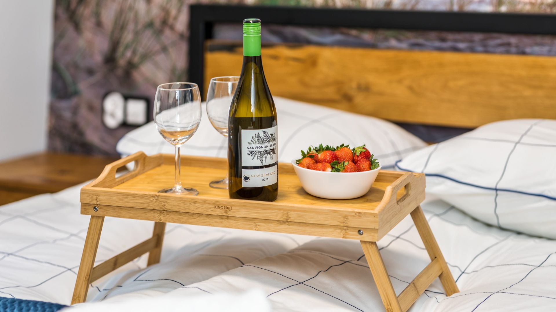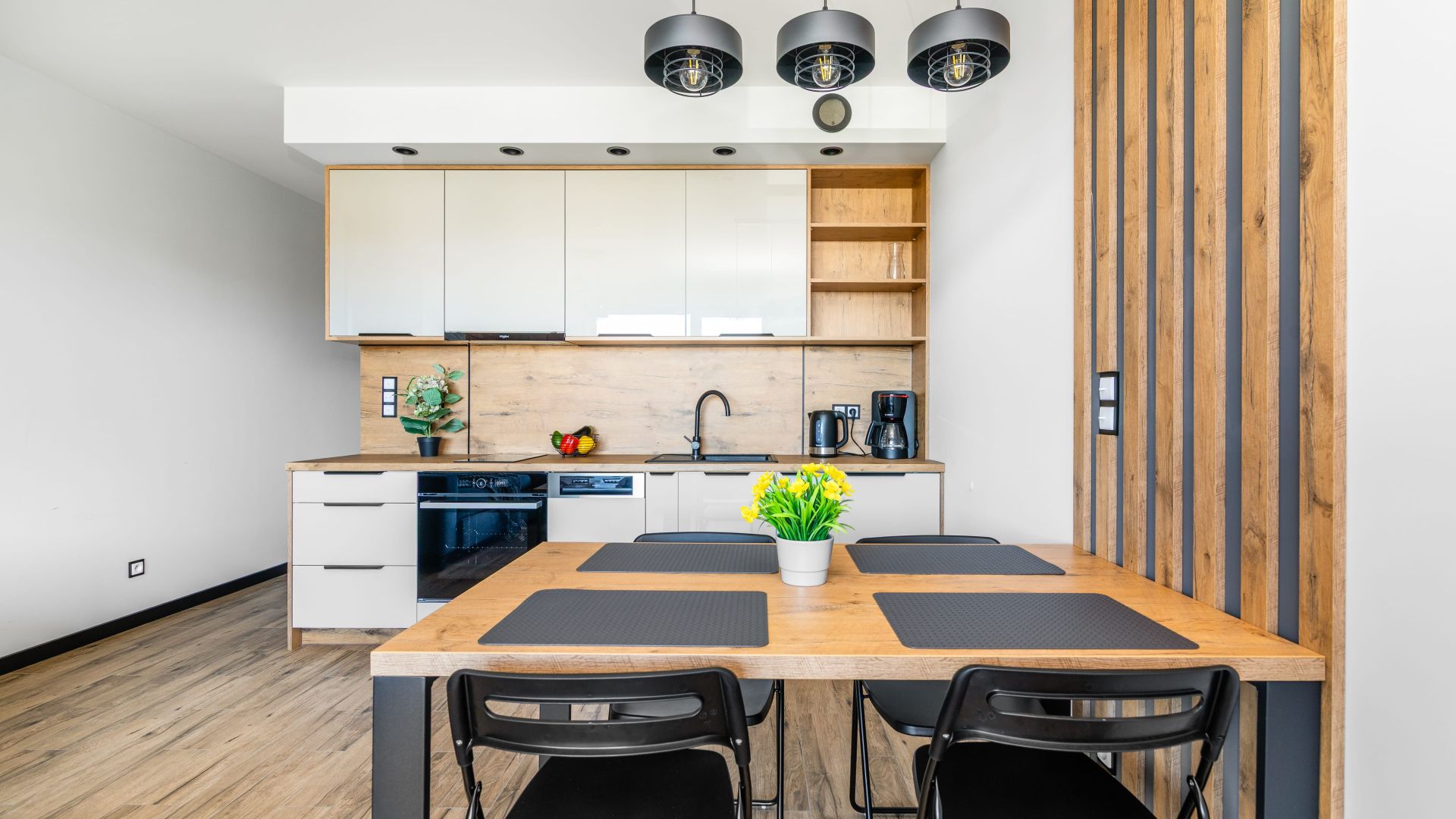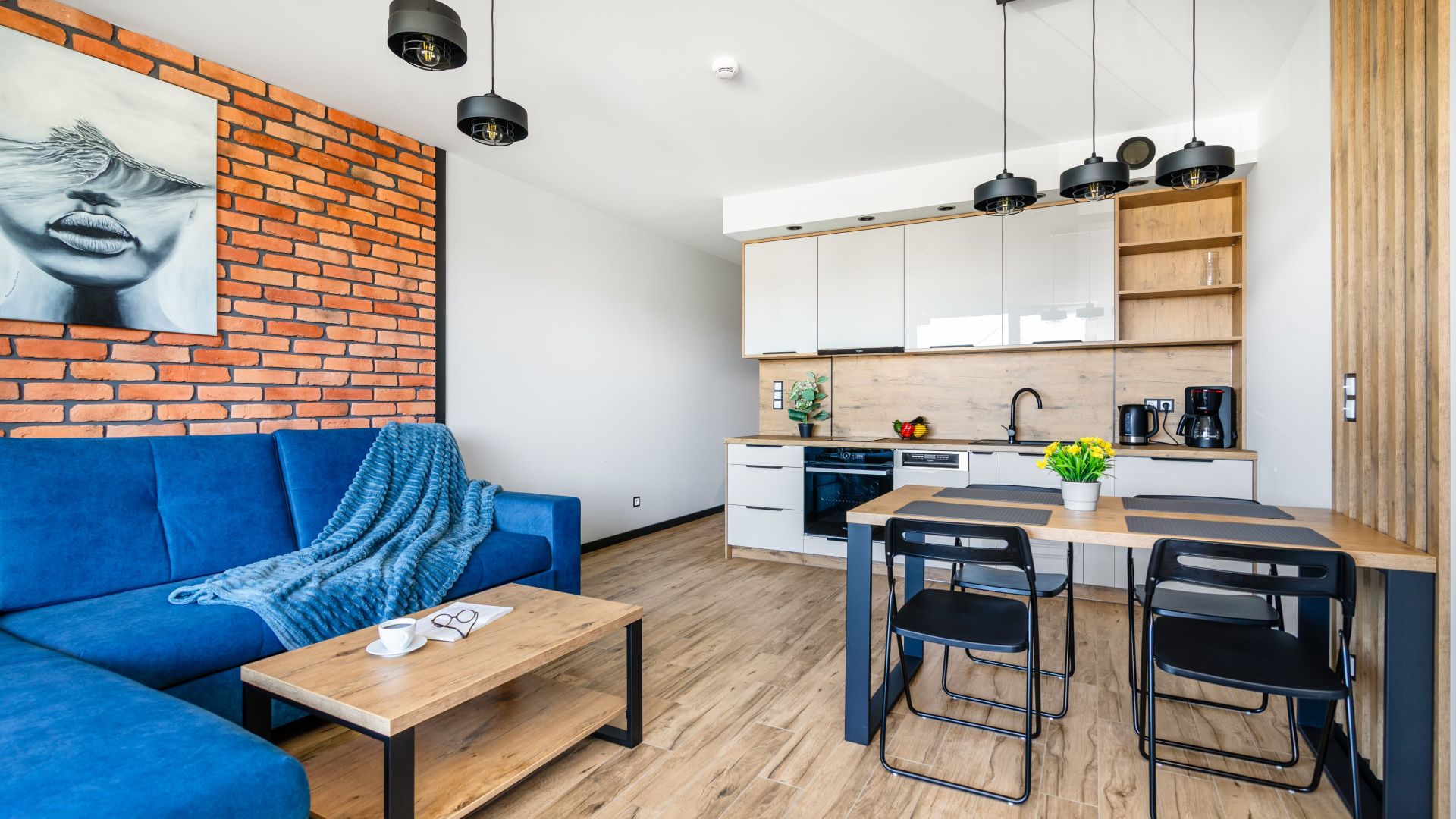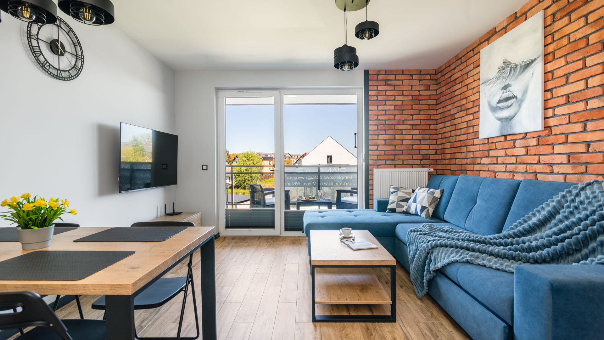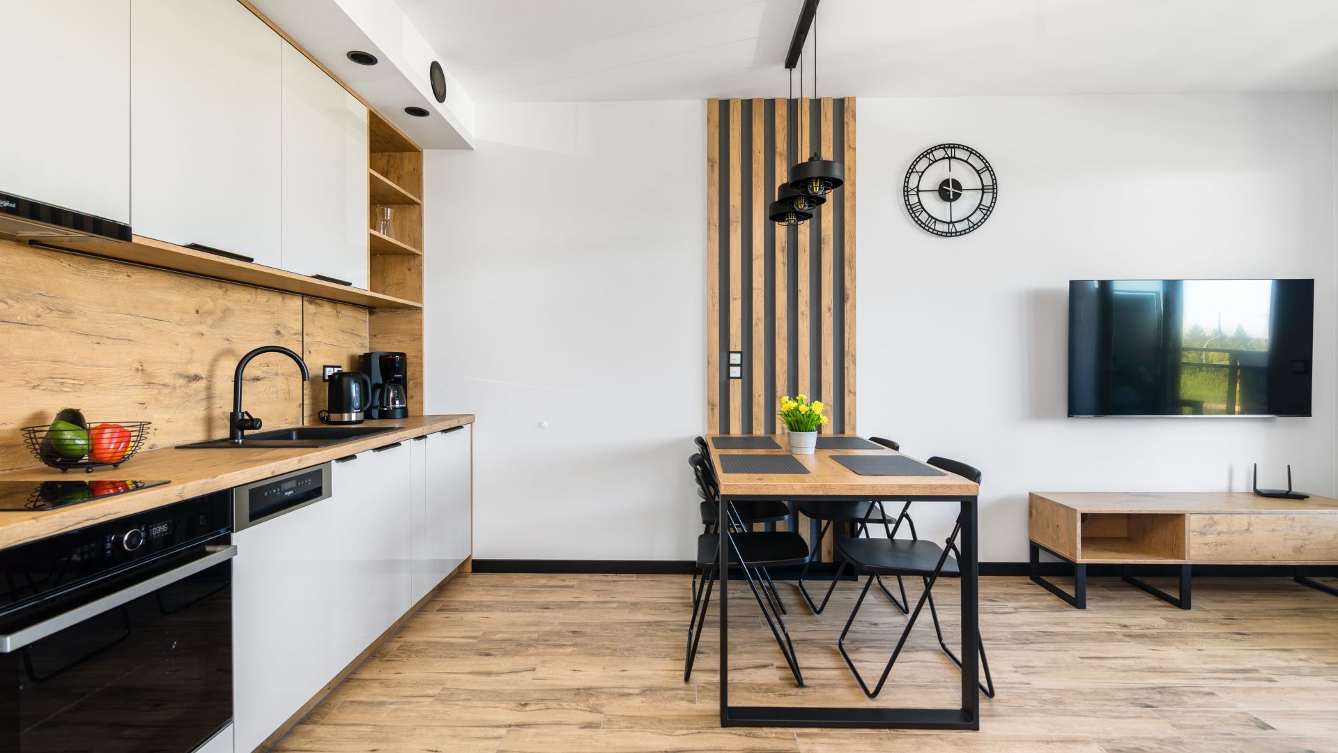 W salonie znajduje się wygodna, rozkładana sofa, idealna do relaksu po dniu pełnym wrażeń. Dodatkowo, do dyspozycji gości jest telewizor, który umili wieczory. Aneks kuchenny został wyposażony we wszystkie niezbędne akcesoria kuchenne, w tym lodówkę, czajnik, zmywarkę oraz piekarnik, co pozwala na przygotowanie smacznych posiłków.