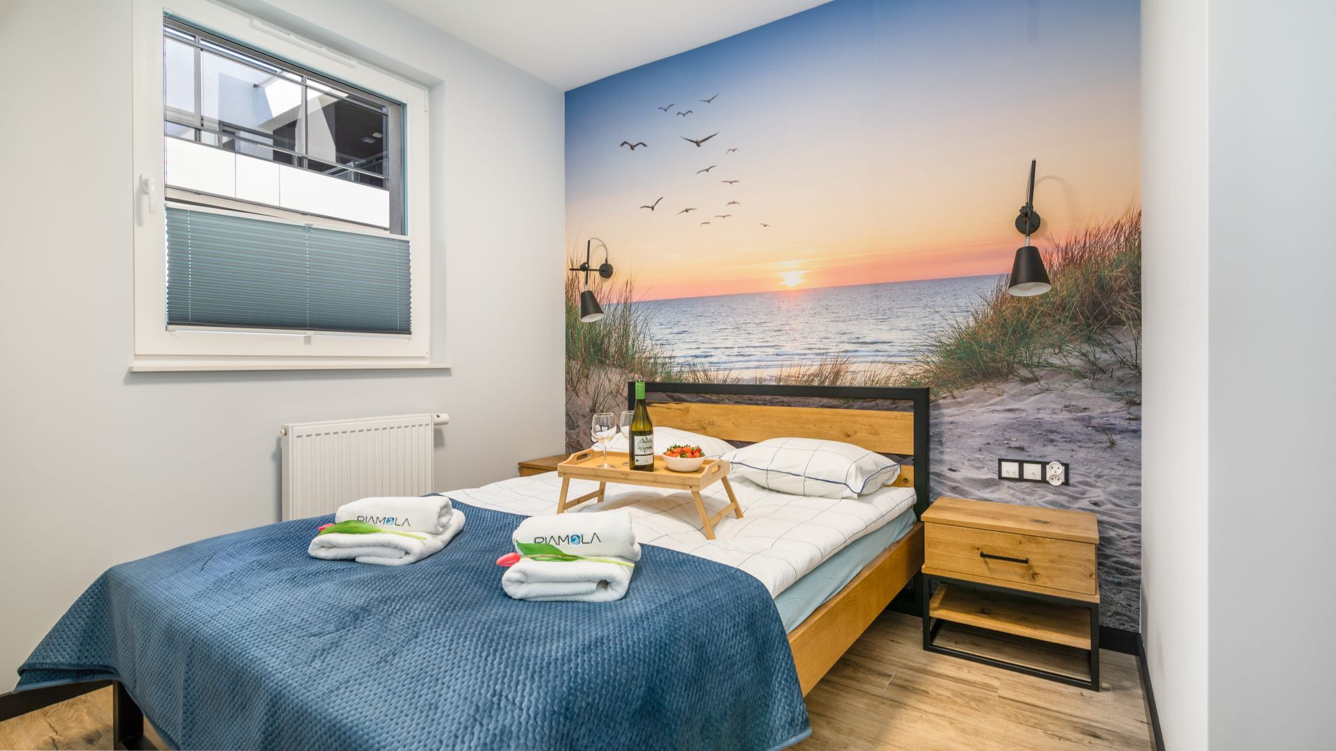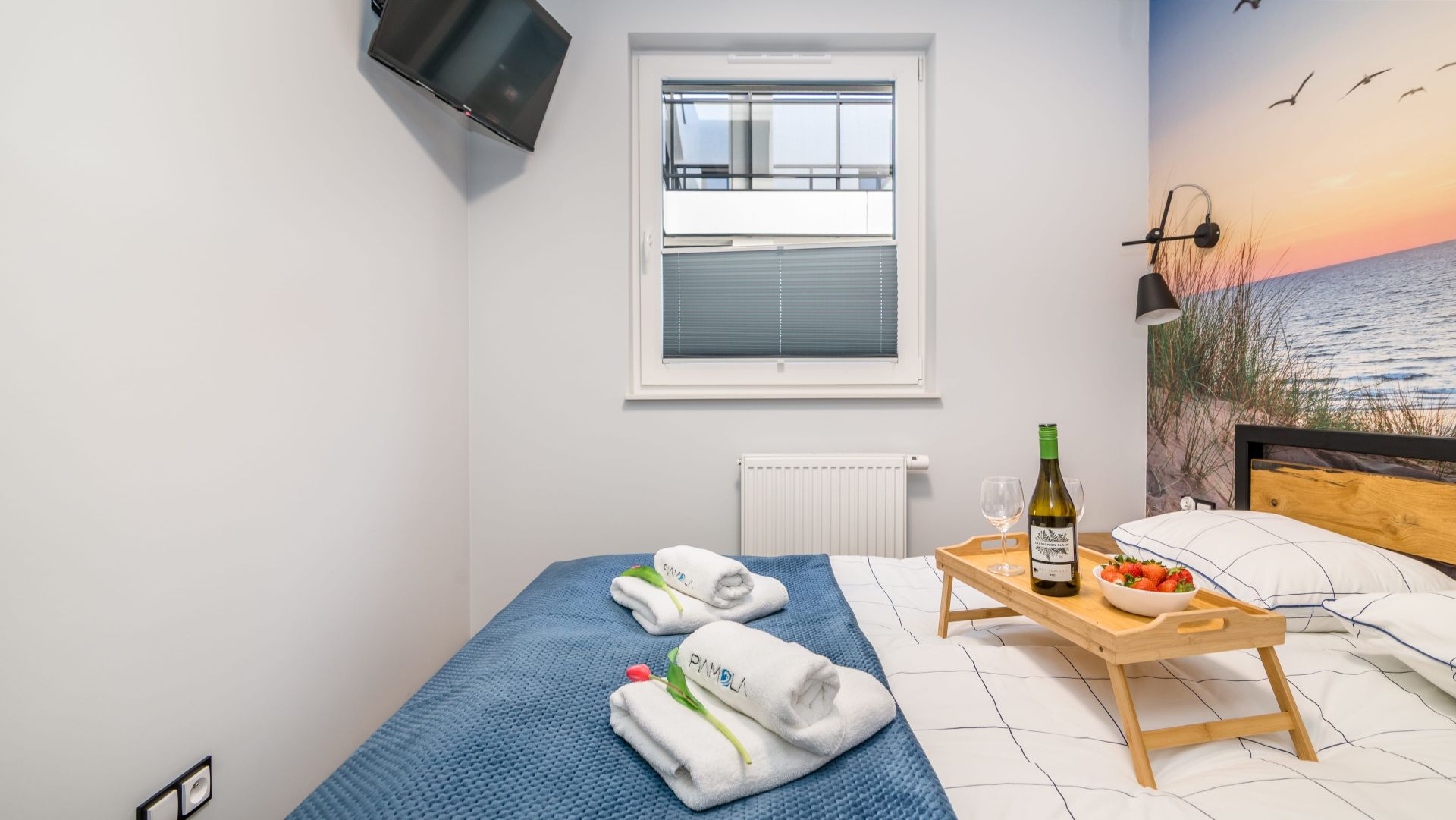 Sypialnia oferuje komfortowe łóżko małżeńskie oraz pojemną szafę, w której można przechowywać swoje rzeczy. Dodatkowo, w sypialni znajduje się telewizor, który pozwoli na relaks przed snem.
