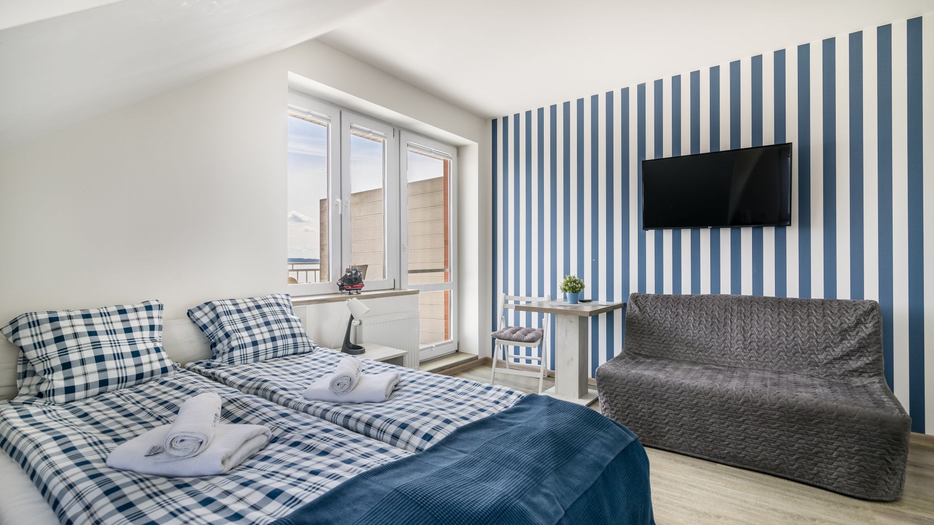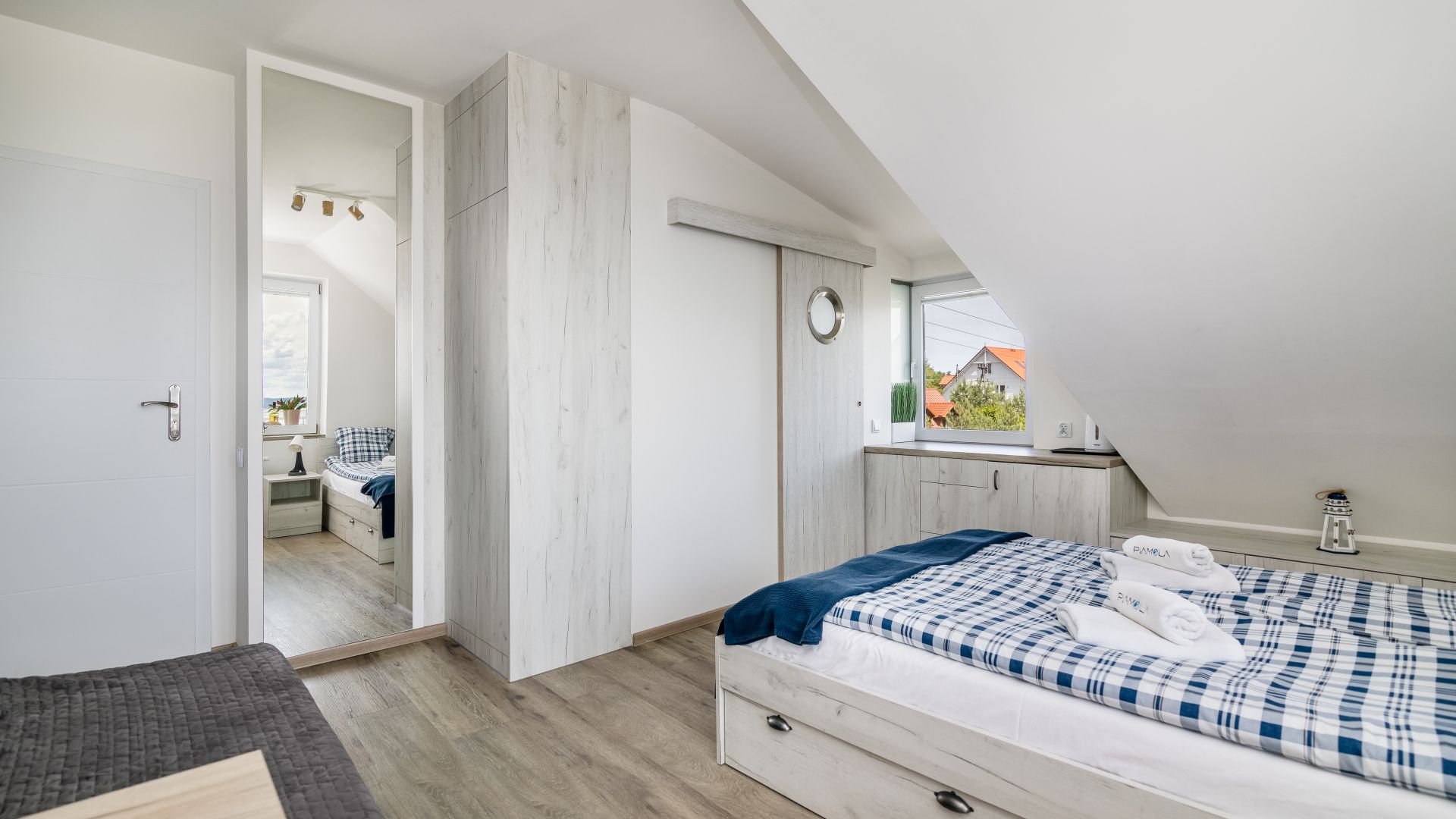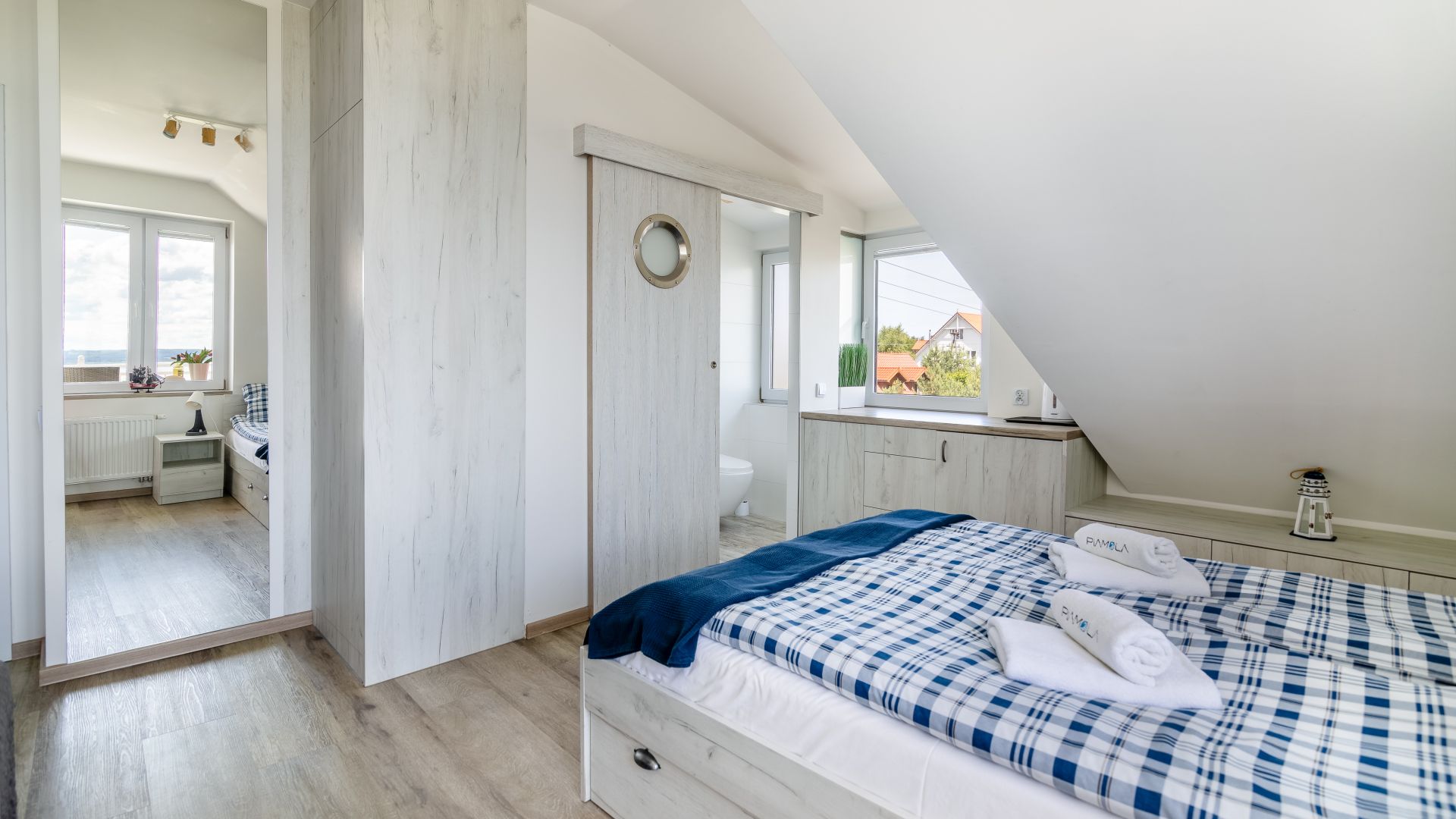 Nasz obiekt oferuje dwa przestronne apartamenty z dostępem do prywatnego ogródka oraz dodatkowo dysponuje ośmioma pokojami, które są elastycznie dostosowane do potrzeb różnej liczby osób - od samotnych podróżników po duże rodziny.Oferta obejmuje cztery pokoje o powierzchni 25m2,które przeznaczone są dla maksymalnie czterech osób. Wszystkie pokoje są wyposażone w łazienkę, telewizor oraz niezbędne akcesoria kuchenne, w tym czajnik elektryczny, co pozwala na przygotowanie prostych posiłków. Unikalny charakter każdego pokoju podkreśla marynistyczny styl, który łączy w sobie elementy historyczne z nowoczesnymi, tworząc niepowtarzalną atmosferę. Dodatkowym atutem tych pokoi jest dostęp do balkonu, z którego rozpościera się malowniczy widok na Zalew Wiślany, idealny do porannego podziwiania wschodu słońca lub wieczornego relaksu.