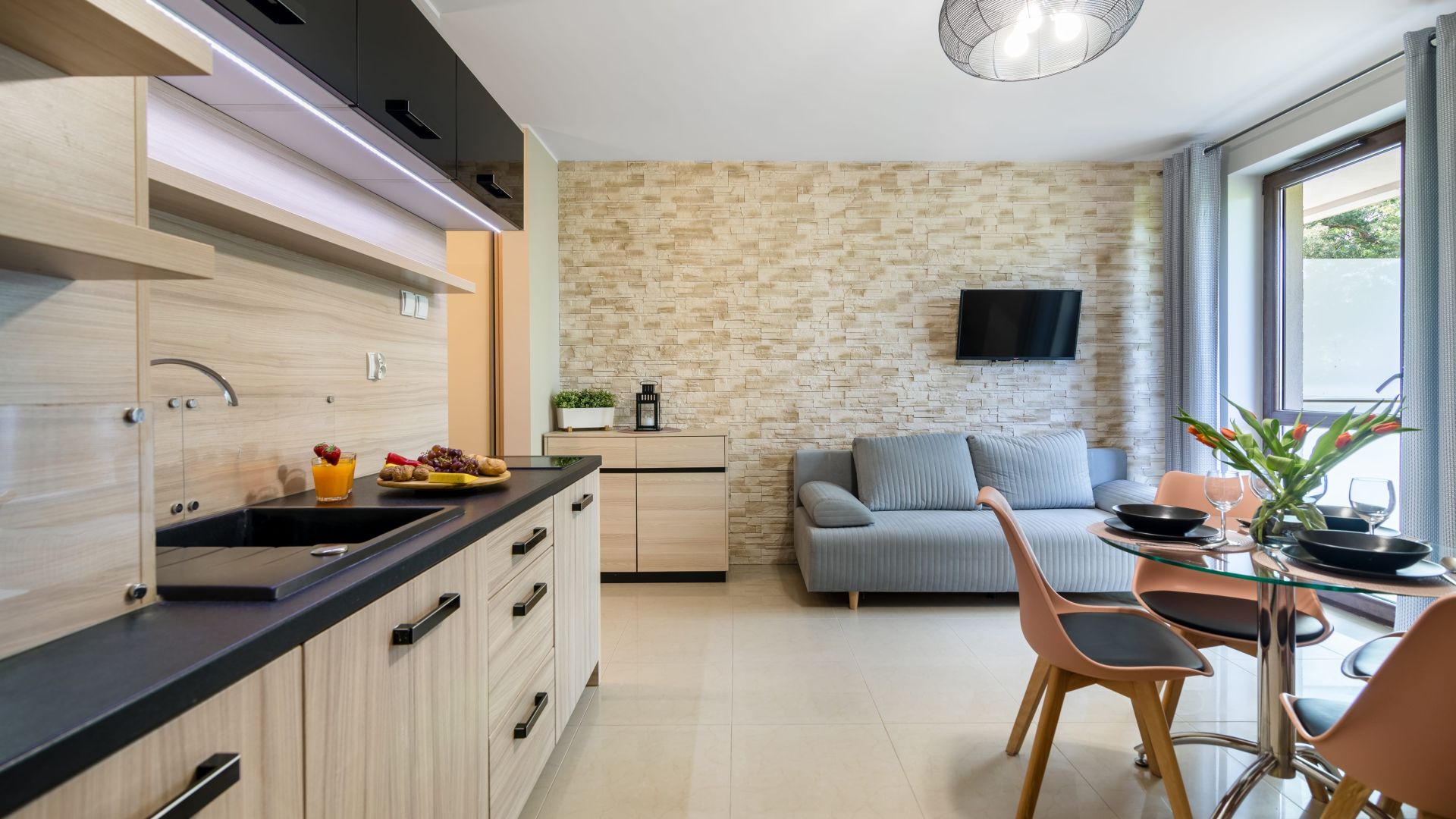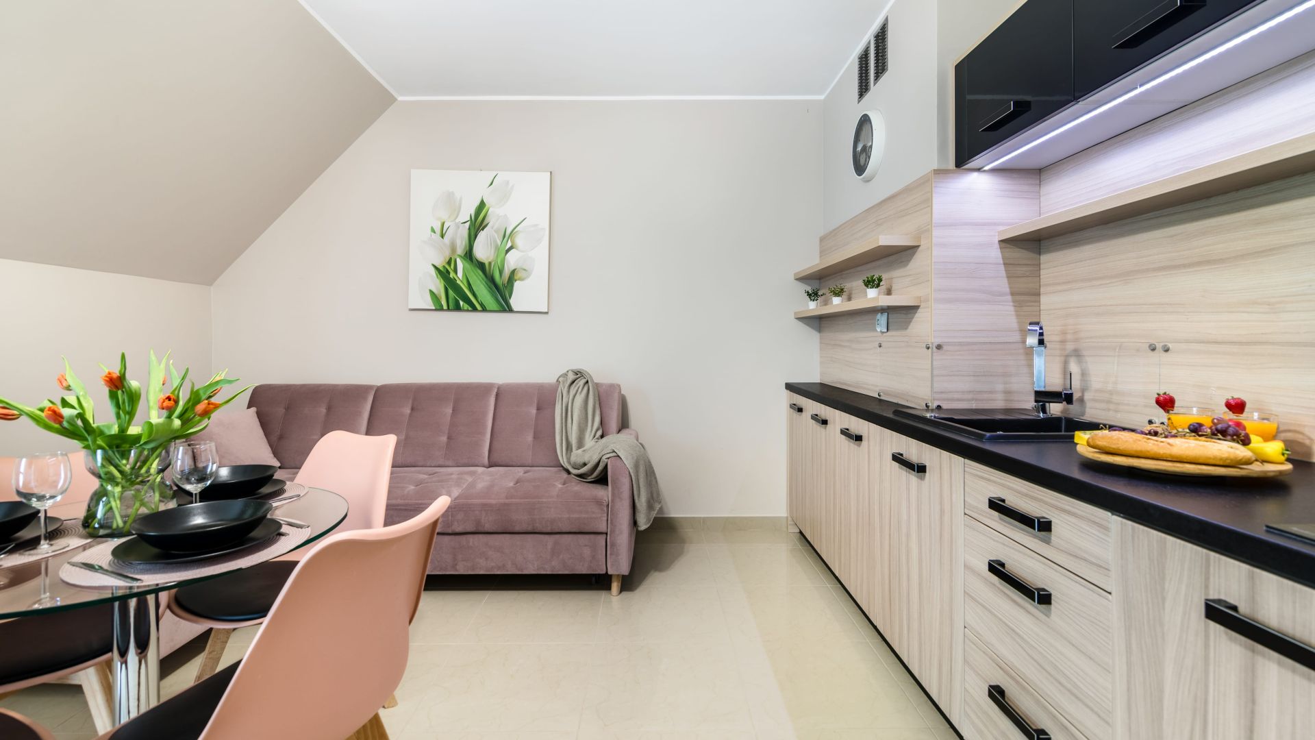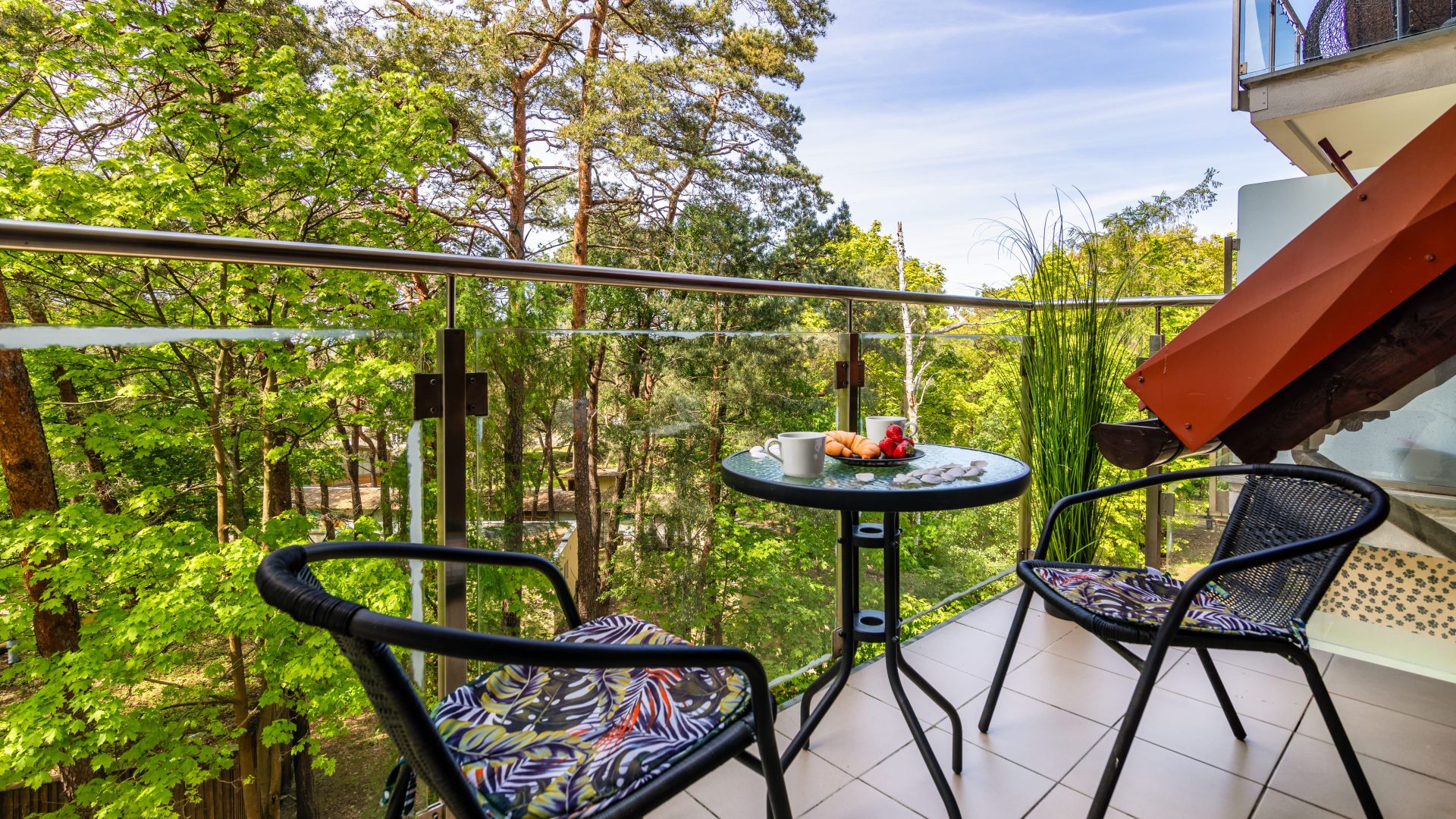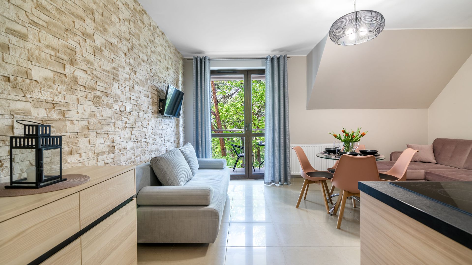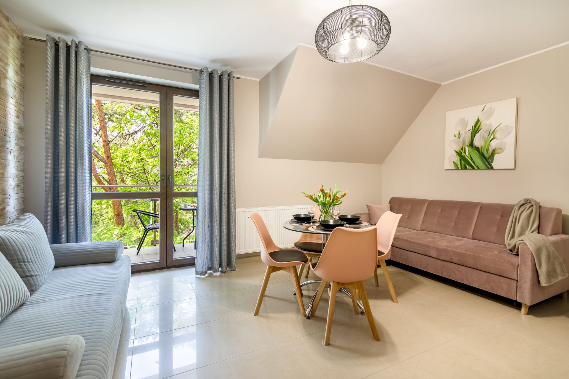 Apartament oferuje dwie wygodne sofy rozkładane, które zapewnią komfortowy sen po dniu pełnym wrażeń. W salonie znajduje się telewizor z dostępem do Wi-Fi, co umożliwia oglądanie ulubionych programów lub przeglądanie internetu. Przytulny kącik jadalny z stołem i krzesłami to doskonałe miejsce na wspólne posiłki.Apartament posiada balkon z widokiem na las, co dodaje uroku i pozwala na relaks w otoczeniu natury. Na tym przytulnym balkonie znajdują się meble ogrodowe, gdzie goście mogą cieszyć się świeżym powietrzem, kawą lub książką.