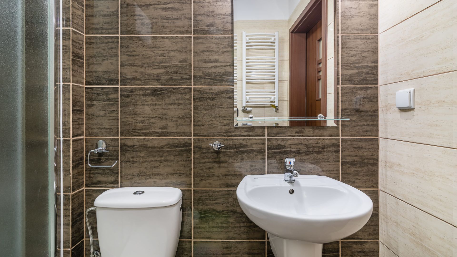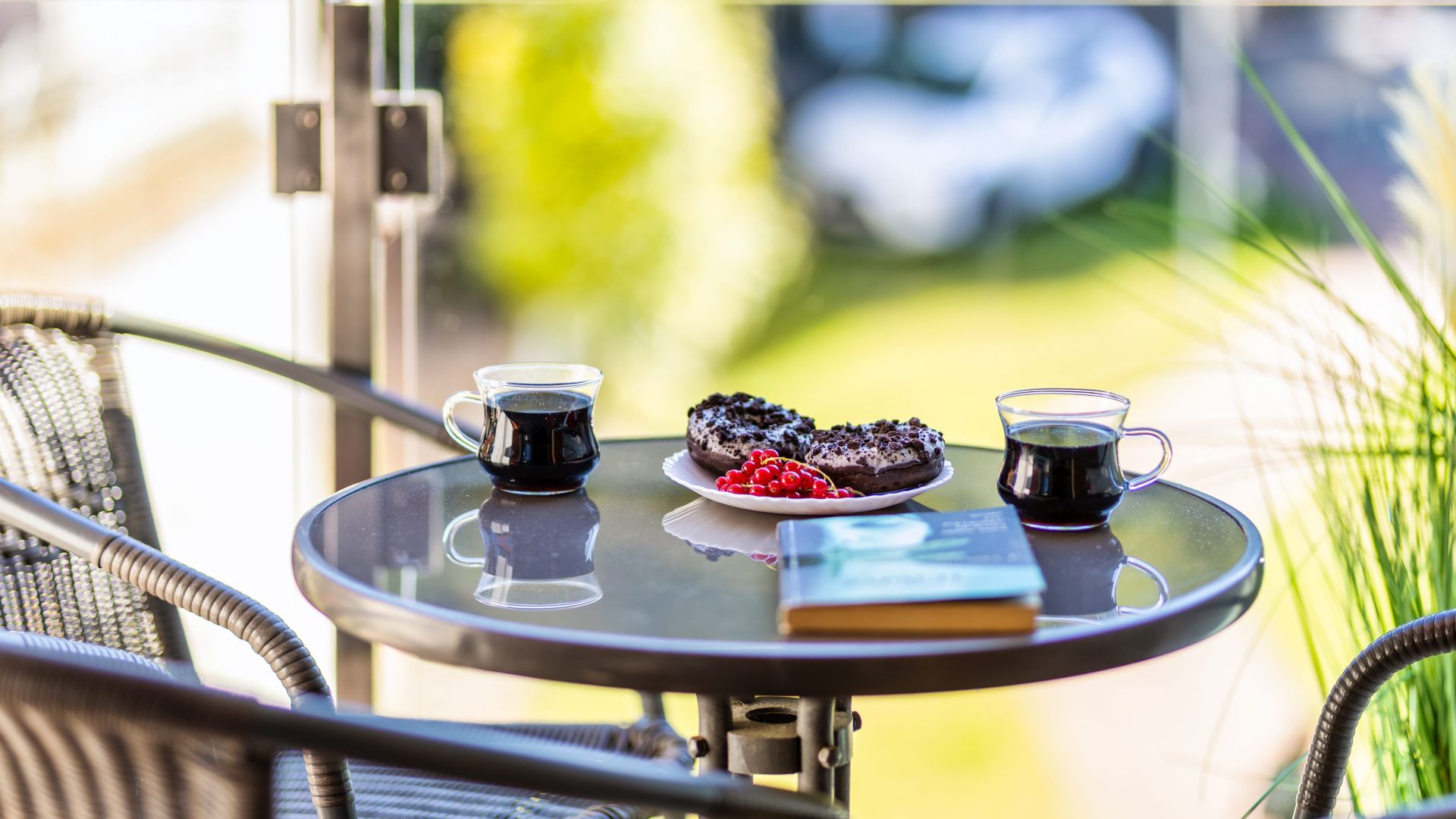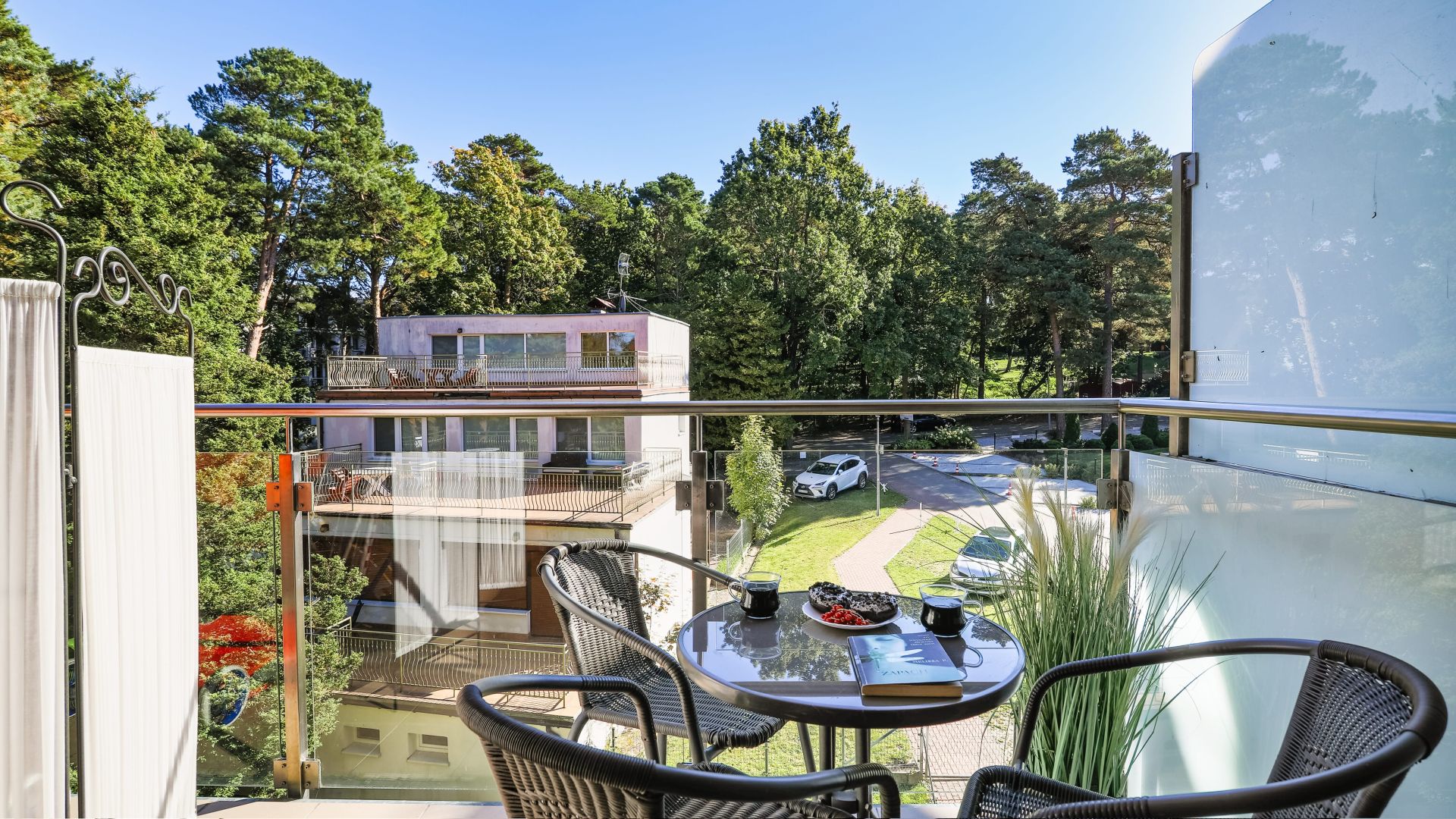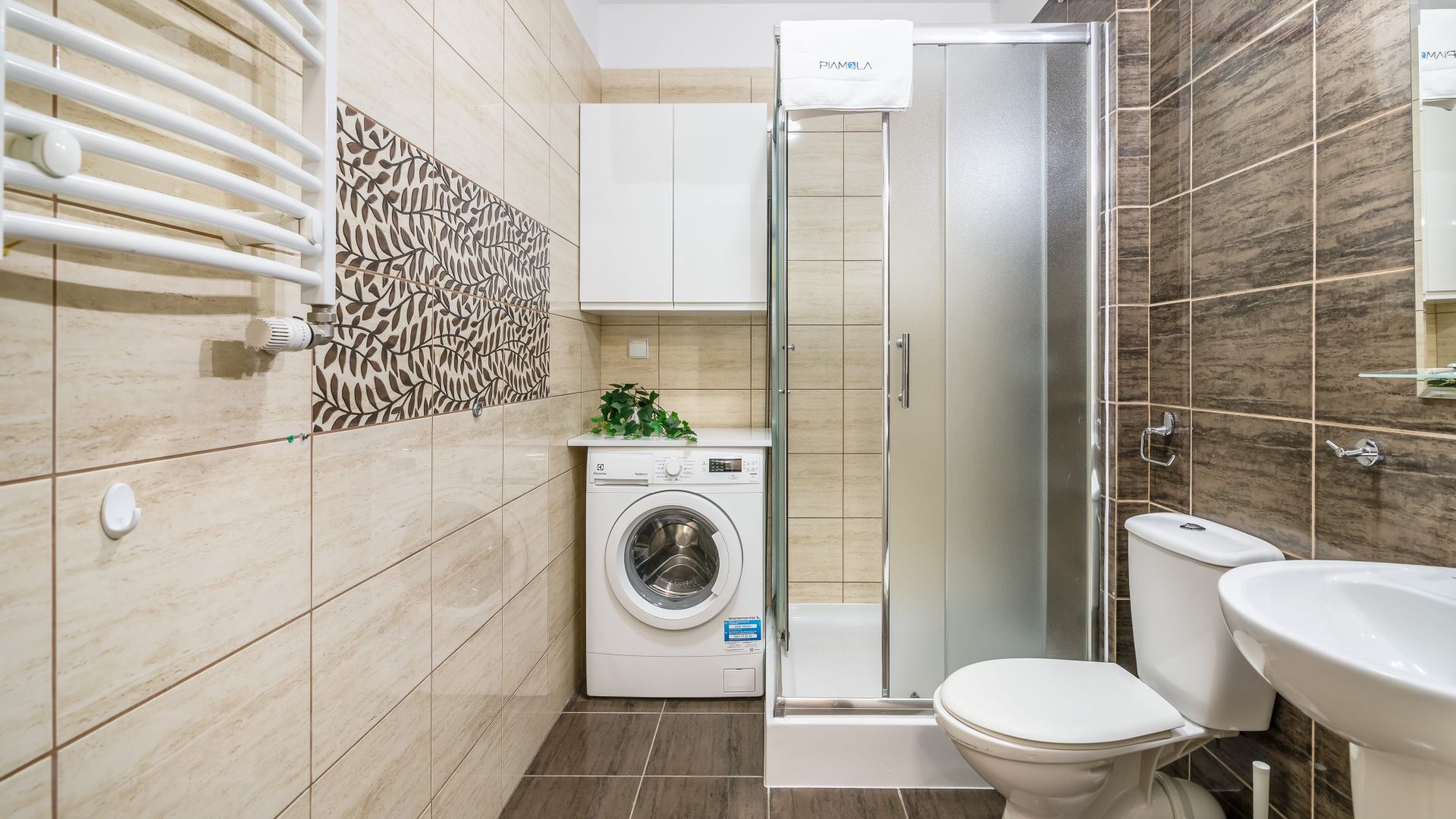 Łazienka posiada pralkę oraz niezbędne akcesoria, takie jak suszarka do włosów i komplet ręczników. Z salonu jest wejście na balkon, na którym znajdują się meble ogrodowe, idealne do relaksu na świeżym powietrzu.