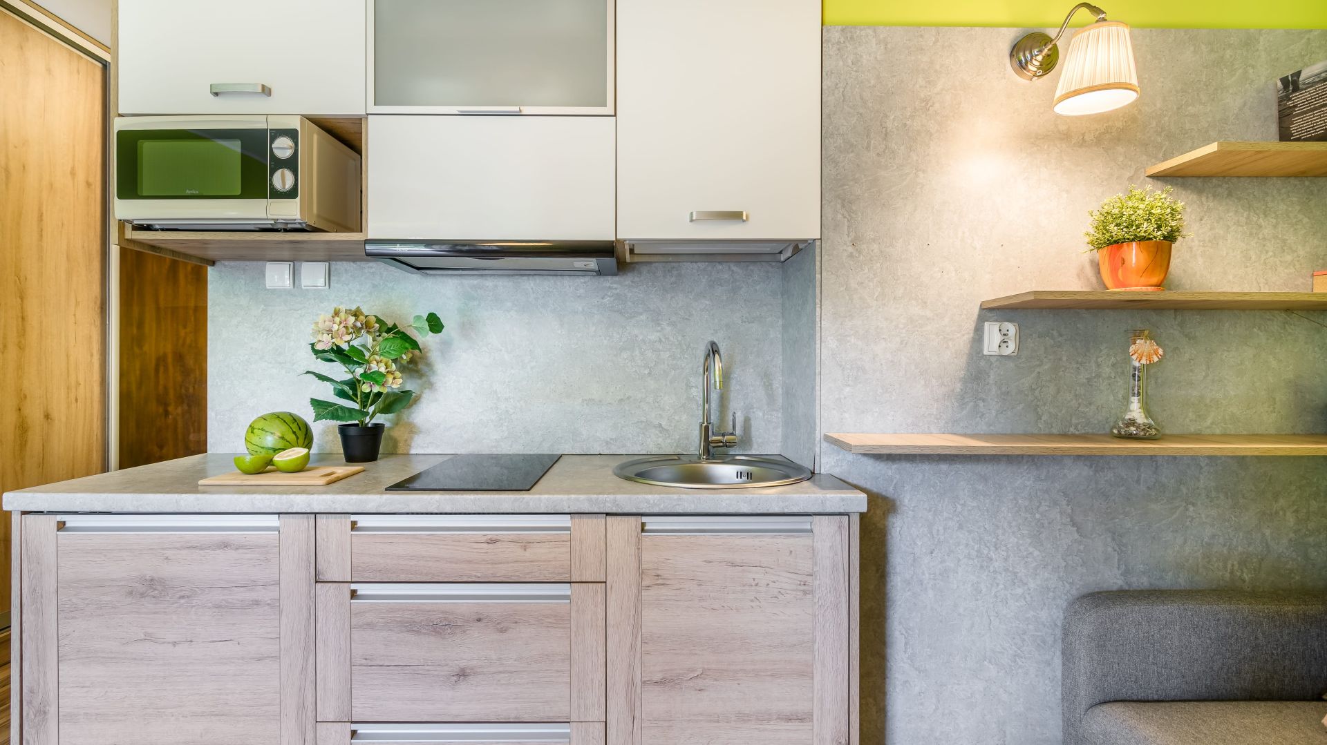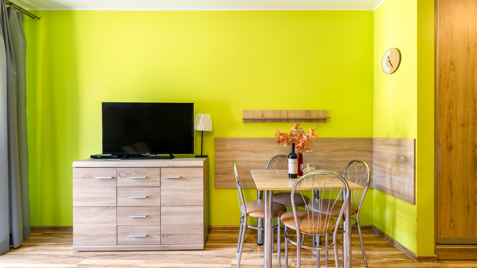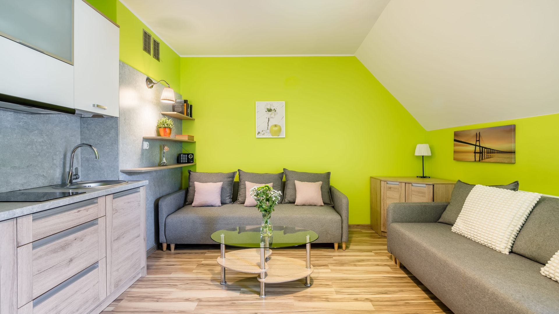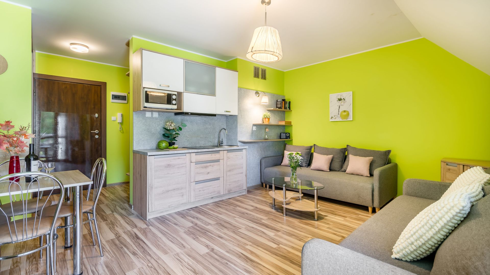 W skład apartamentu wchodzi przytulny salon z aneksem kuchennym. Kuchnia wyposażona jest w najpotrzebniejsze rzeczy, takie jak czajnik elektryczny, mikrofalówka oraz podstawowe przybory kuchenne niezbędne do przygotowywania posiłków. W salonie znajduje się stół jadalniany oraz stoliczek kawowy. Dwie sofy są rozkładane, dzięki czemu można na nich nocować.